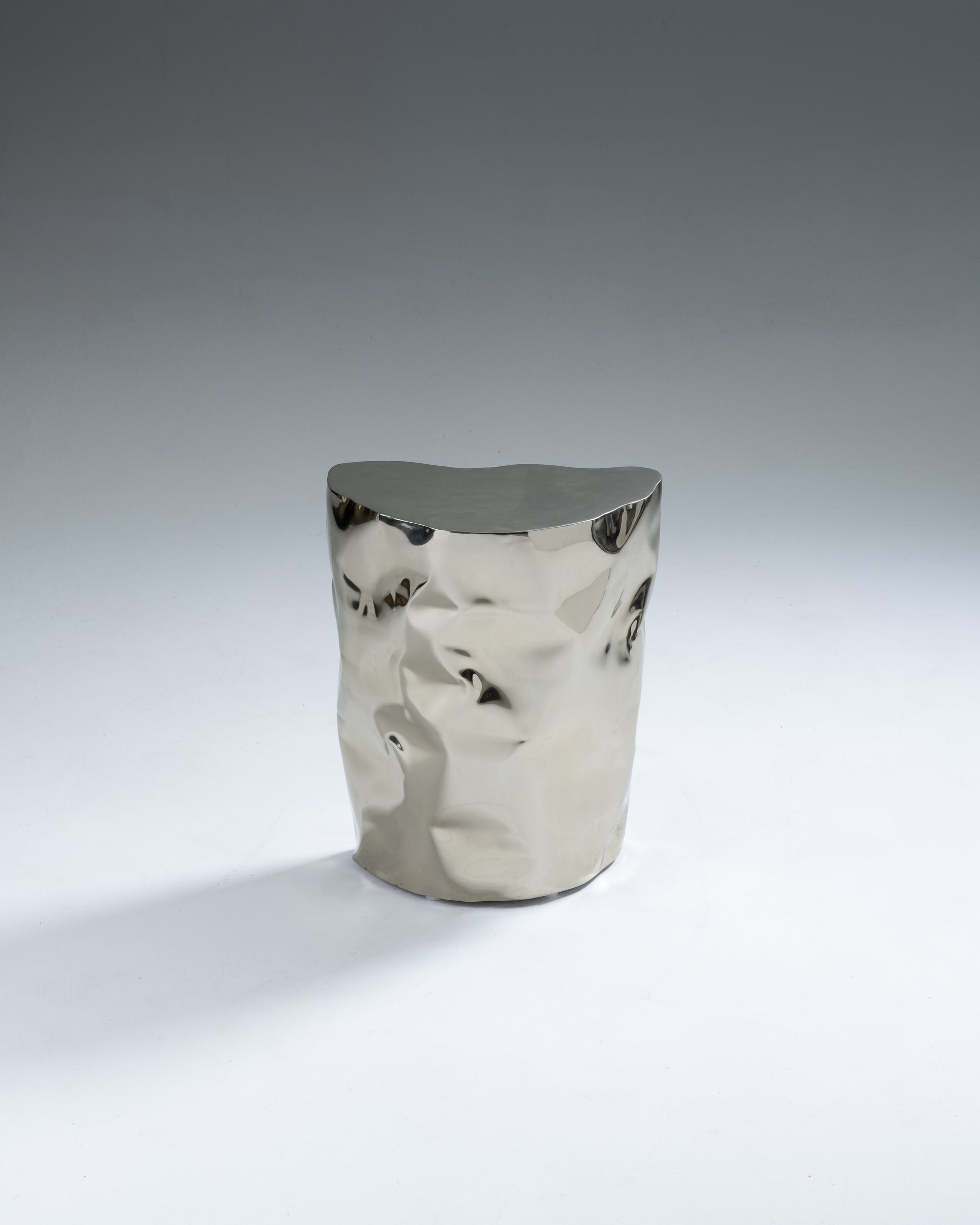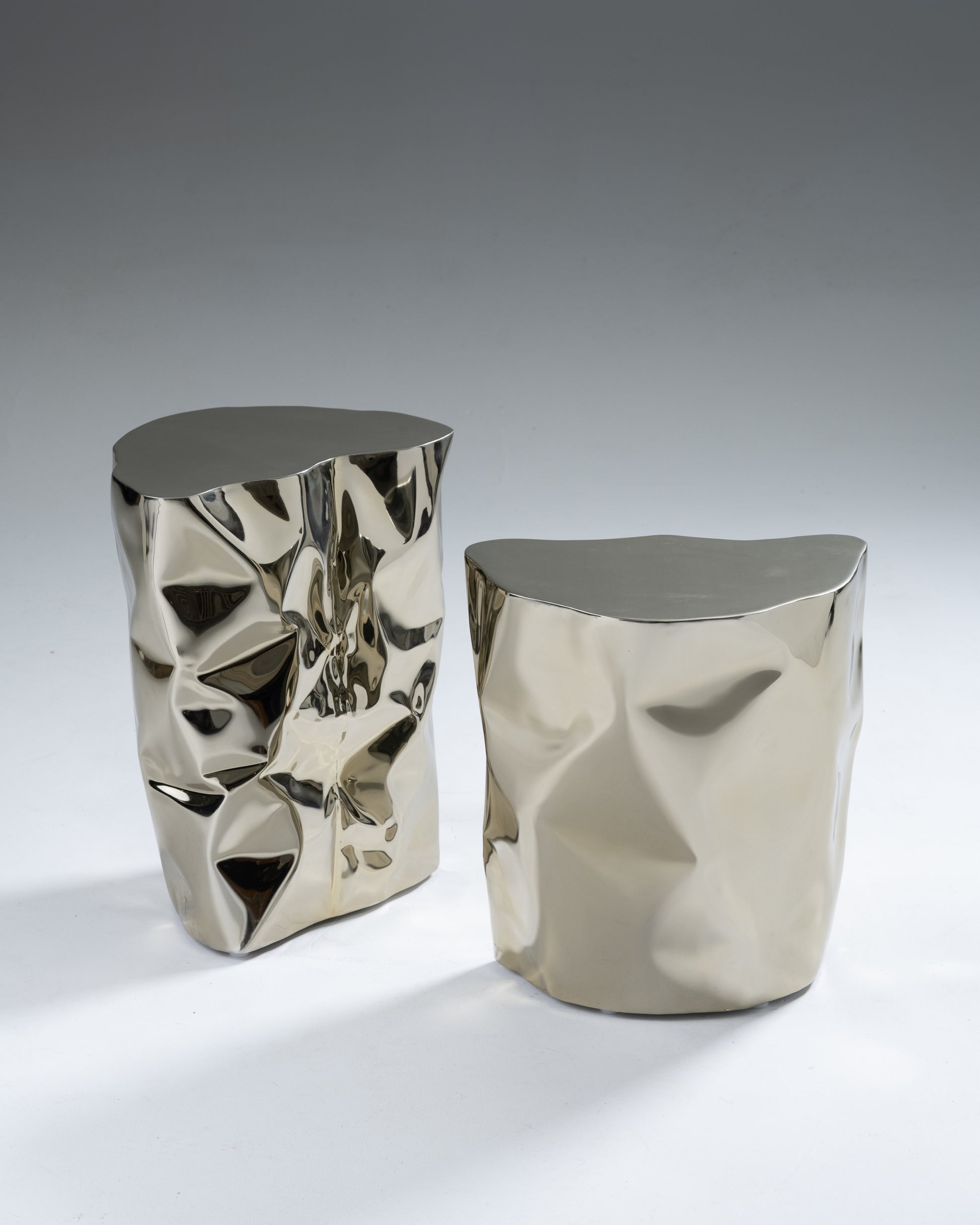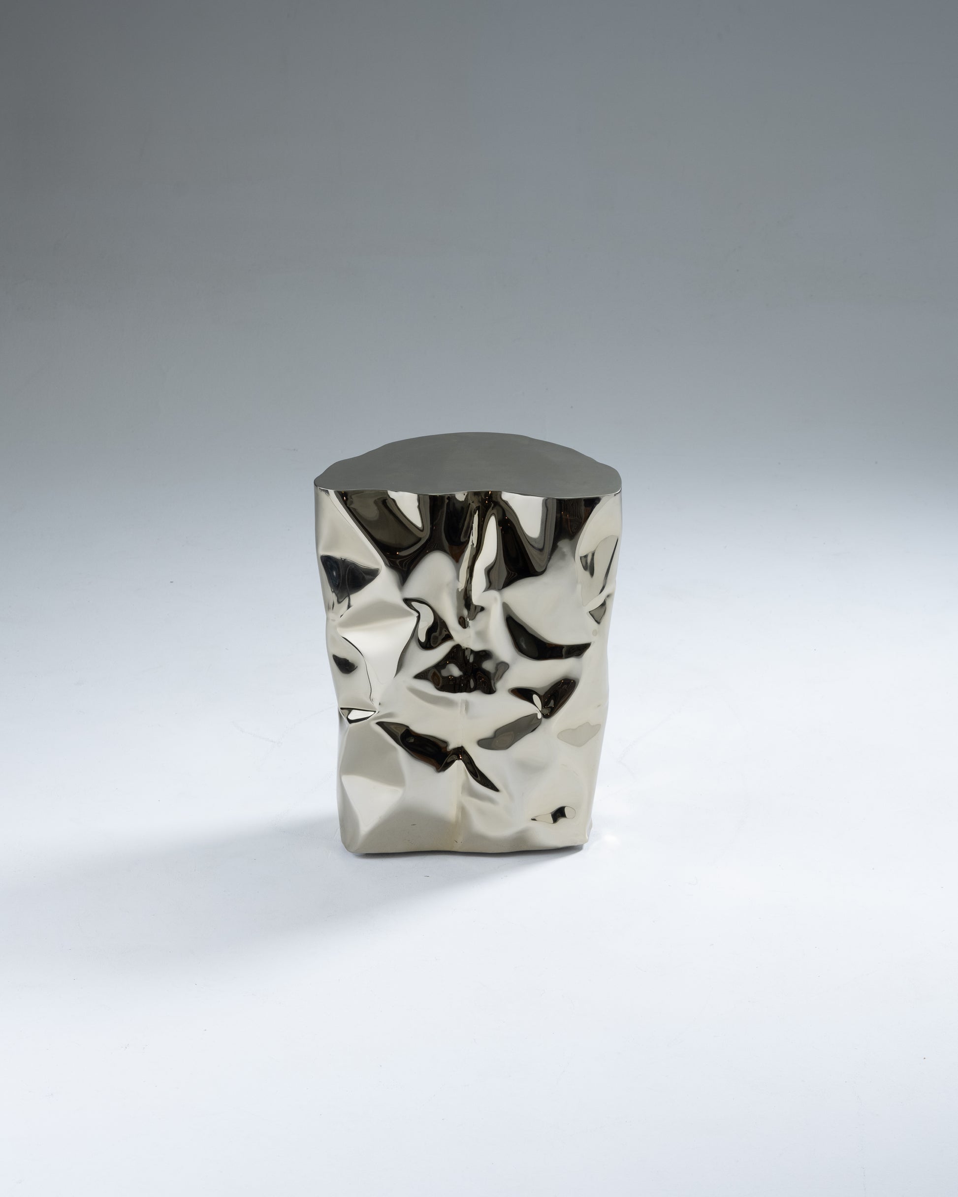 "Grand Canyon" side table by Nitush-Aroosh. Composed of two polished metal blocks with a champagne-colored mirror finish.