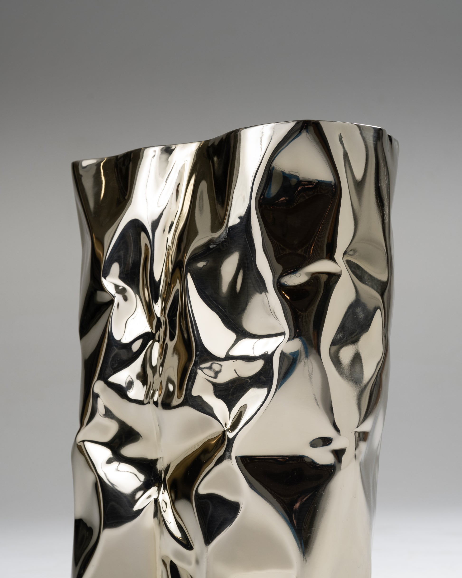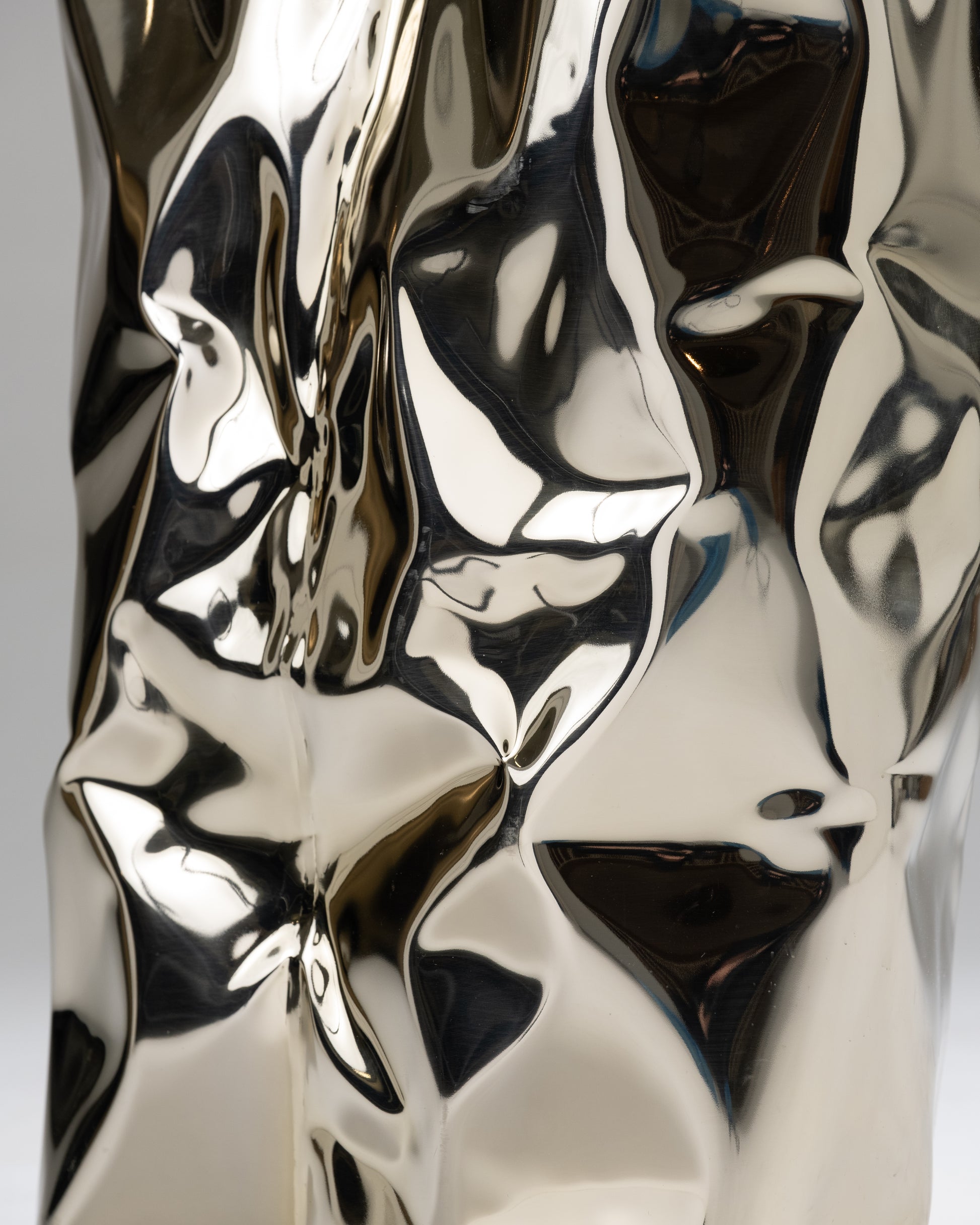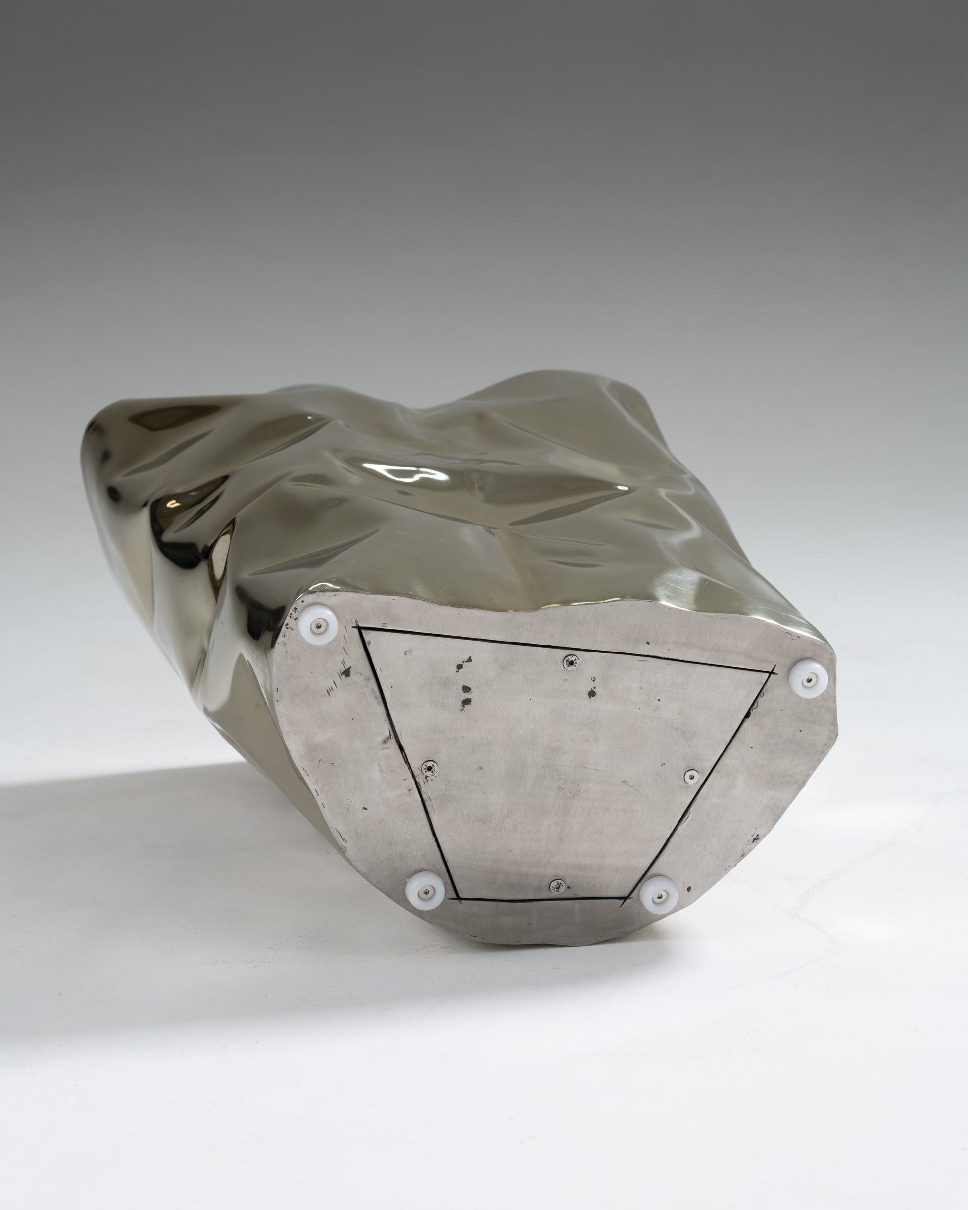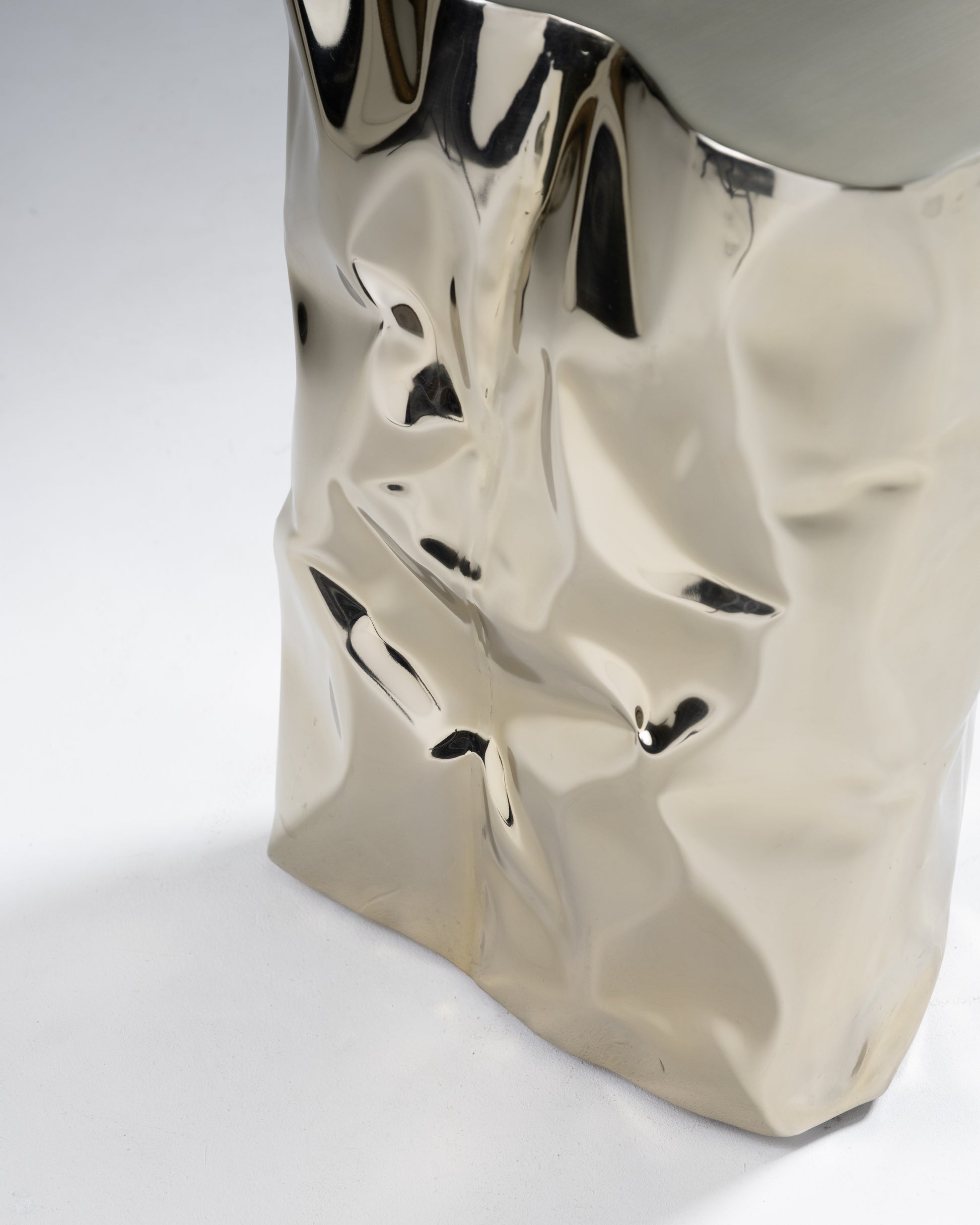 "Grand Canyon" side table by Nitush-Aroosh. Composed of two polished metal blocks with a champagne-colored mirror finish.