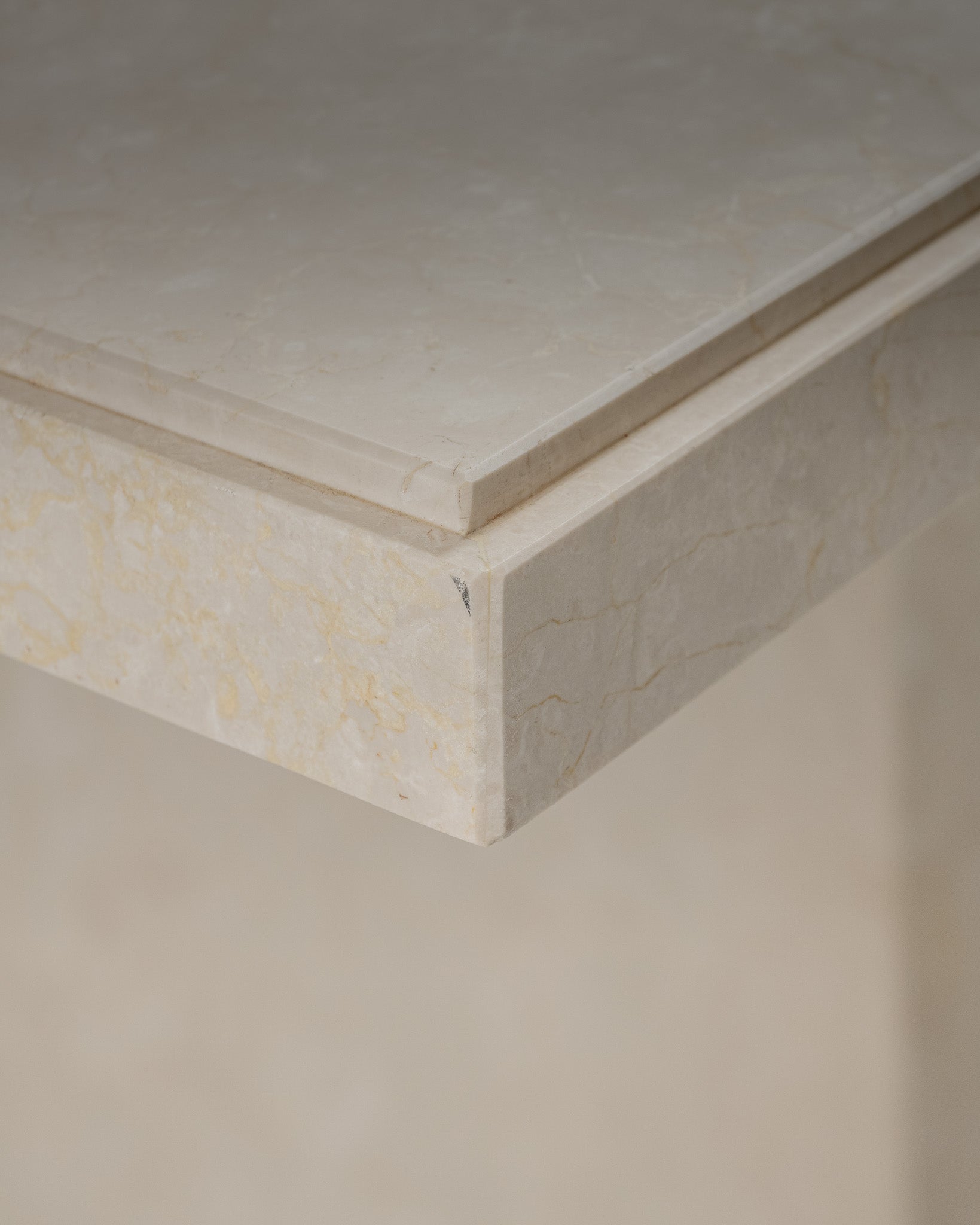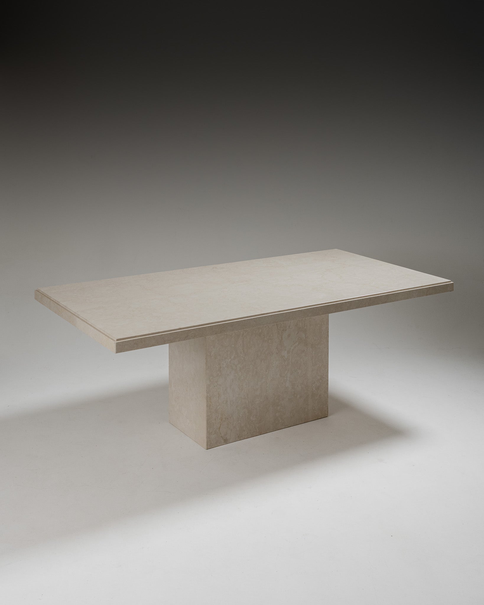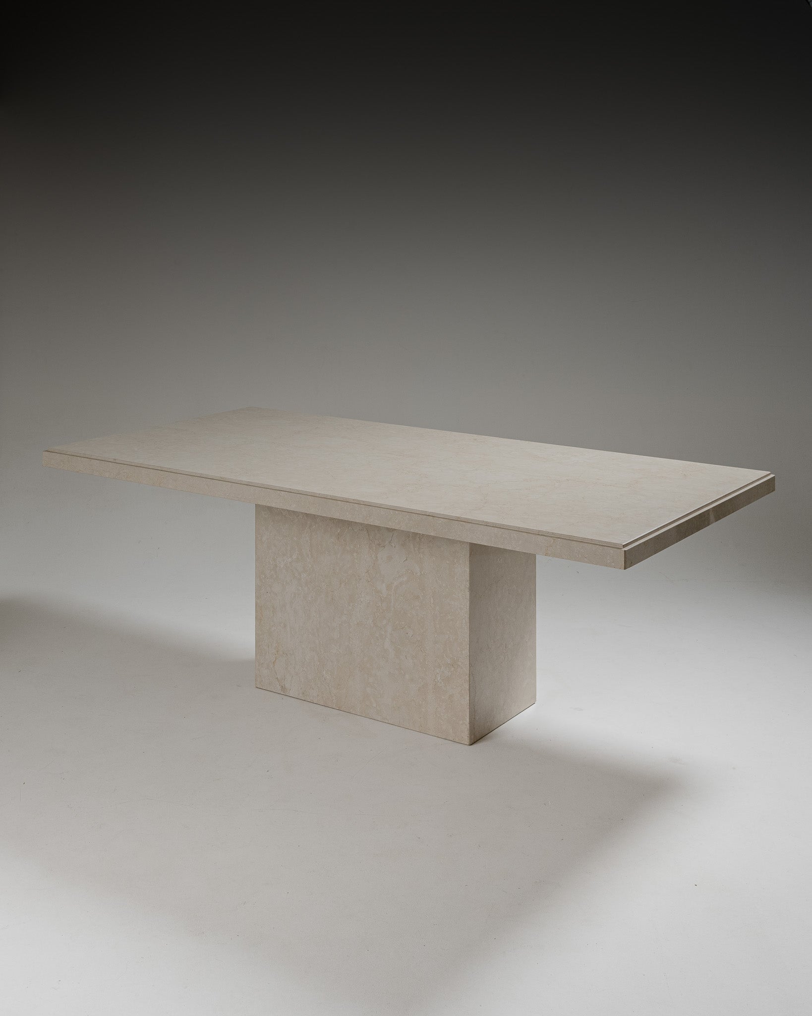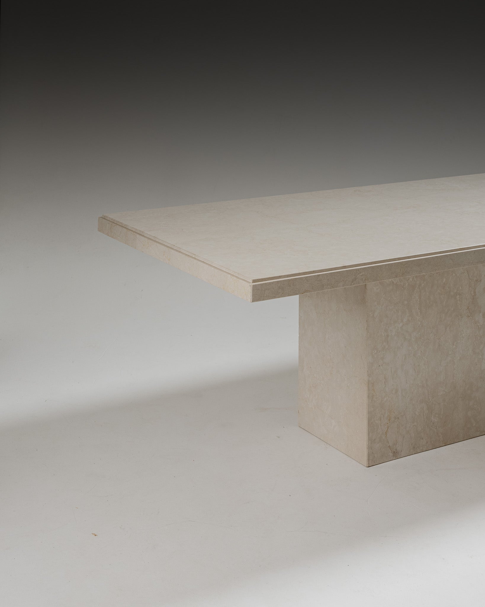 Large travertine dining table, in the style of 1980s designs. The rectangular top rests on a monolithic central base, also in travertine . The entire table can be detached from the base for easier transport.