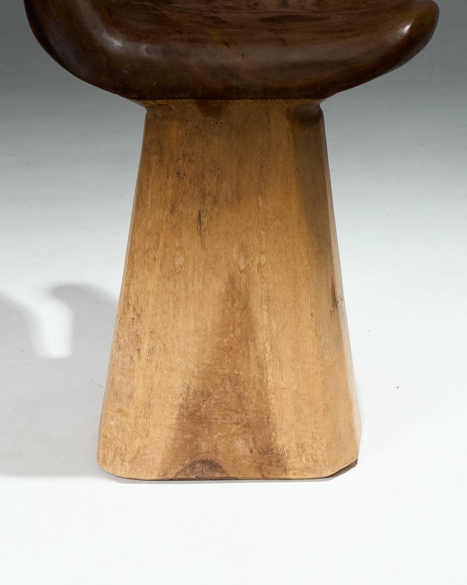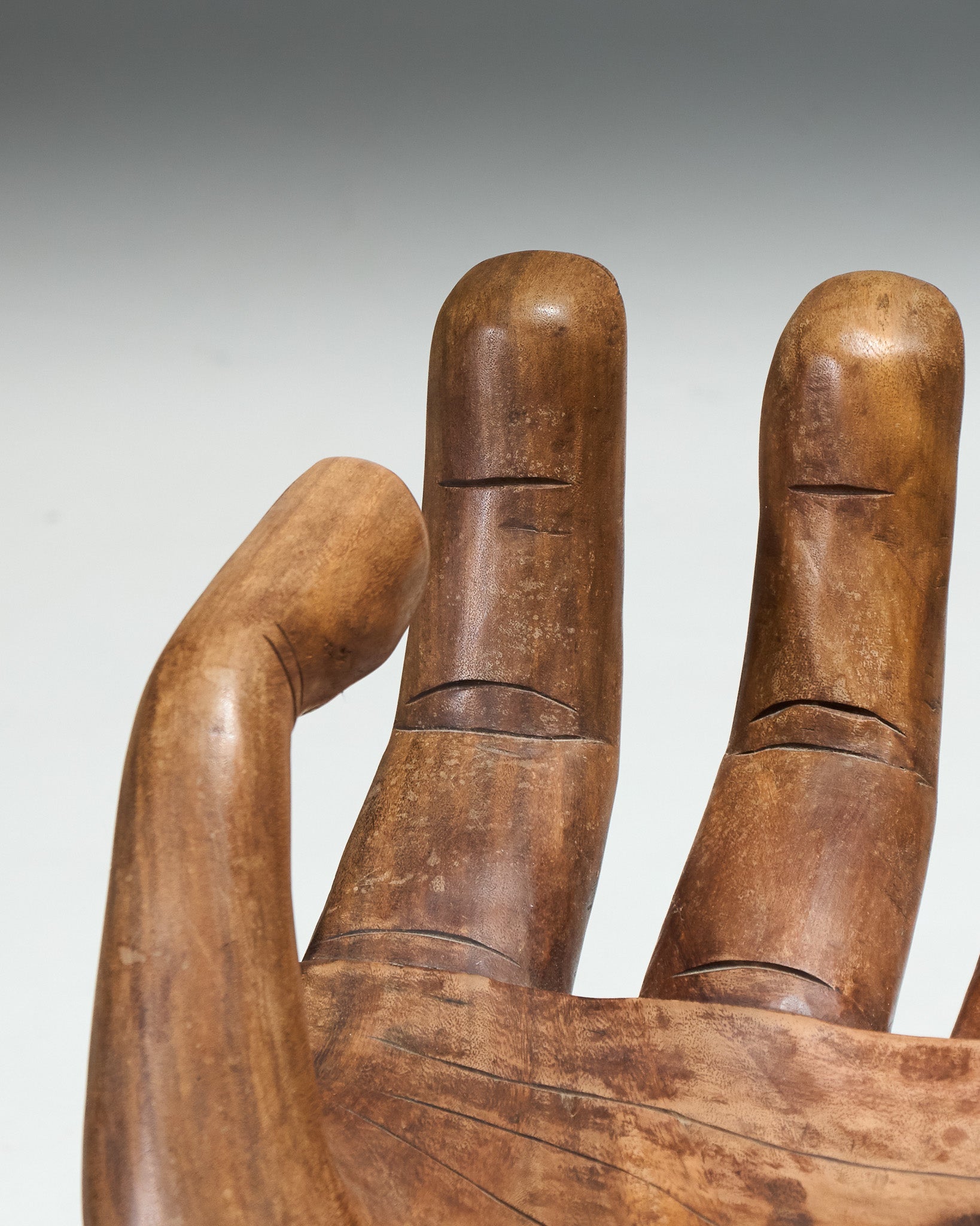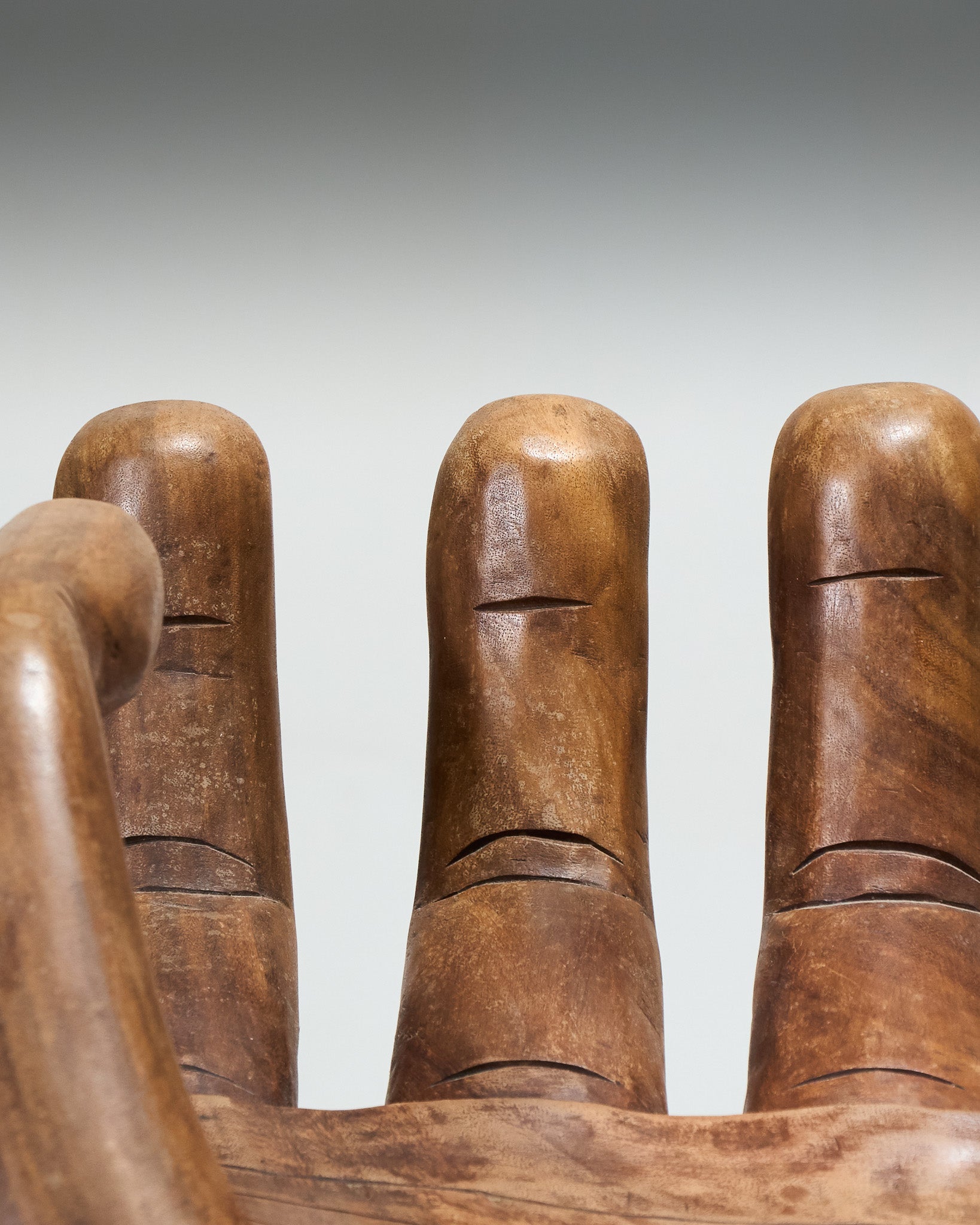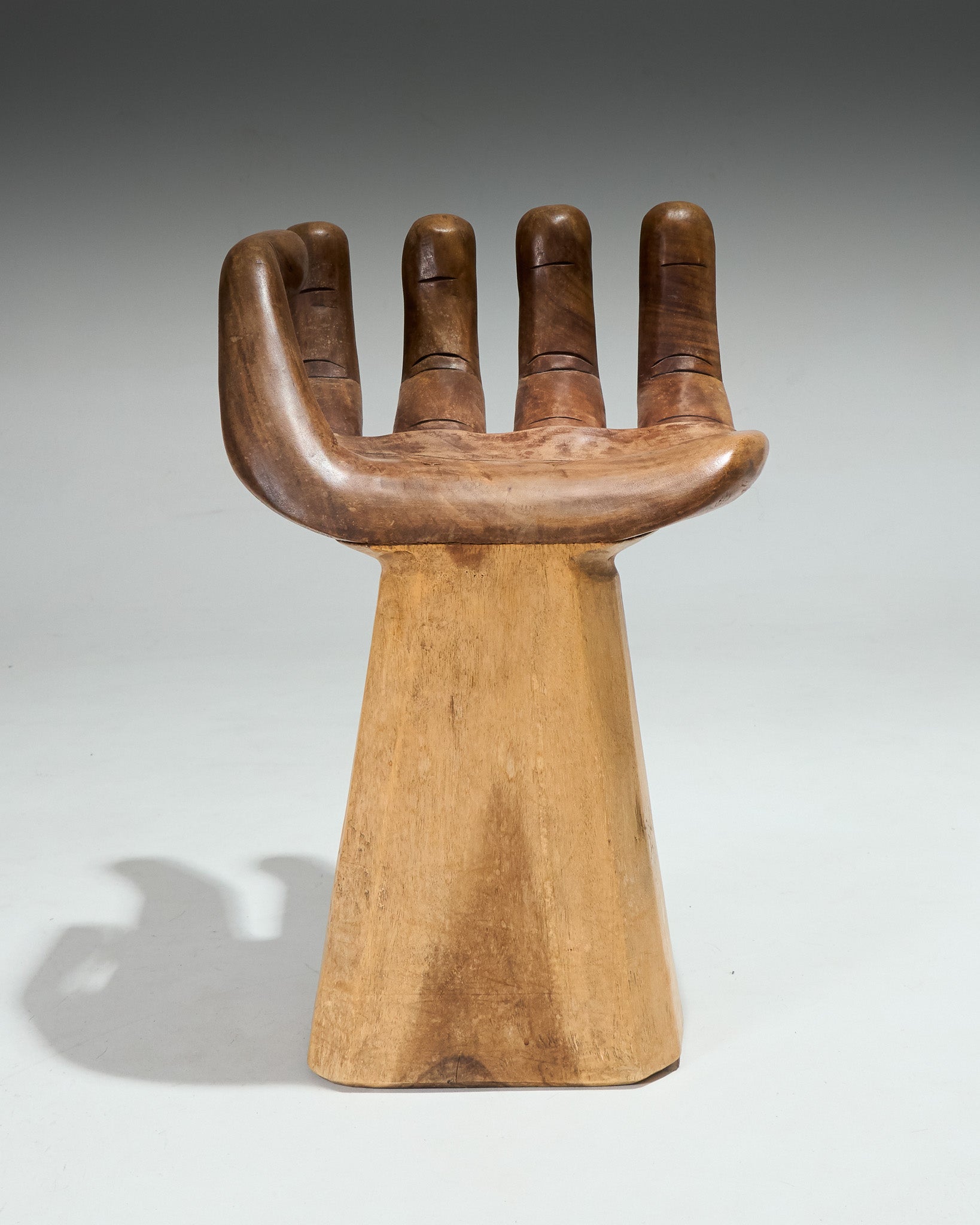 Sculptural chair in the shape of a hand, carved directly from solid wood. Made in the 1960s. Good overall condition, showing signs of wear consistent with its age.