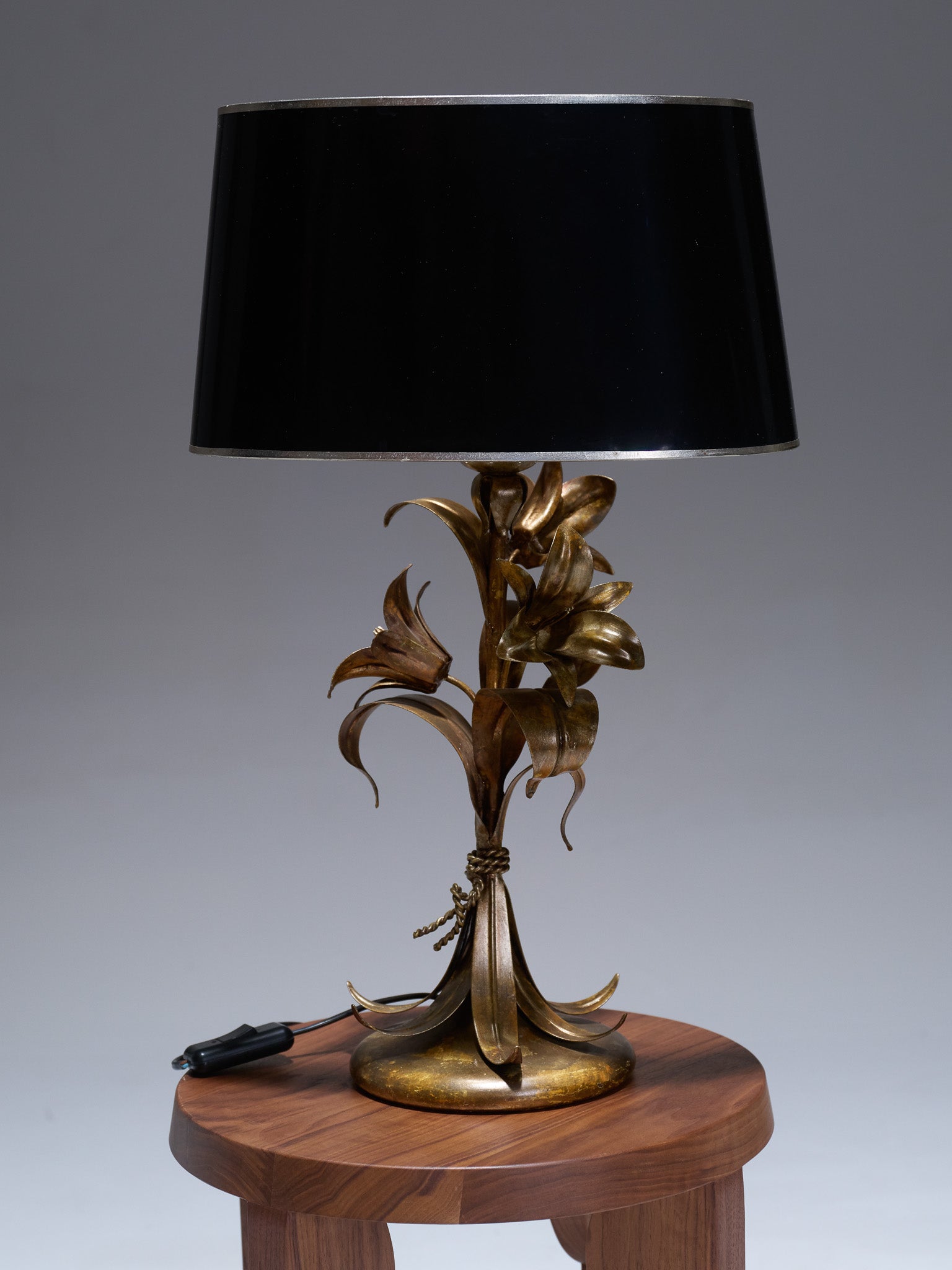 A sculptural brass table lamp, adorned with stylized flowers typical of the Hollywood Regency aesthetic. It features the original oval black lacquered metal shade with a gilded interior that diffuses a warm light. Attributed to Maison Jensen, circa 1970.