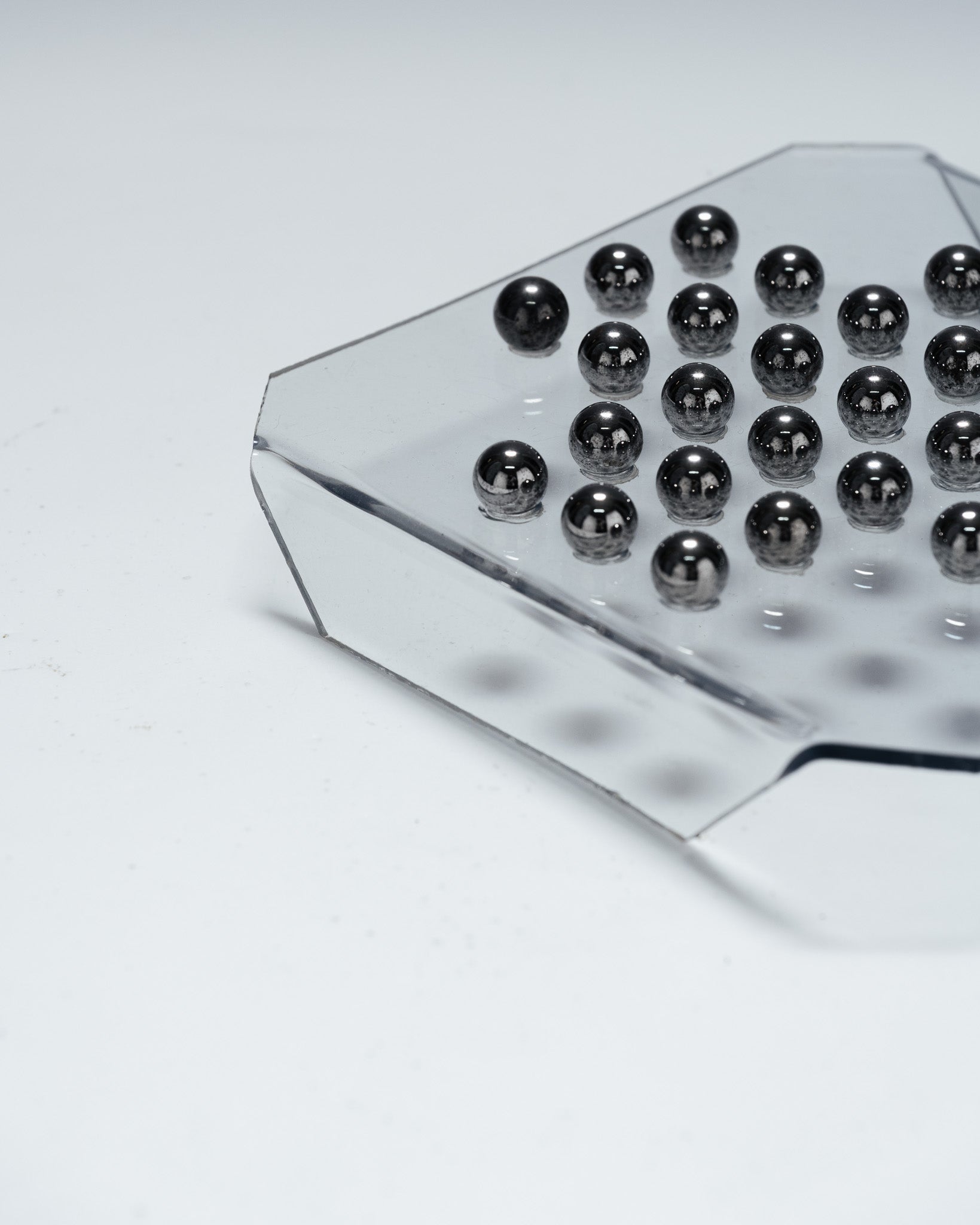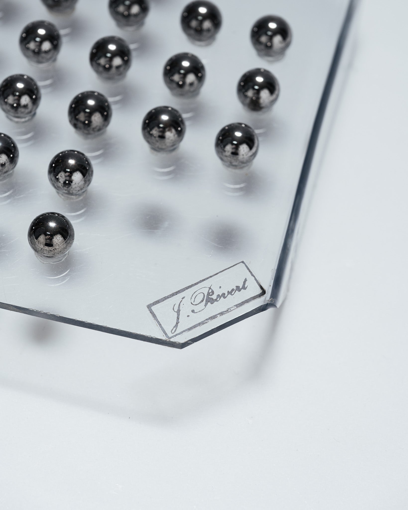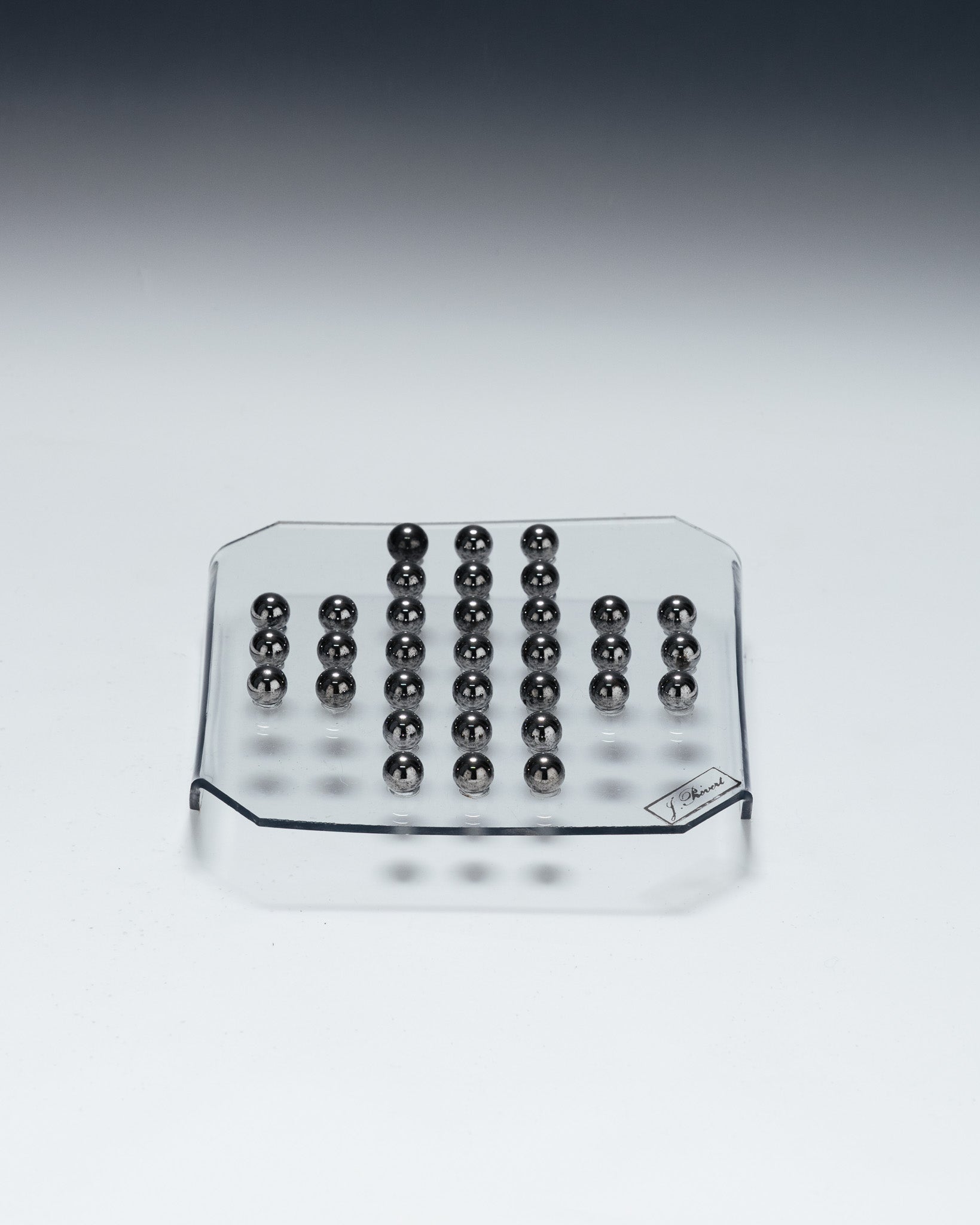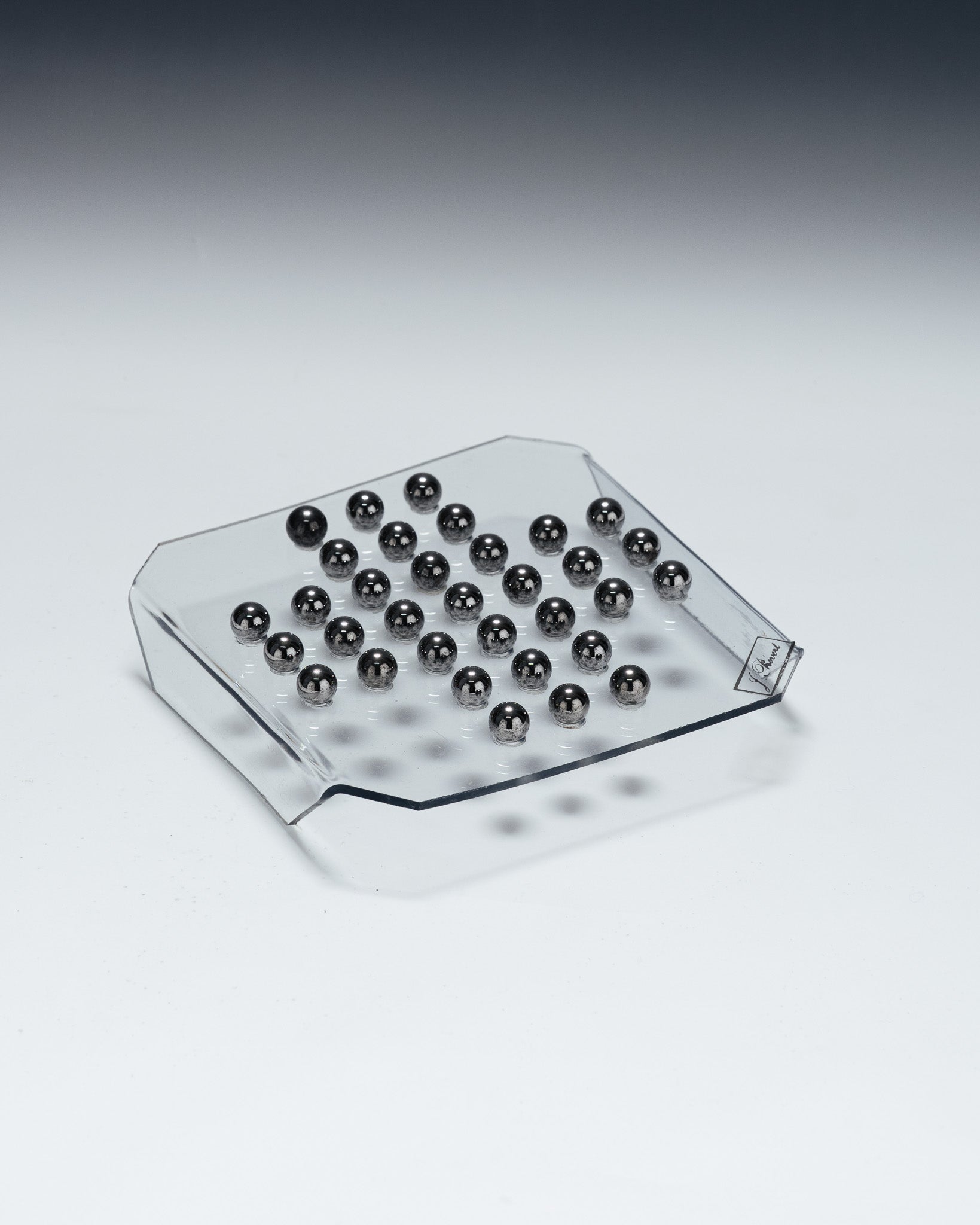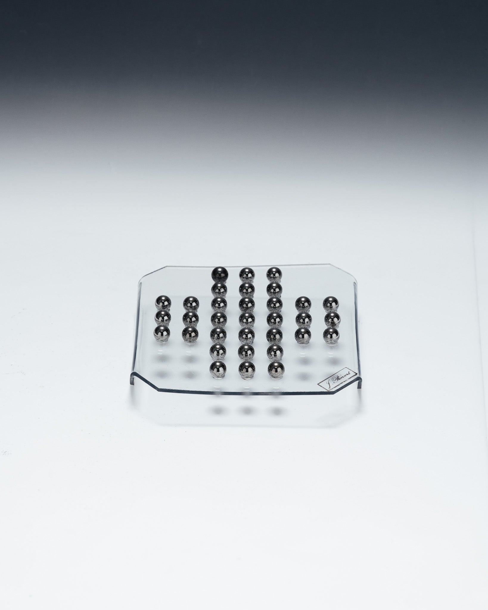 A solitaire game consisting of a transparent plexiglass board and 33 metal marbles. The minimalist design and the transparency of the material highlight the graphic arrangement of the marbles, characteristic of 1970s games and office objects.