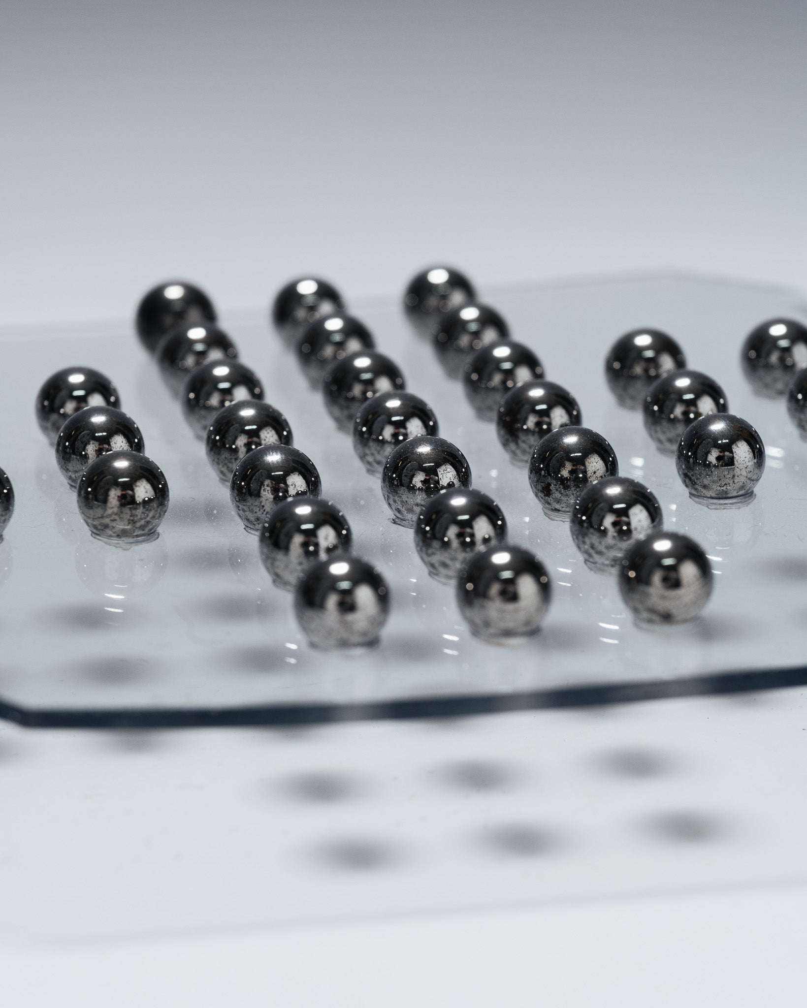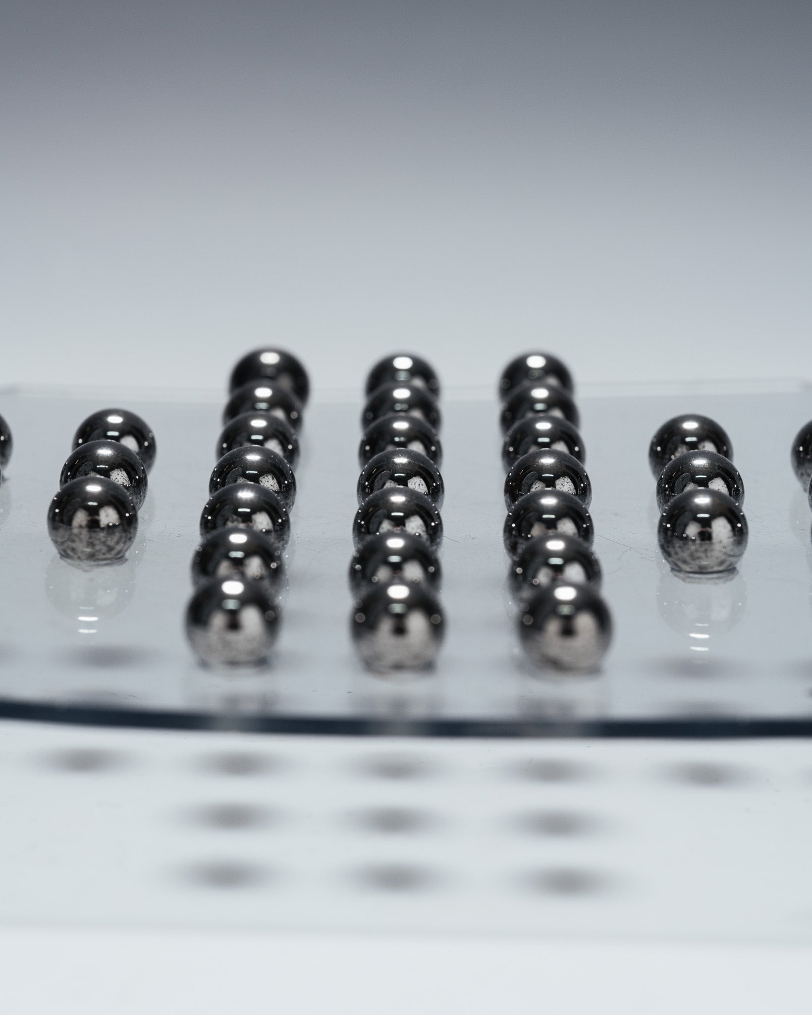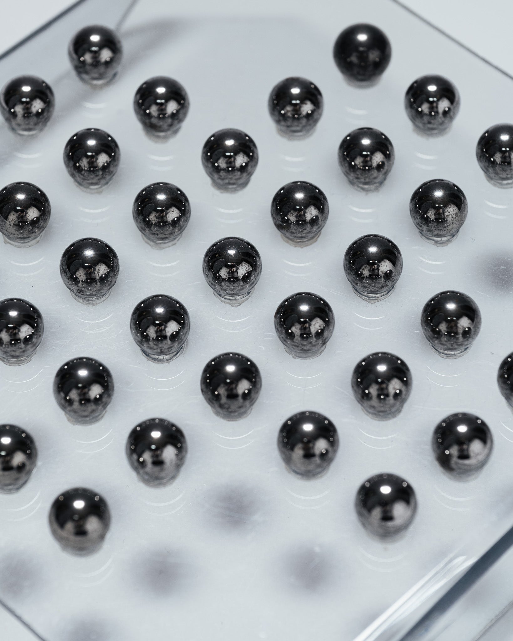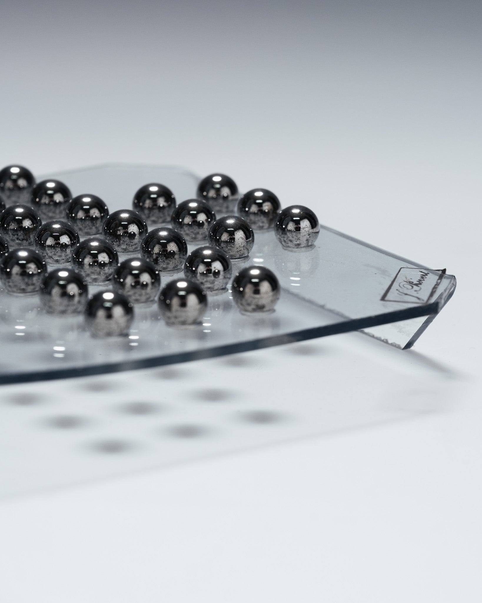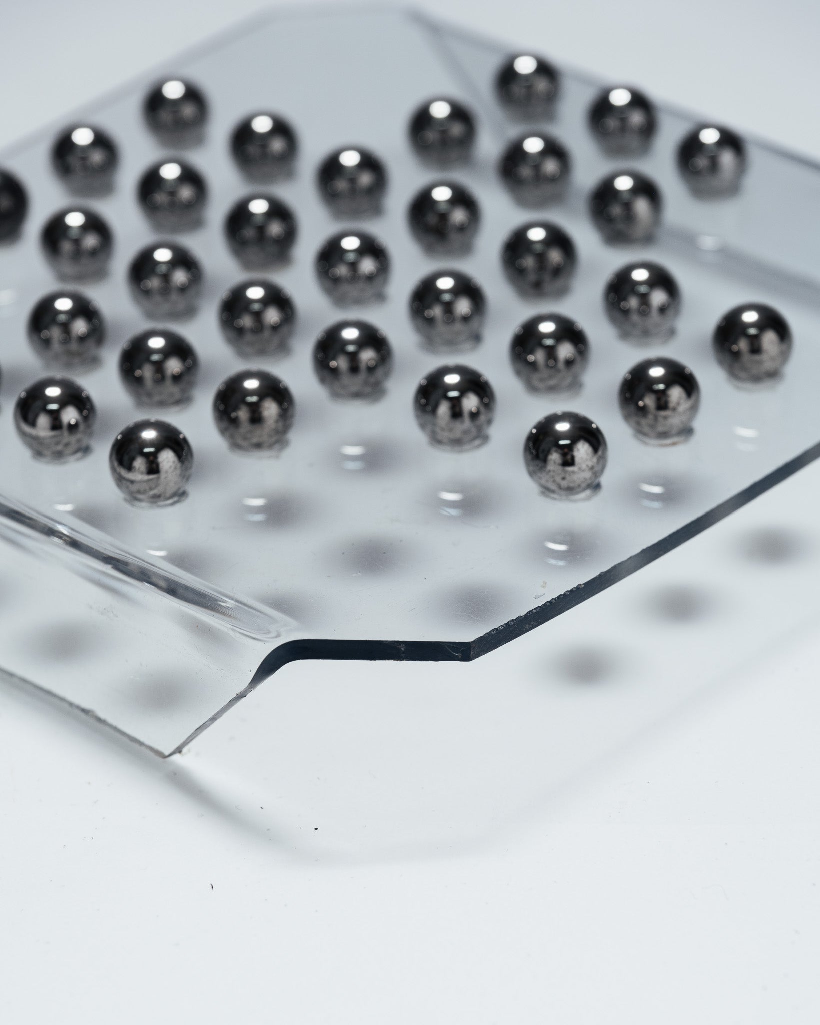 A solitaire game consisting of a transparent plexiglass board and 33 metal marbles. The minimalist design and the transparency of the material highlight the graphic arrangement of the marbles, characteristic of 1970s games and office objects.