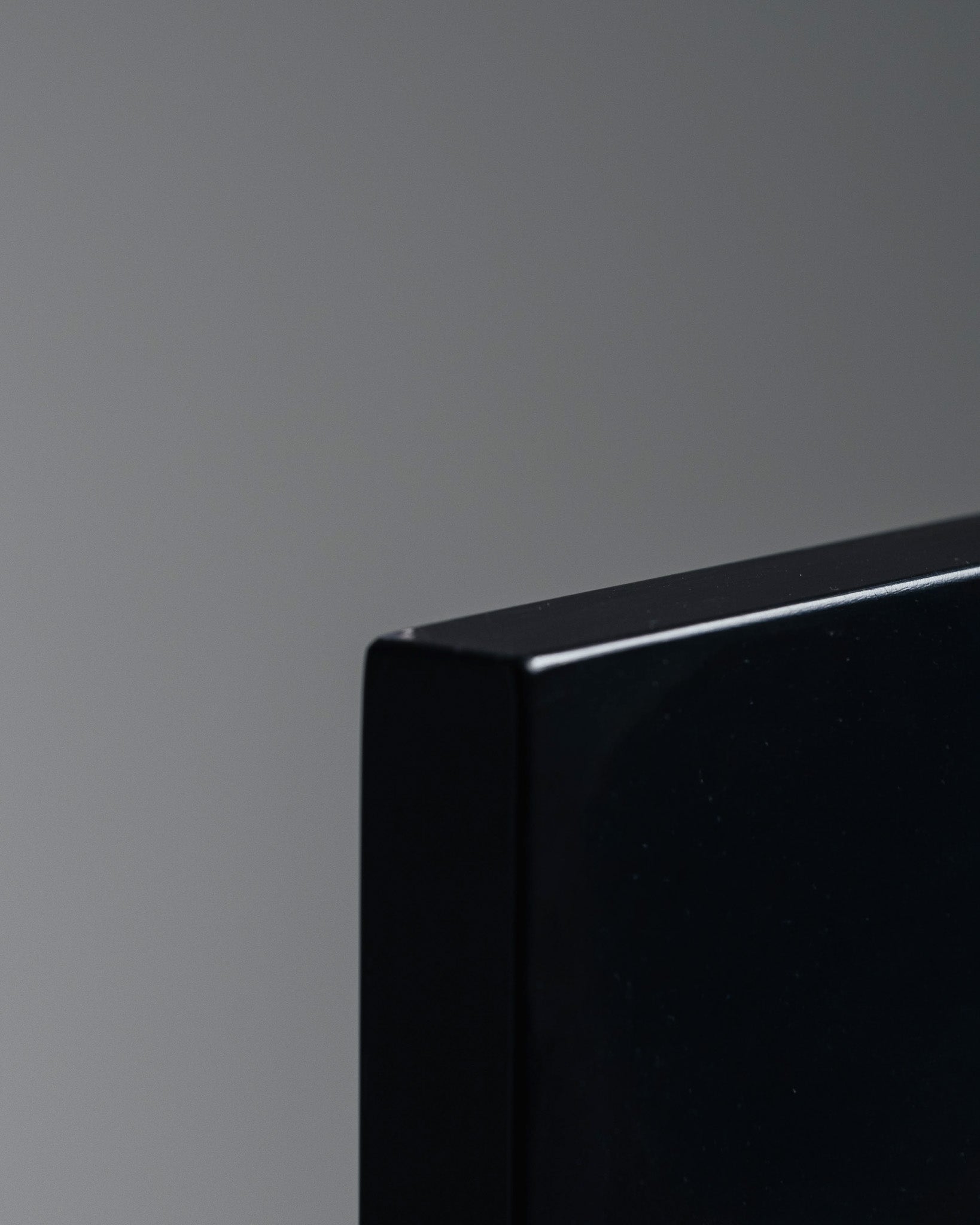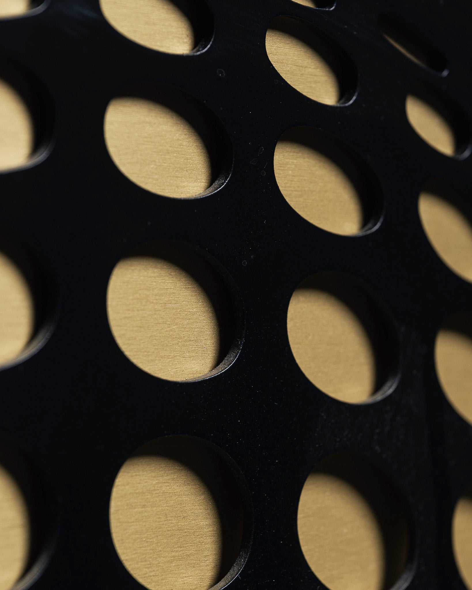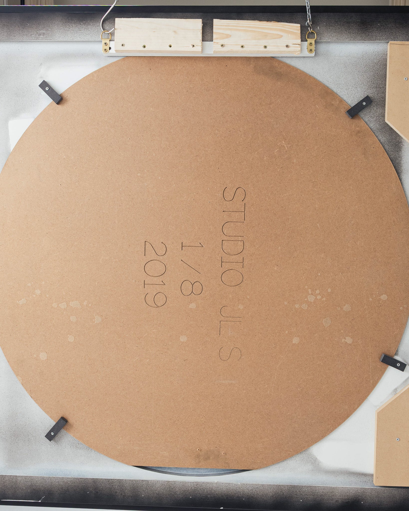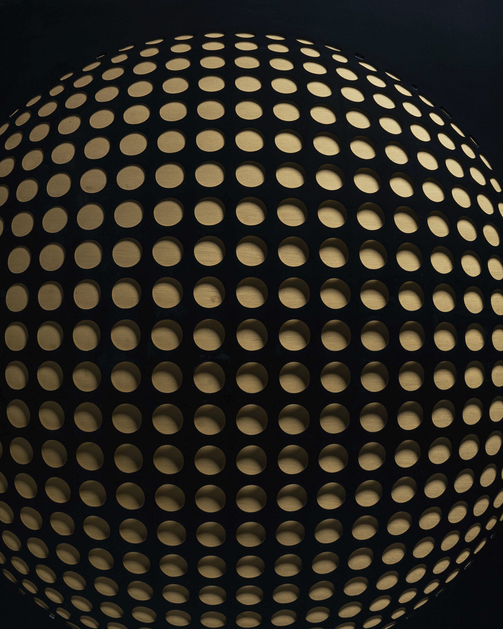 Kinetic artwork in black and gold lacquered wood, composed of a raised circular motif. Each circle is arranged to form a sphere, giving an impression of three-dimensionality and creating an optical illusion of movement. Geometric work, signed on the reverse : Studio JL S, 2019, 1/8.