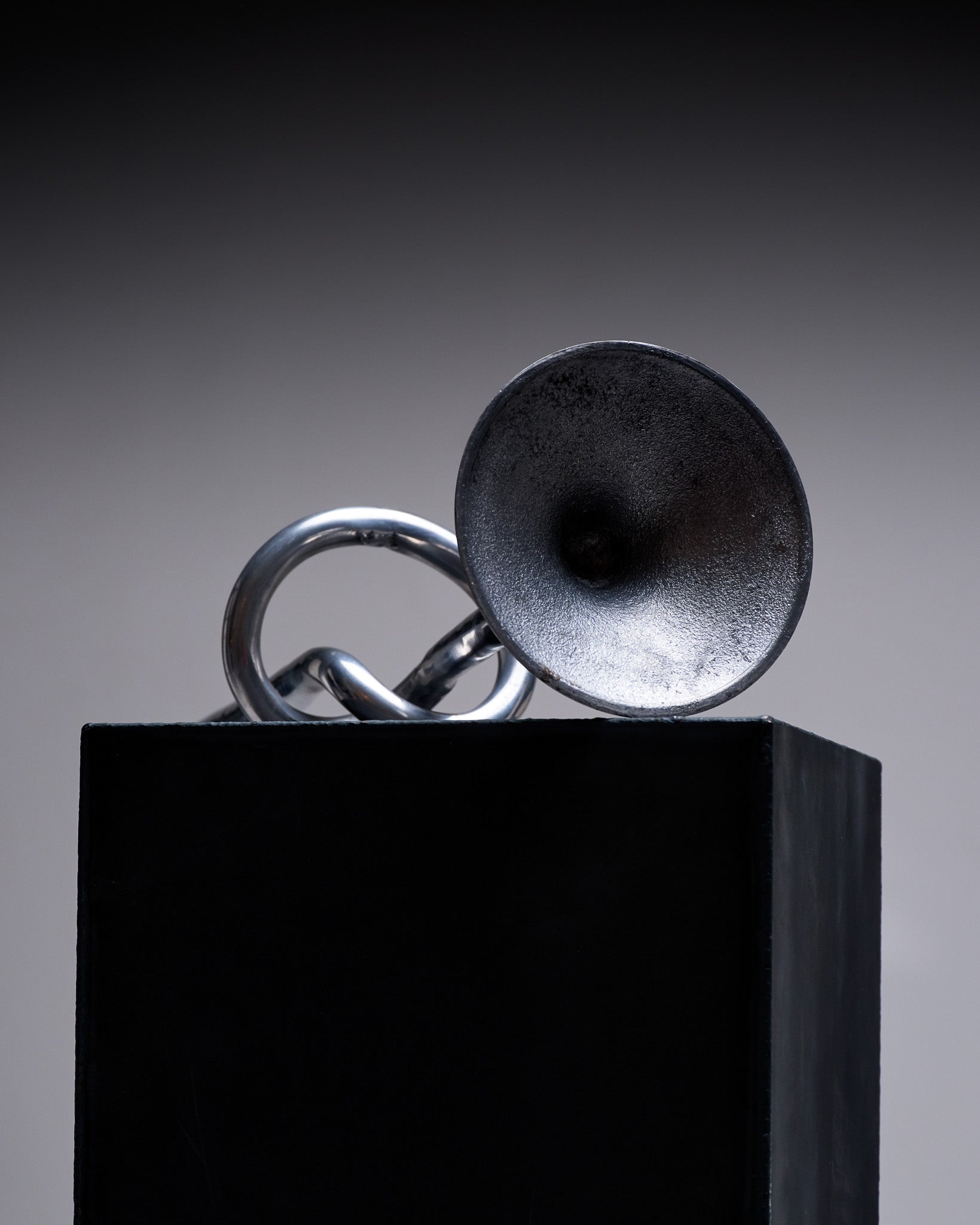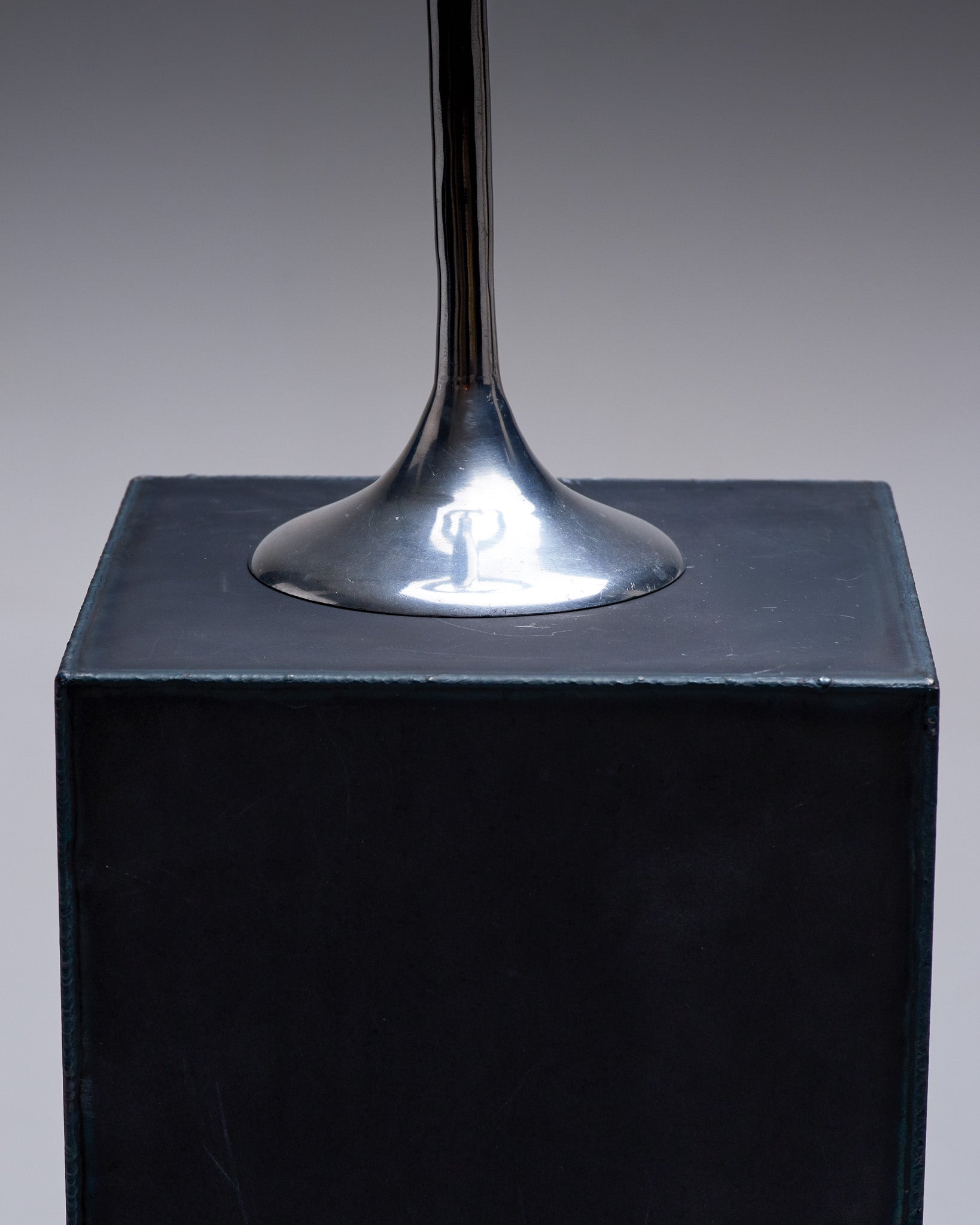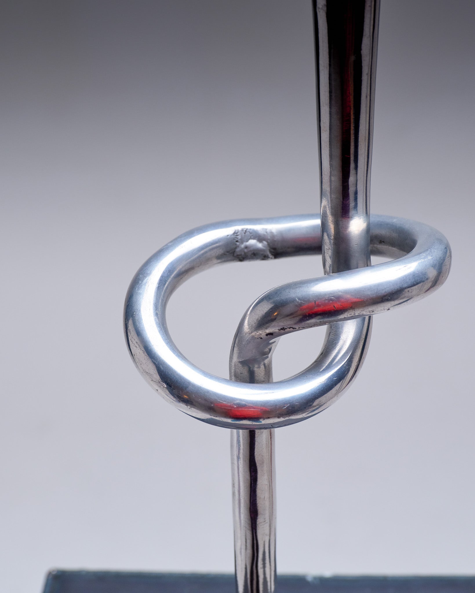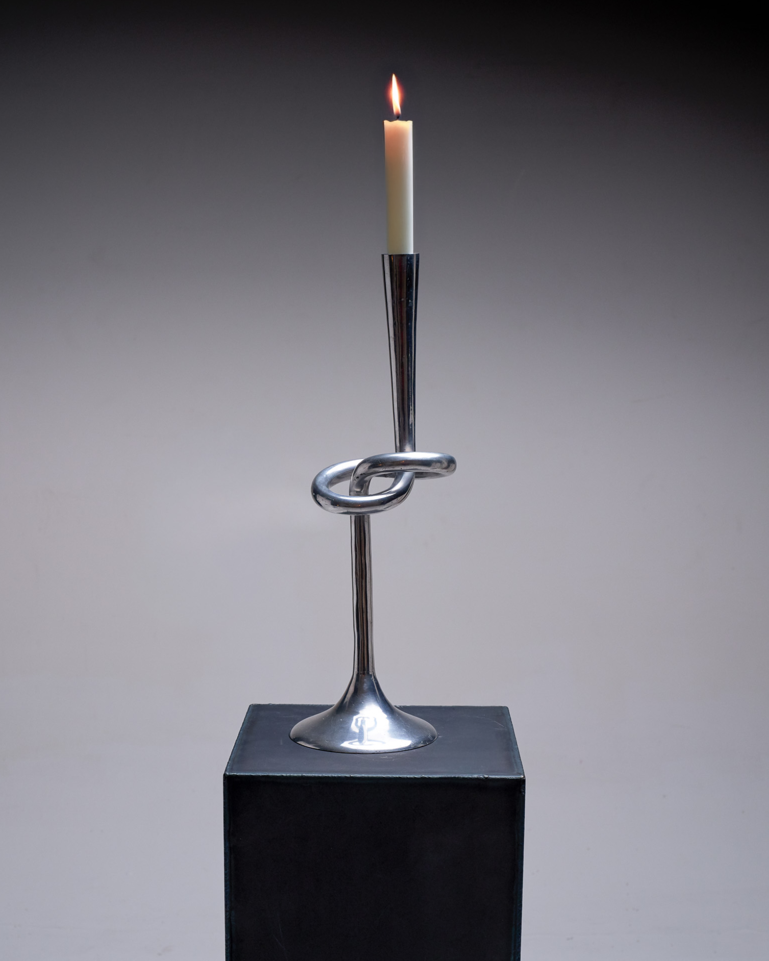 Aluminium candlestick formed from a knot resting on a round base, in the aesthetic of the 1980s. Good overall condition, with traces consistent with age, use and assembly.