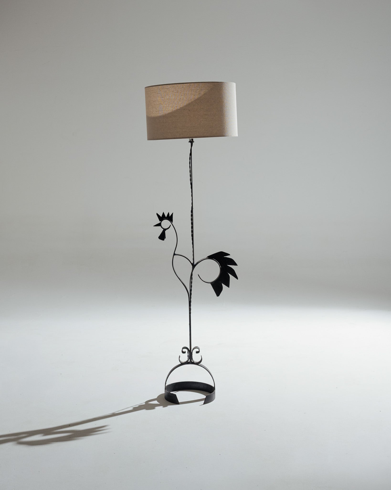 A wrought iron floor lamp consisting of a slender vertical stem resting on a circular base, adorned with a stylized rooster motif rendered in a graphic style. Its aesthetic is reminiscent of post-war French workshop productions. This model is in the style of Jean Touret's rooster floor lamp, but with a lighter and more linear approach.
