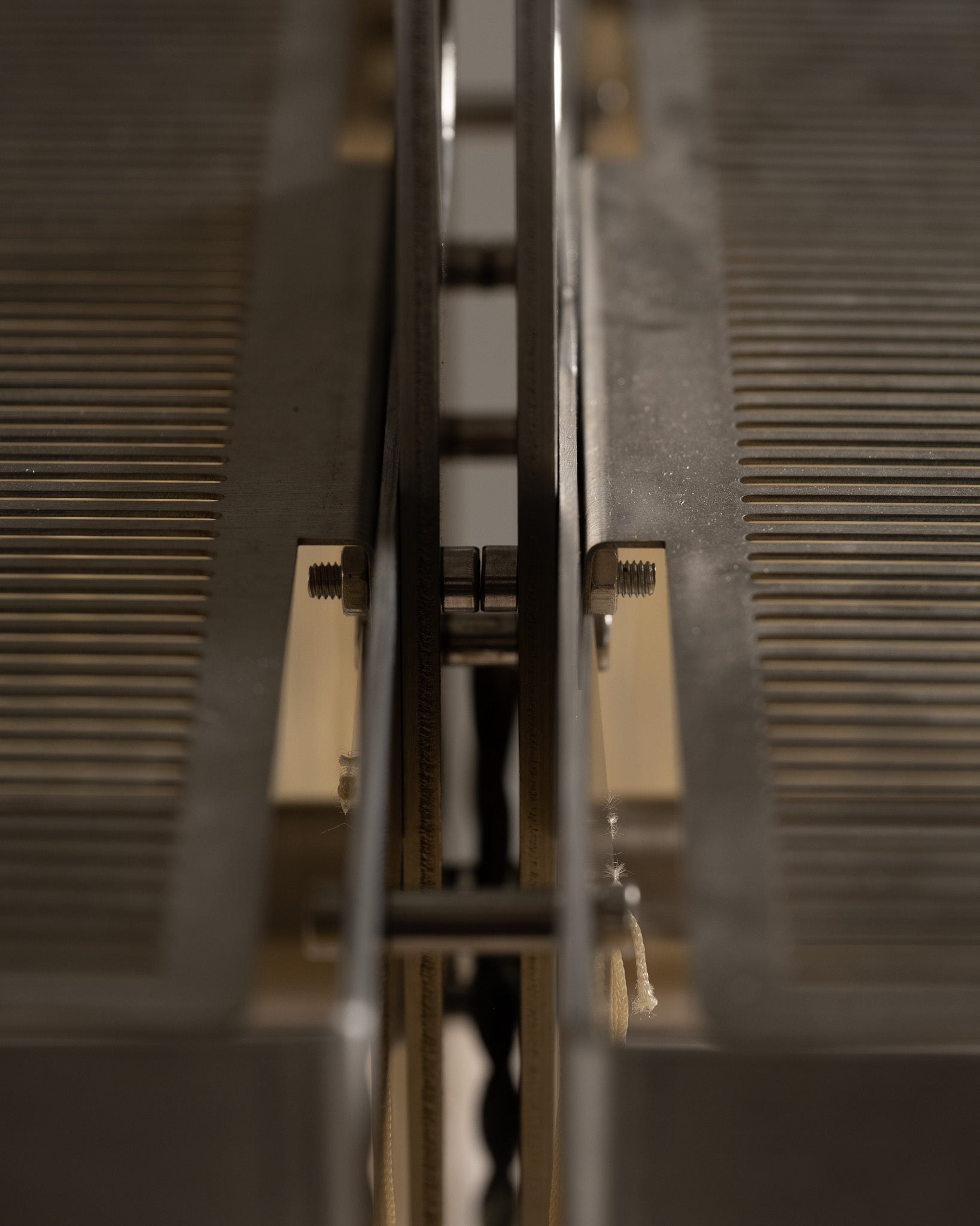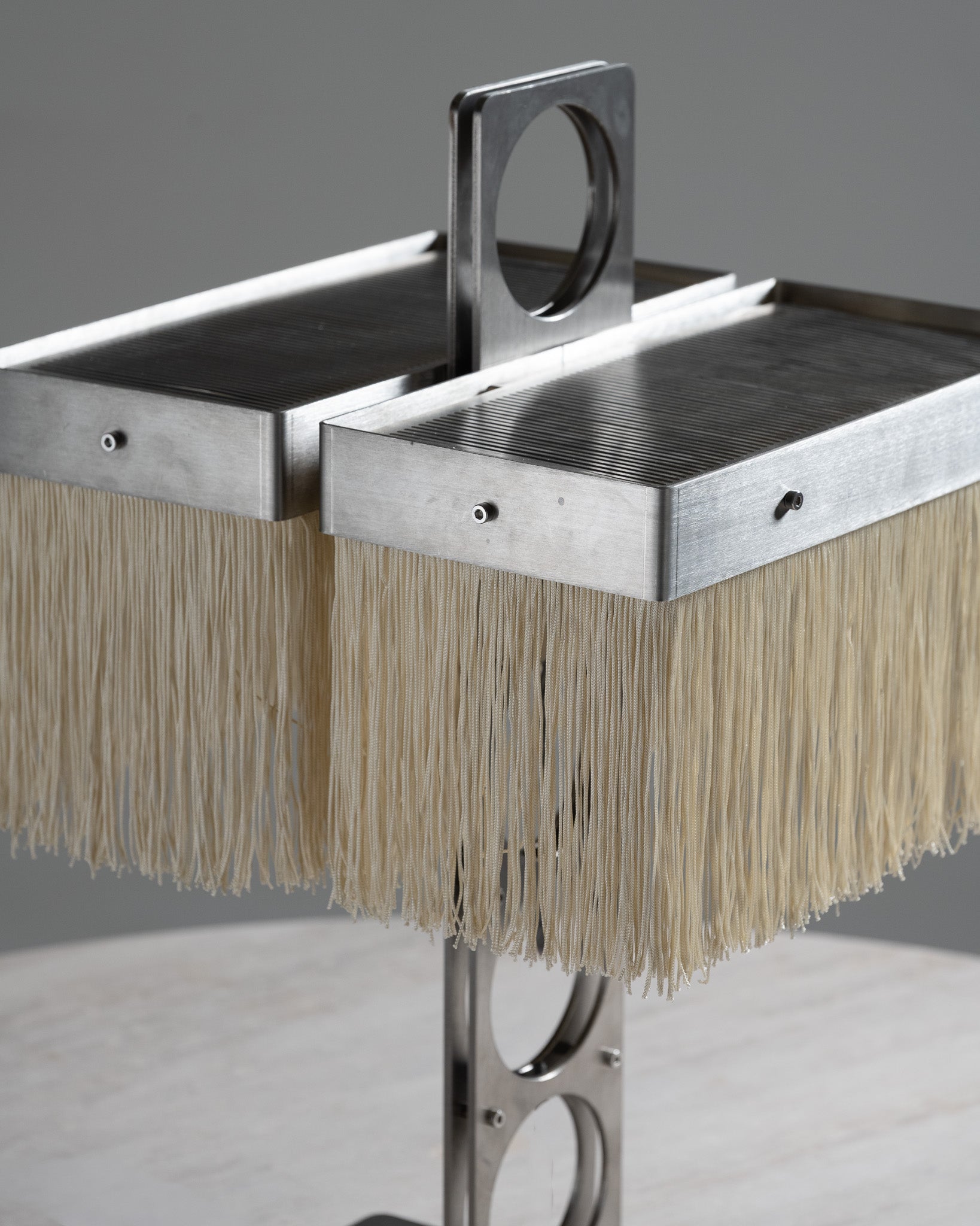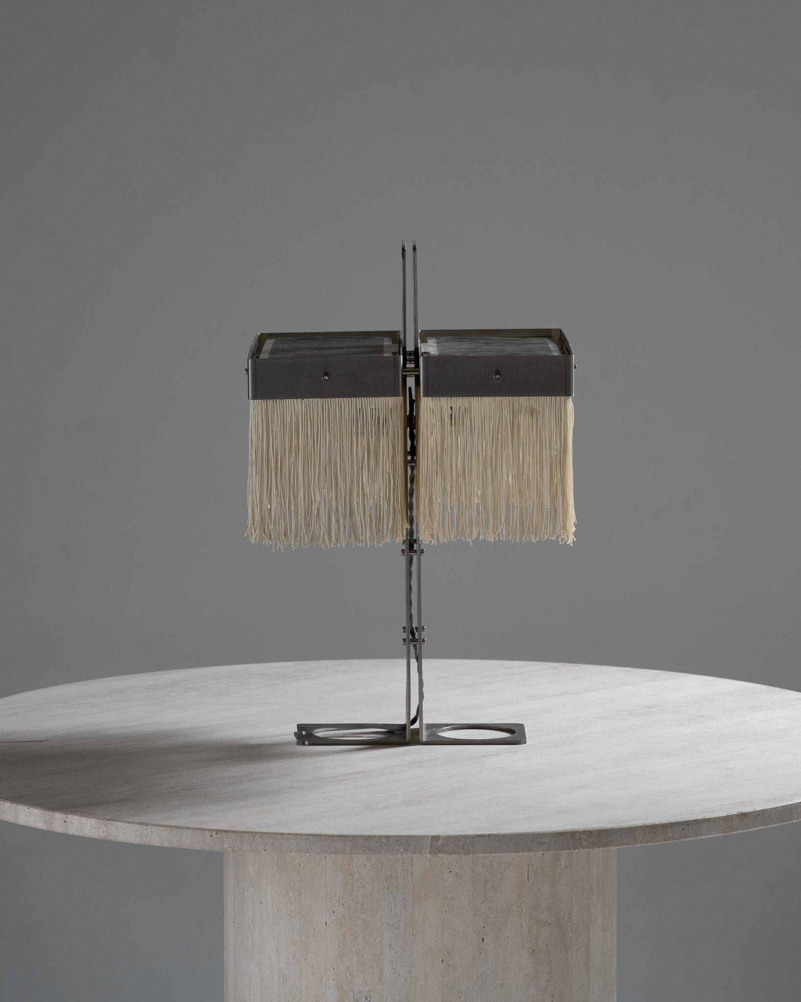 The Niluna table lamp stands out with its strong, geometric, vertical metal structure, punctuated by oval openings that lend lightness and dynamism to the overall design. Its clean-lined top supports a lampshade with light fabric fringes, whose soft texture contrasts with the rigidity of the metal. The lamp diffuses a soft, diffused light, creating a warm atmosphere.