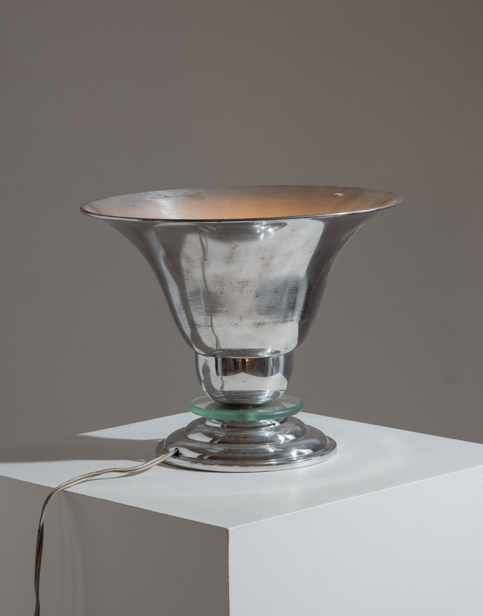 Art Deco style "Mazda" table lamp, made of aluminum and glass. Flared silhouette on a tiered base, produced in the 1960s, a period of rediscovery of the Art Deco aesthetic. Some minor scratches on the body.