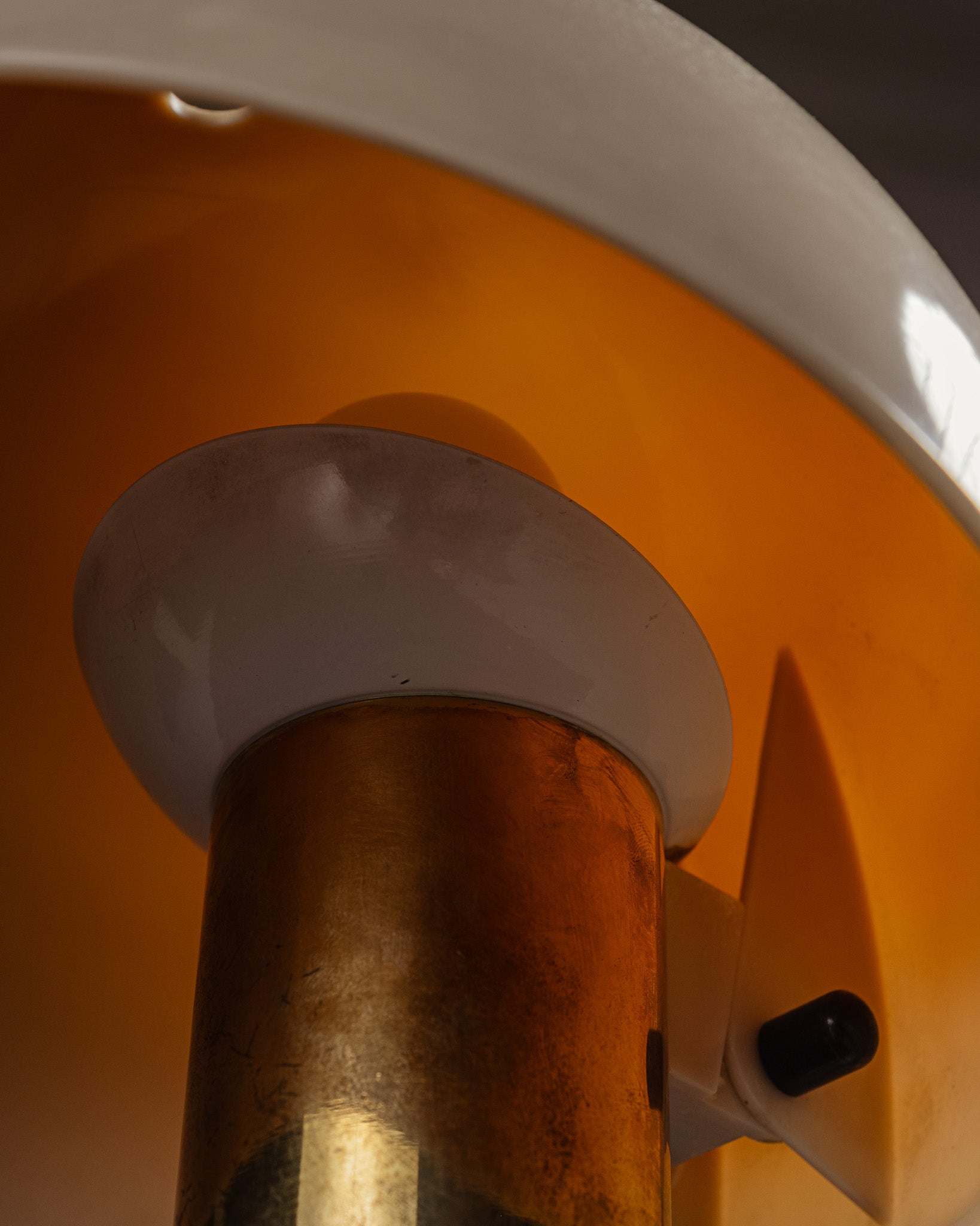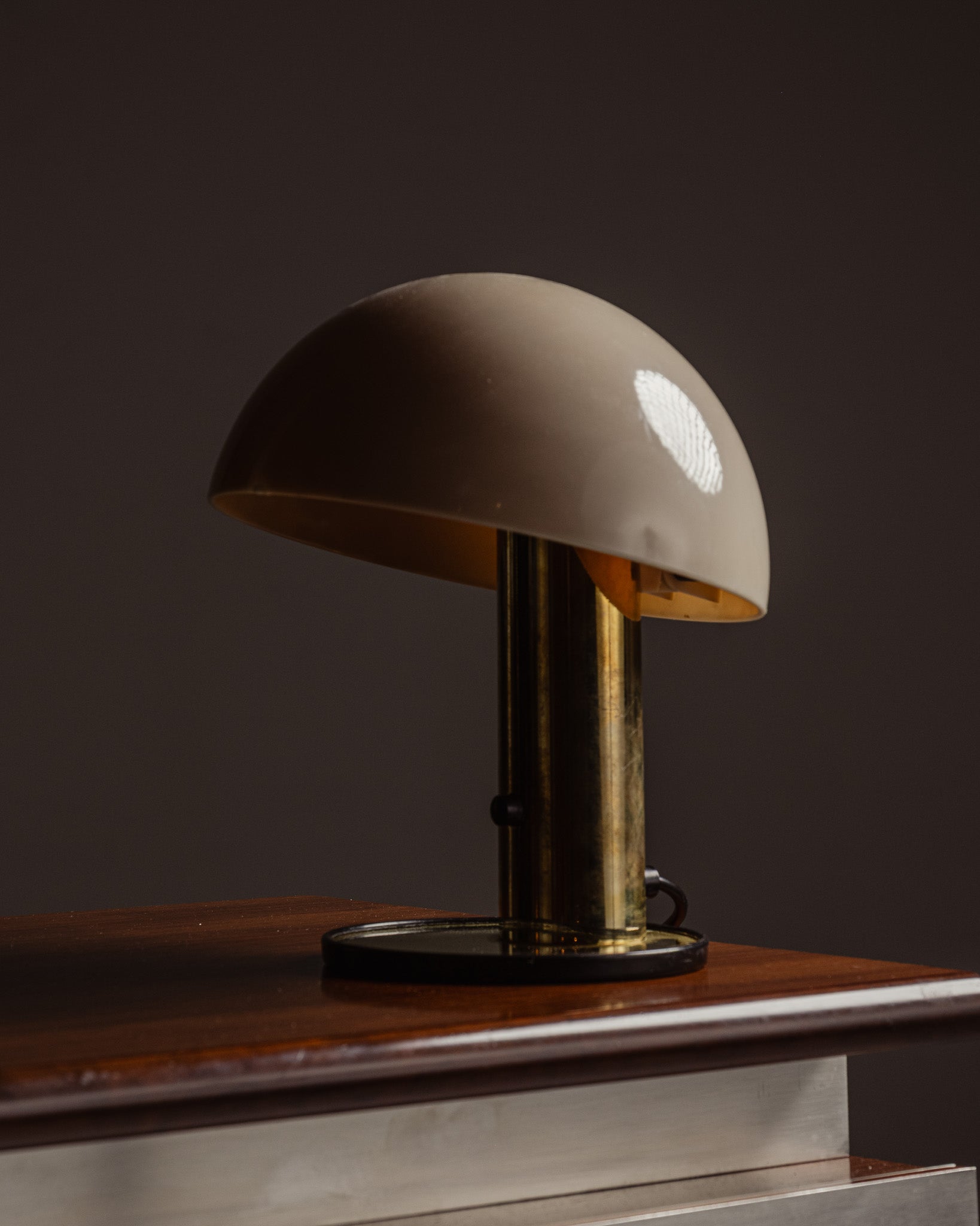 Beda model table lamp designed by Franco Mirenzi, Italy, 1970s. Gilded metal base with original patina, supporting a hemispherical opaline glass shade diffusing a soft light. Good overall condition with slight marks consistent with age and use.
