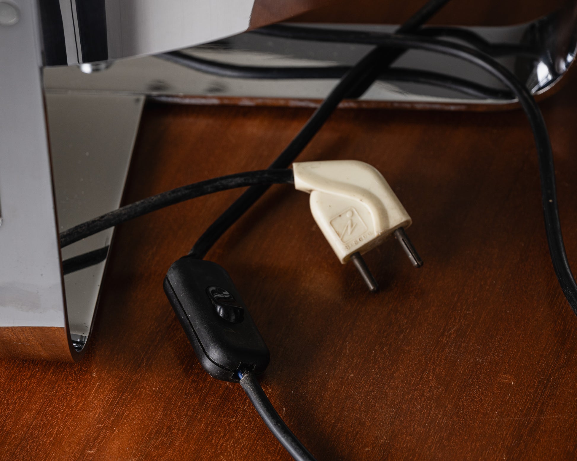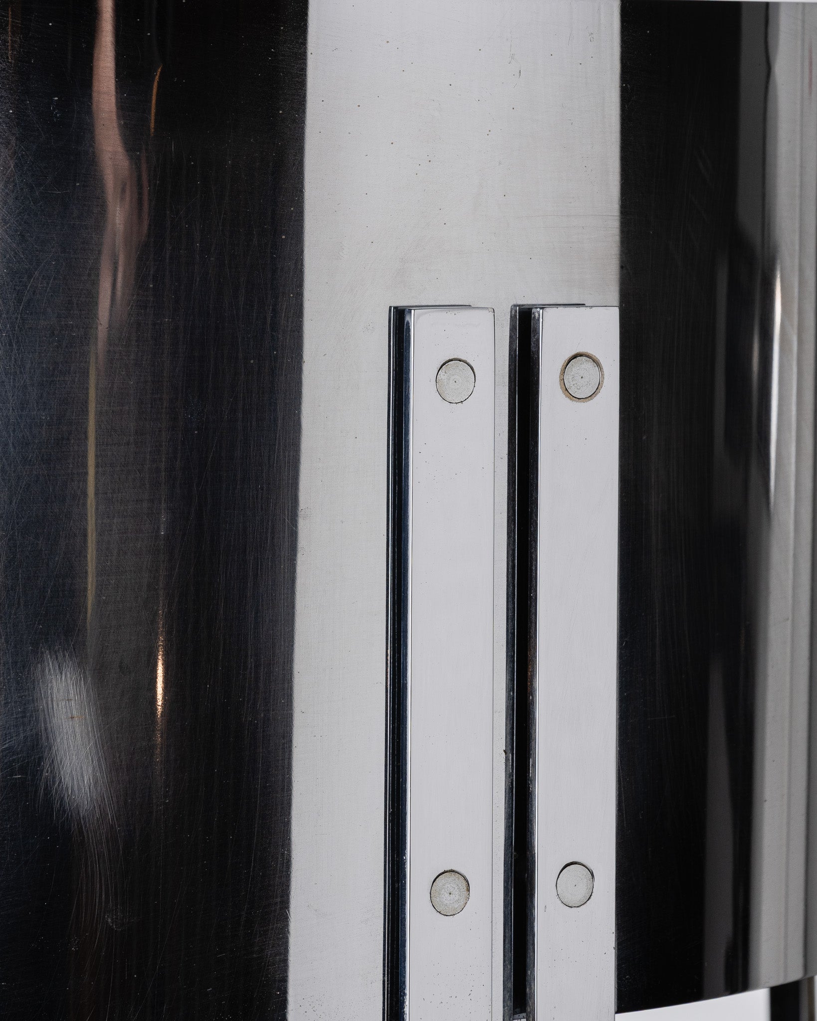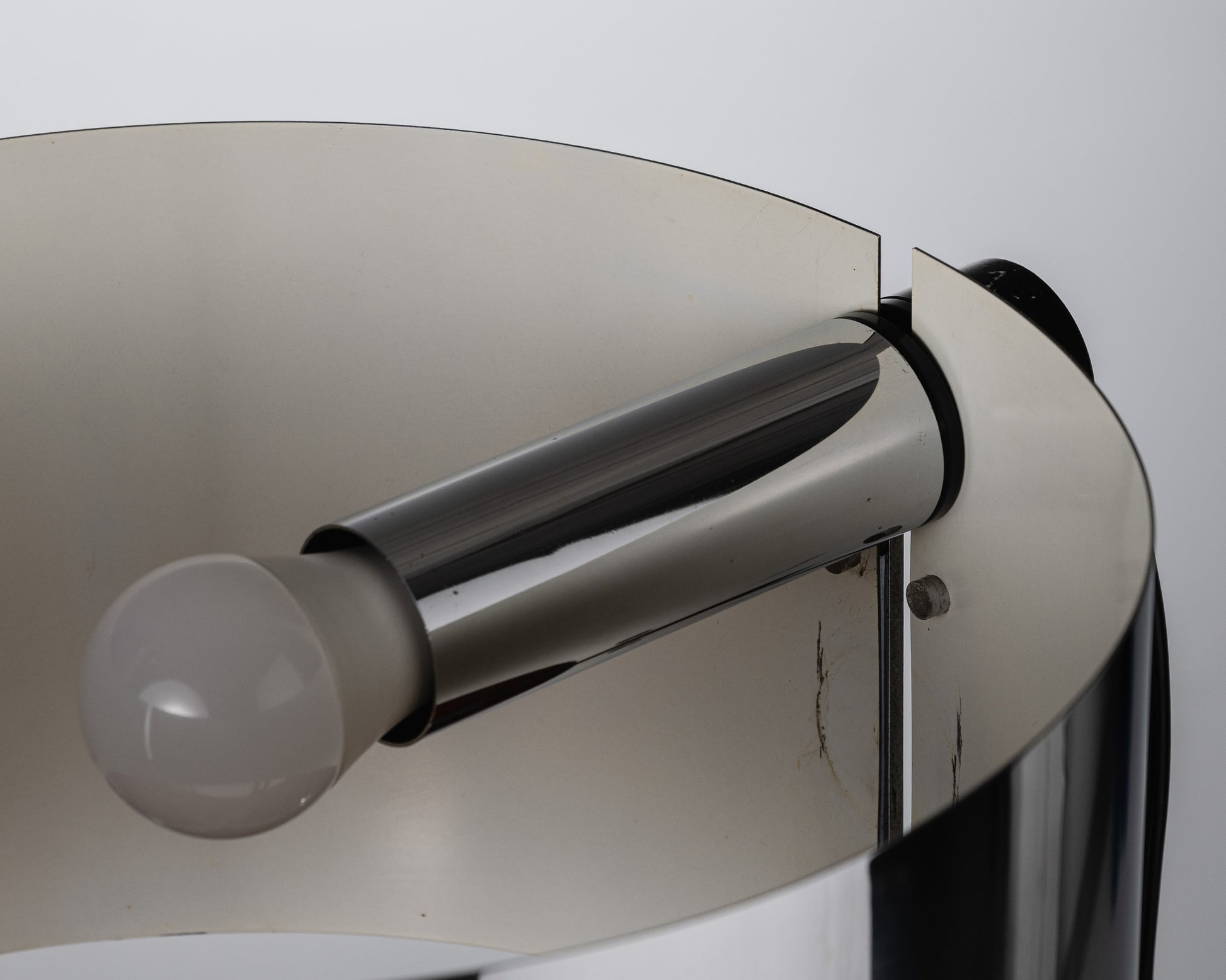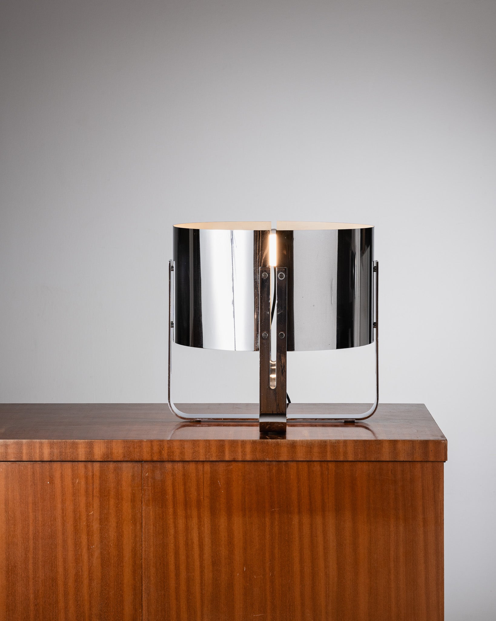 Authentic table lamp by Jacques Quinet, dating from the 1970s. Model characterized by its cylindrical lampshade in chromed metal and its minimalist base, reflecting the designer's clean and functional aesthetic. Good overall condition with slight signs of wear.