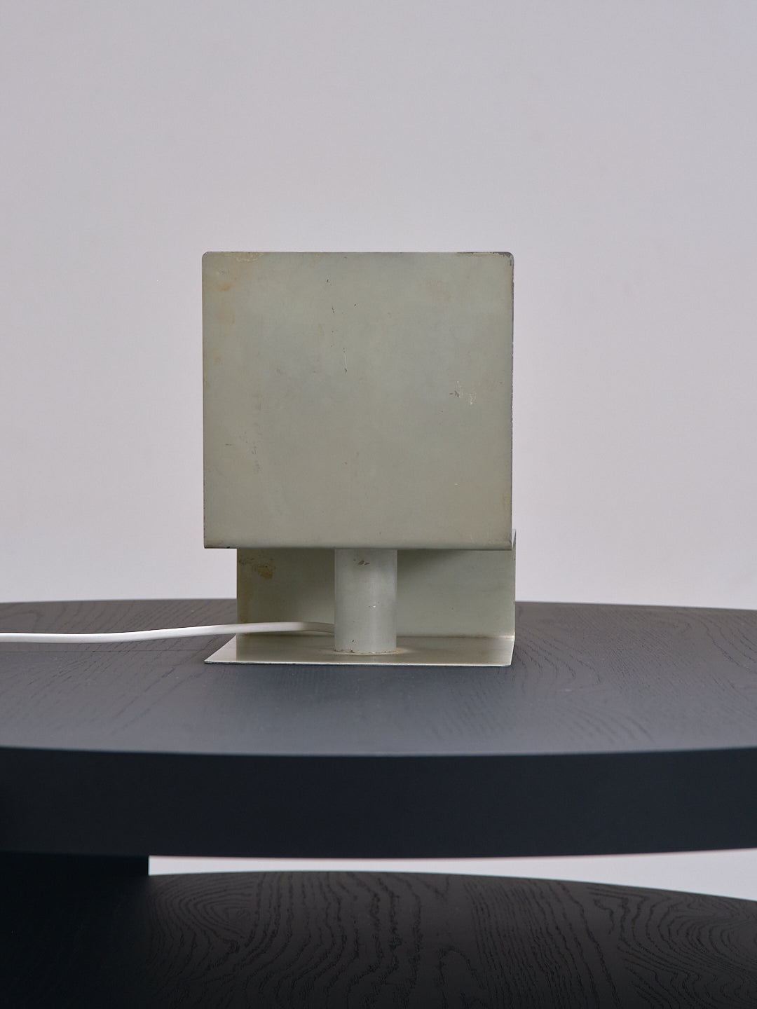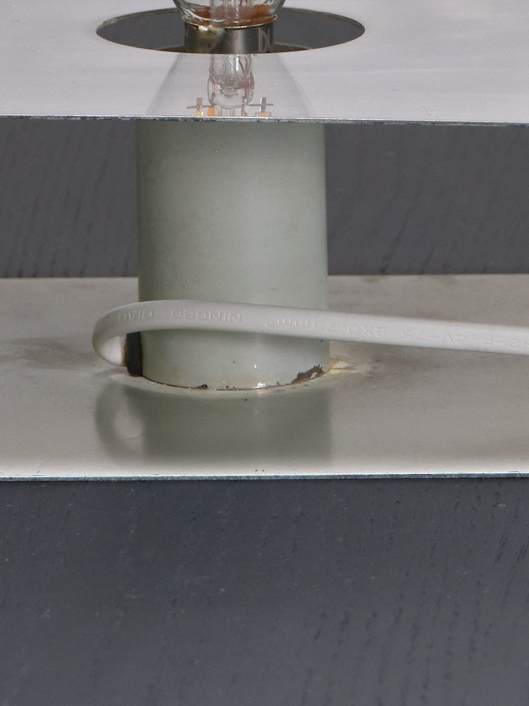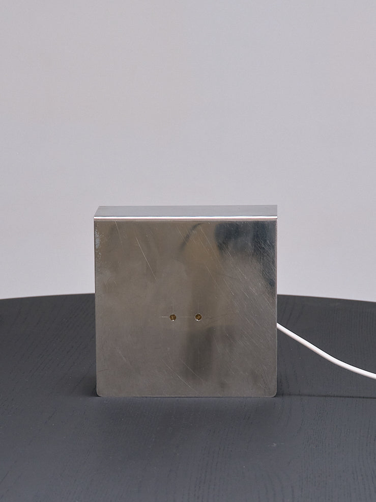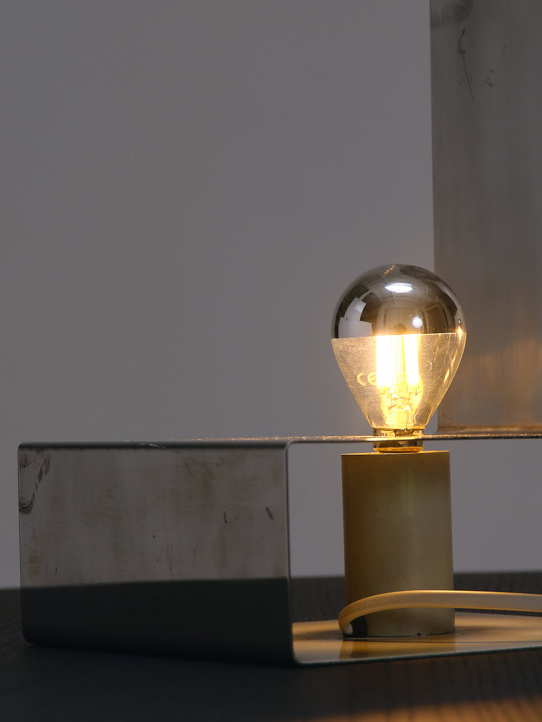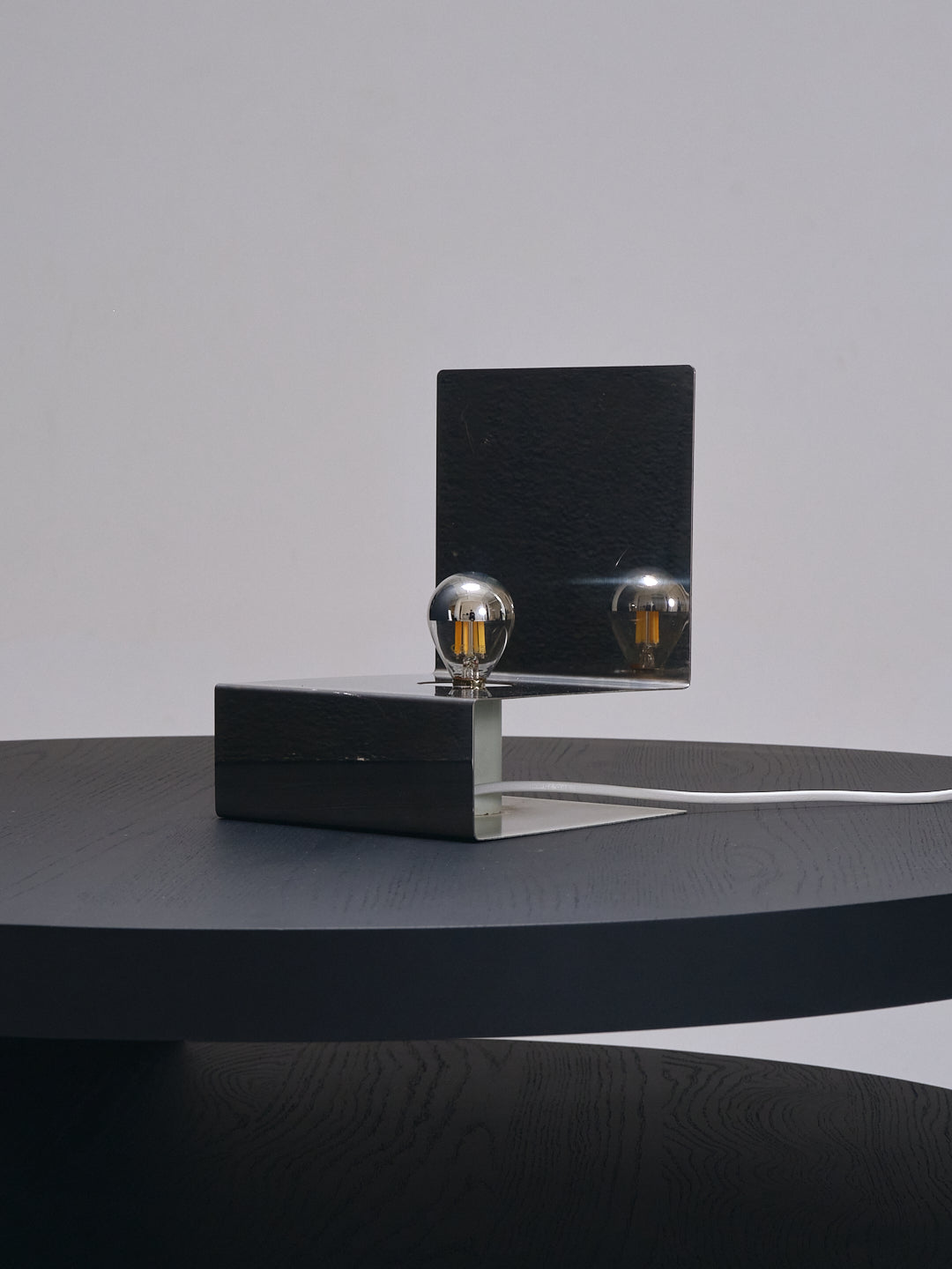 Chrome-plated metal mirror lamp from the 1970s. Its L-shaped frame and vertical panel create a symmetrical mirror effect. Functional European plug. Some signs of wear, good overall condition.