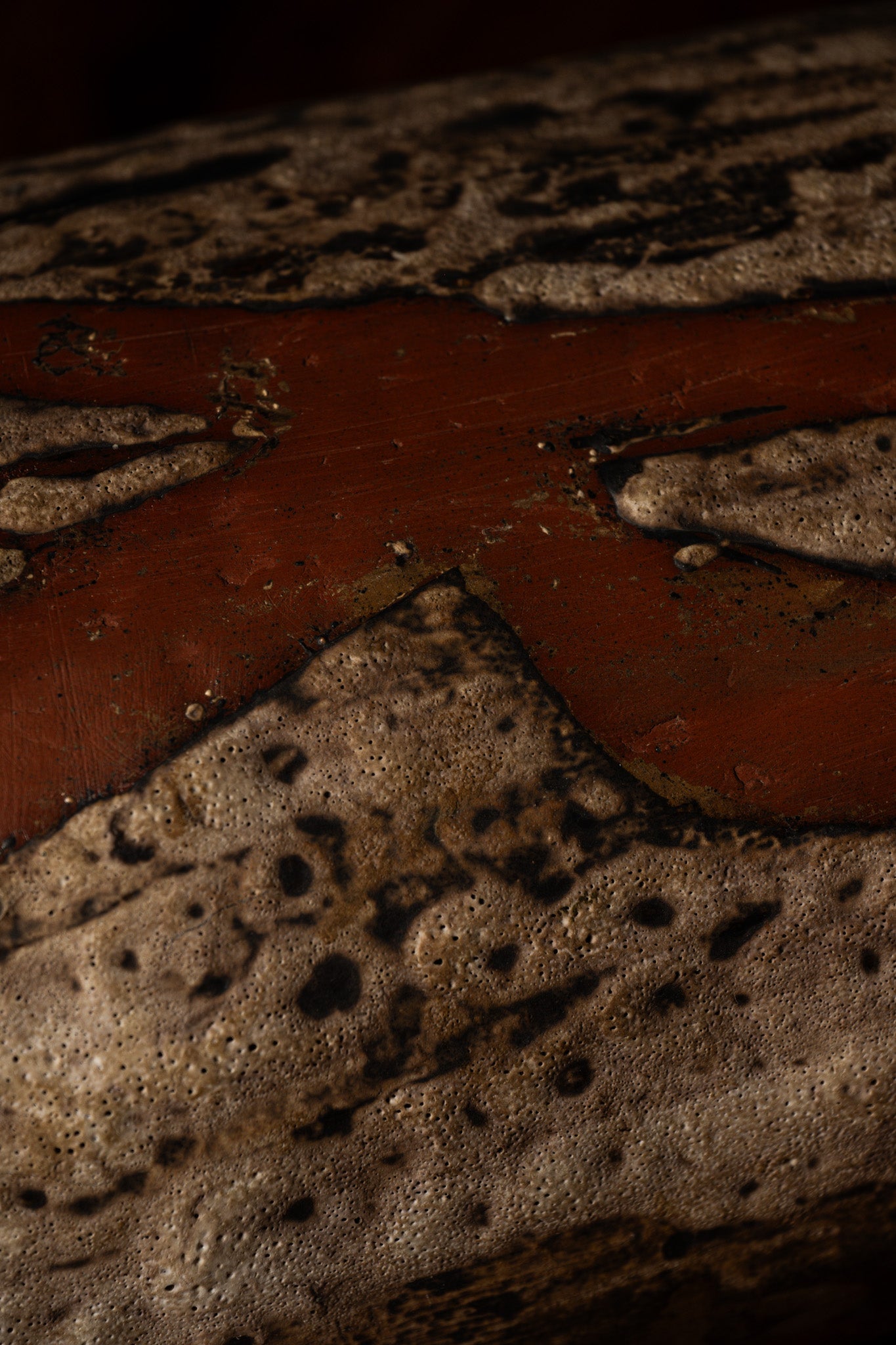 Chamotte ceramic table lamp, 1970s. Cylindrical base with an abstract relief decoration combining raw textures and glaze in shades of beige, brown, and red. Good overall condition. Sold without lampshade.