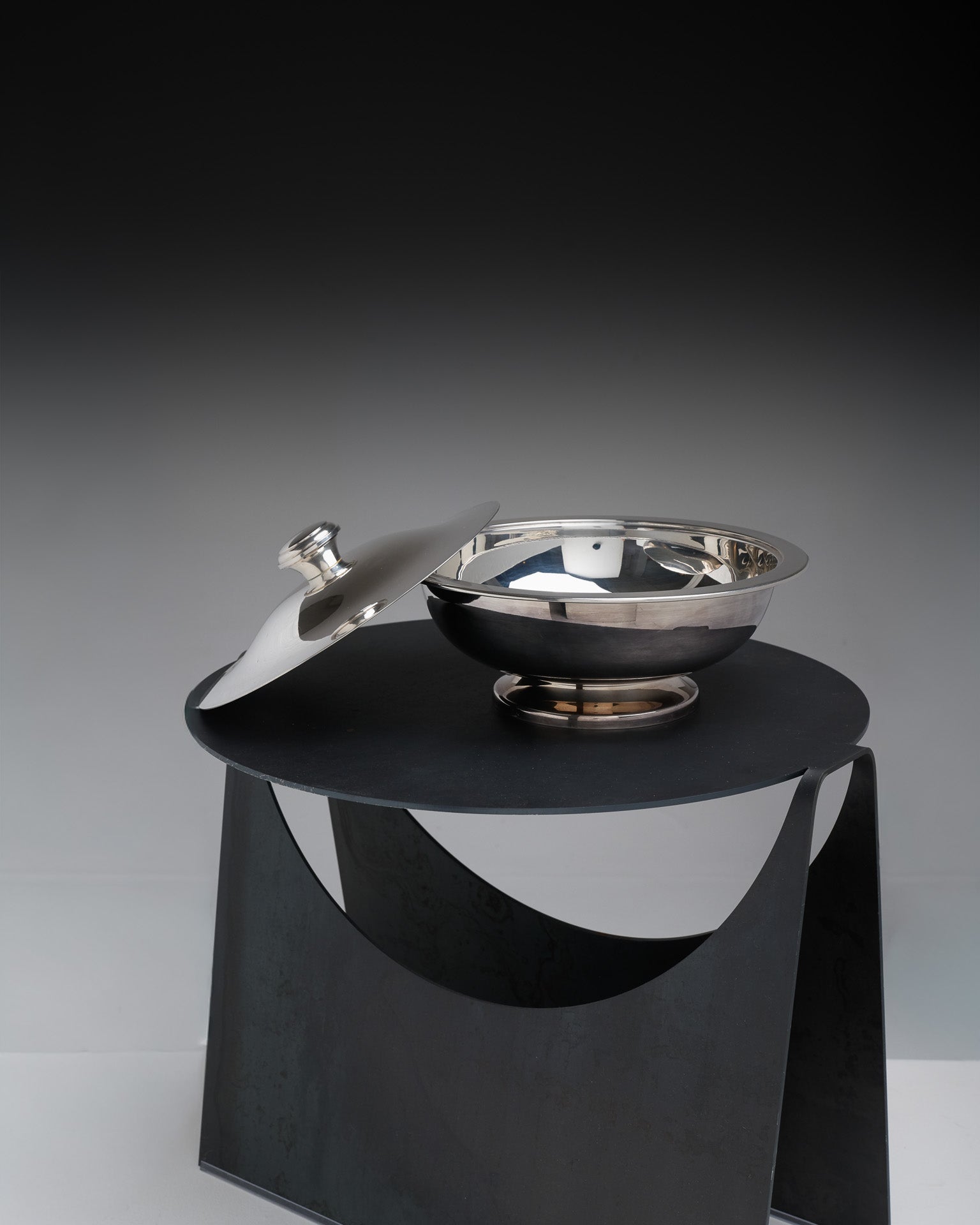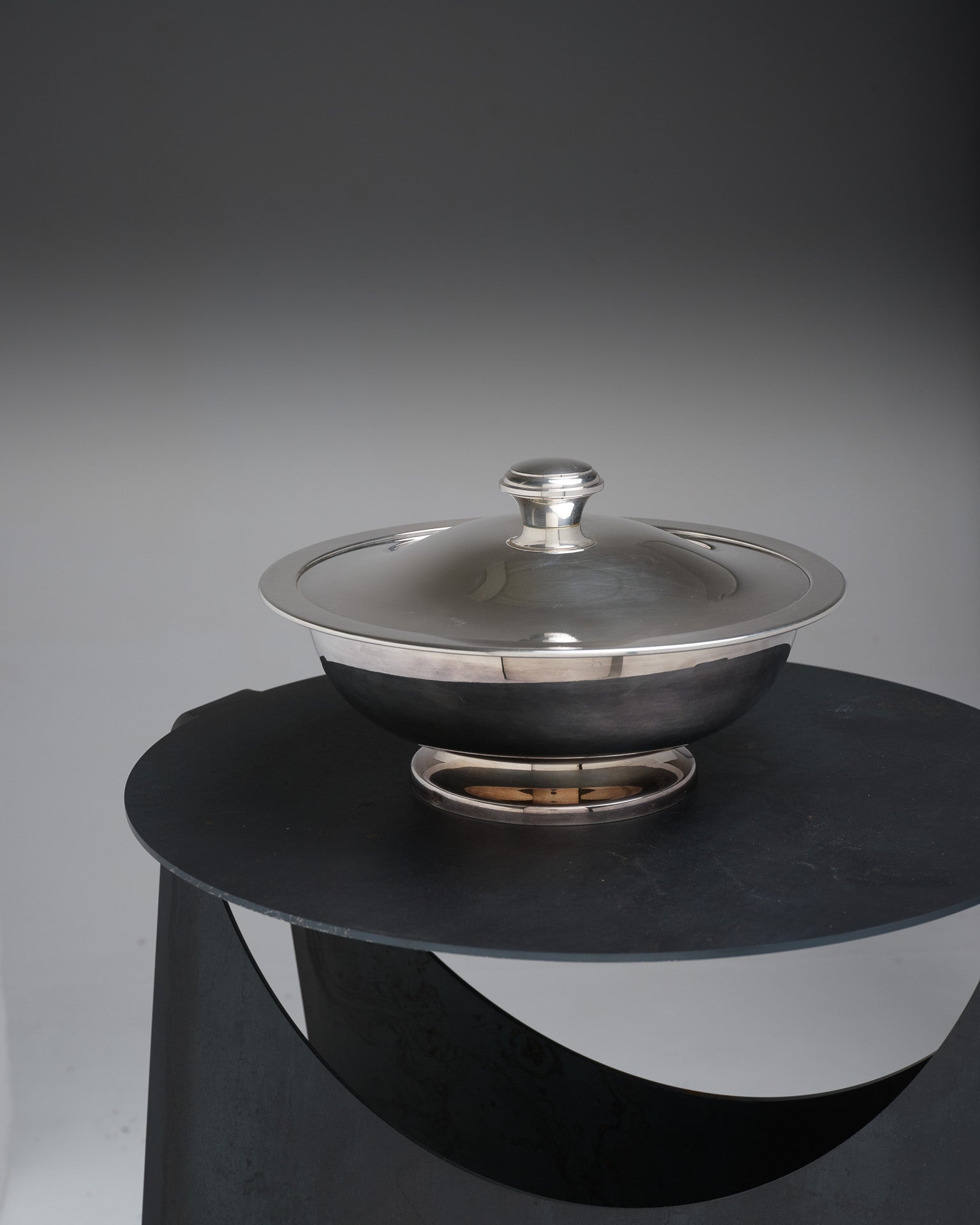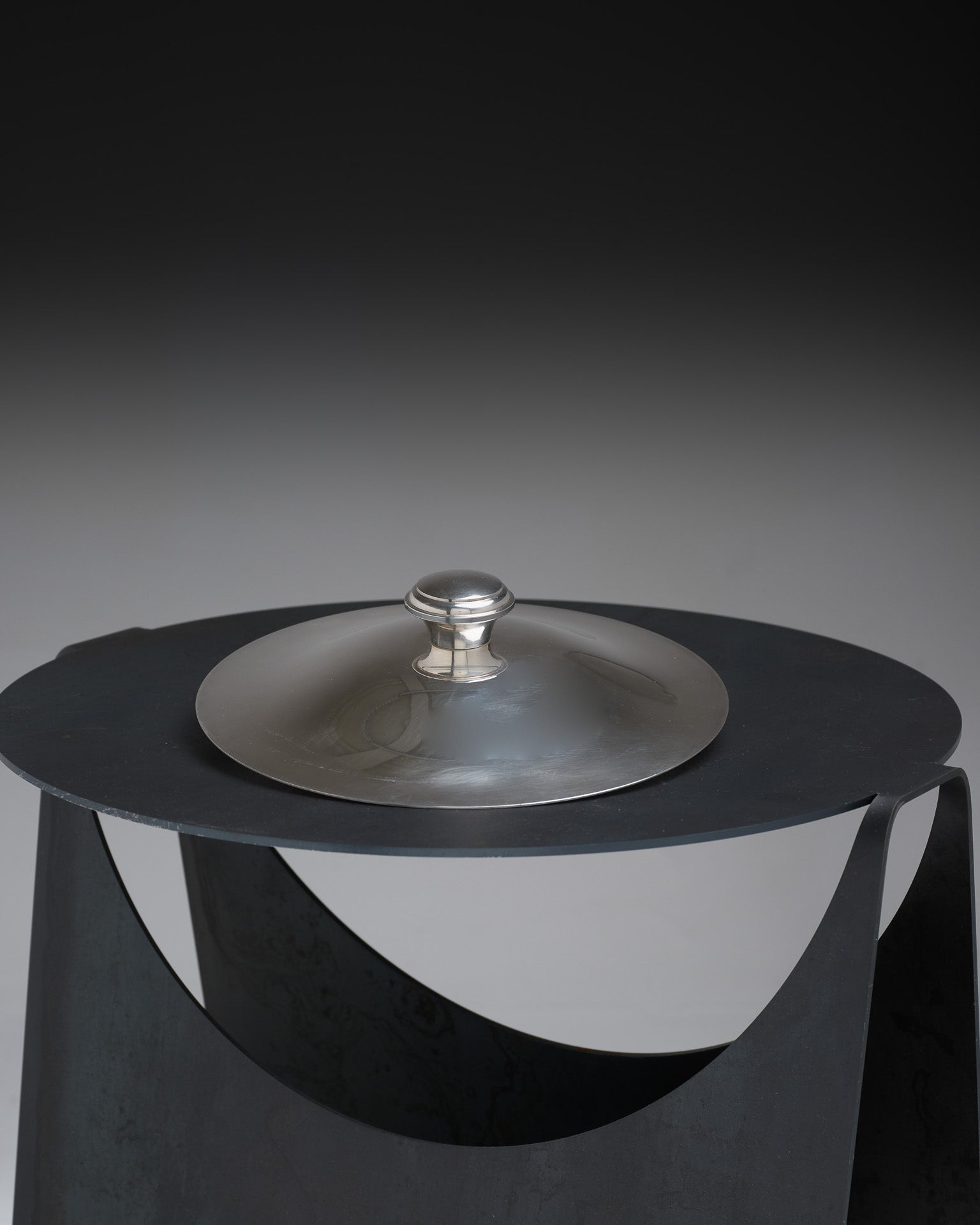 Légumier en métal de forme circulaire de l'orfèvre Saint Médard, travail des années 1970. Couvercle assorti, muni d'un bouton central. le corps repose sur un pied circulaire. Dans le gout moderniste mid-century. Poinçonné sous le couvercle.
