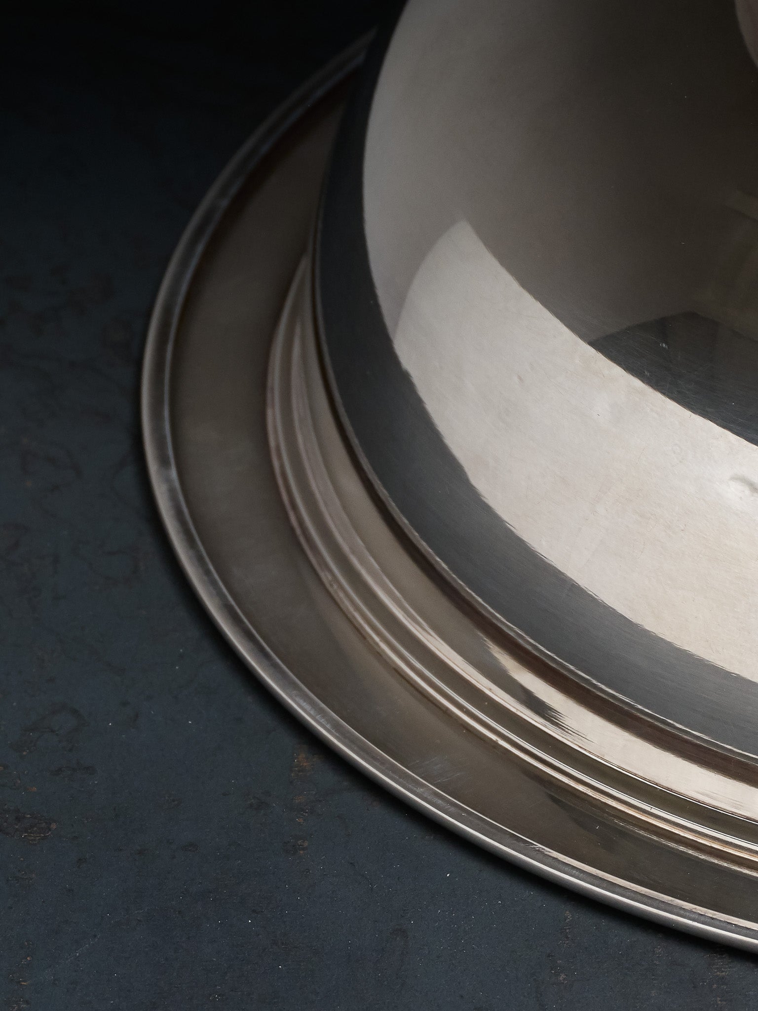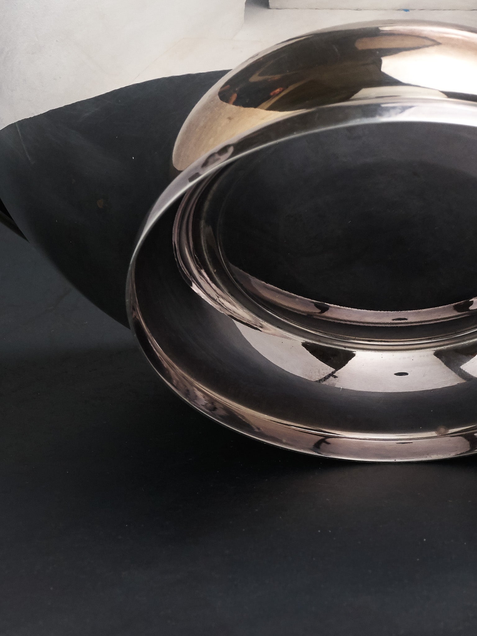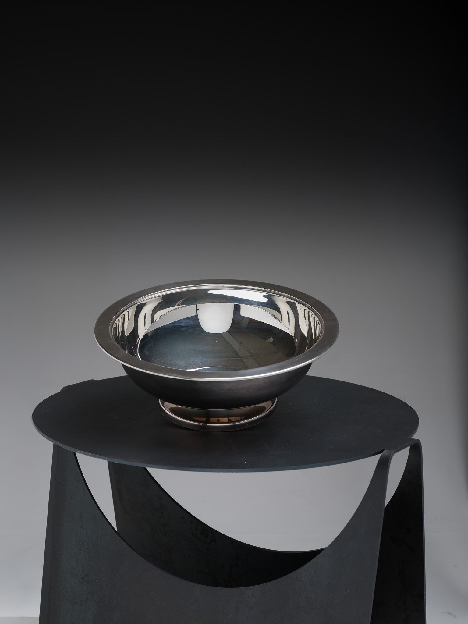 Légumier en métal de forme circulaire de l'orfèvre Saint Médard, travail des années 1970. Couvercle assorti, muni d'un bouton central. le corps repose sur un pied circulaire. Dans le gout moderniste mid-century. Poinçonné sous le couvercle.