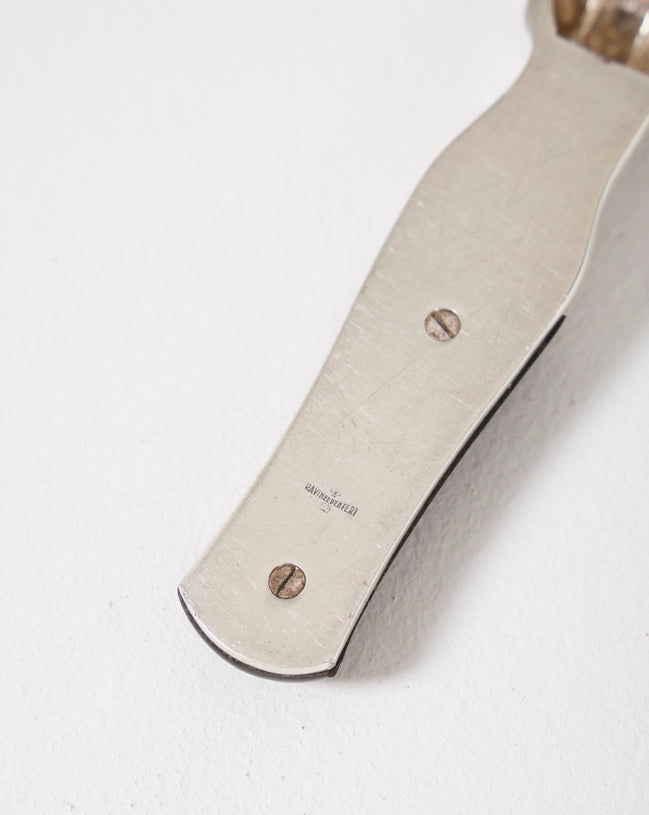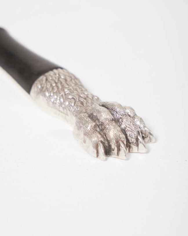 A bottle opener shaped like a lion's paw, made of silver-plated metal with a wooden handle, produced by the French silversmith Ravinet d'Enfert. Hallmark present under the handle. Made in the 1950s. Very good condition.