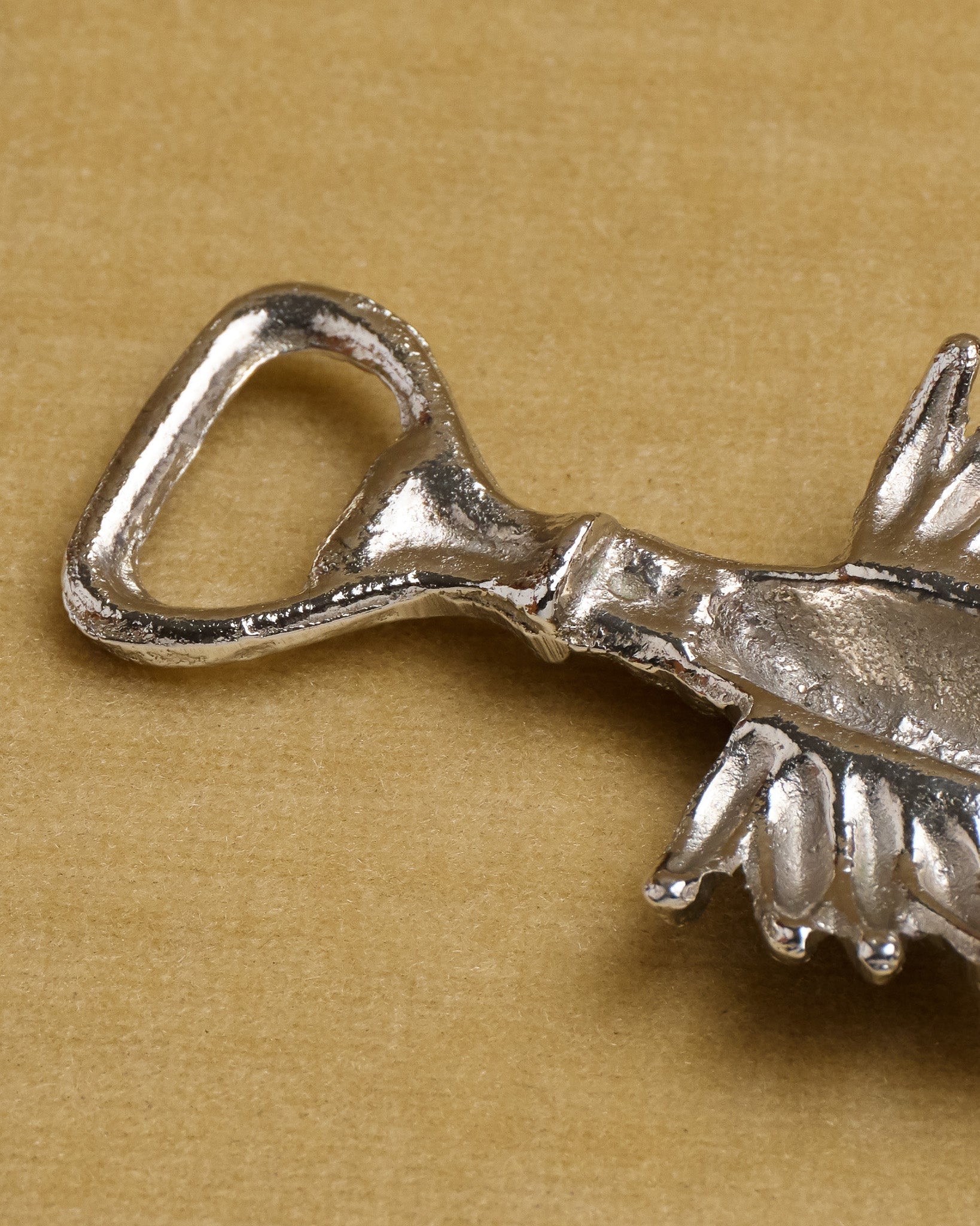 Chrome-plated metal bottle opener in the shape of a lobster. The body, claws, and legs are finely molded. A ring at the rear end allows for opening bottles. Made in the 1960s. Very good overall condition.