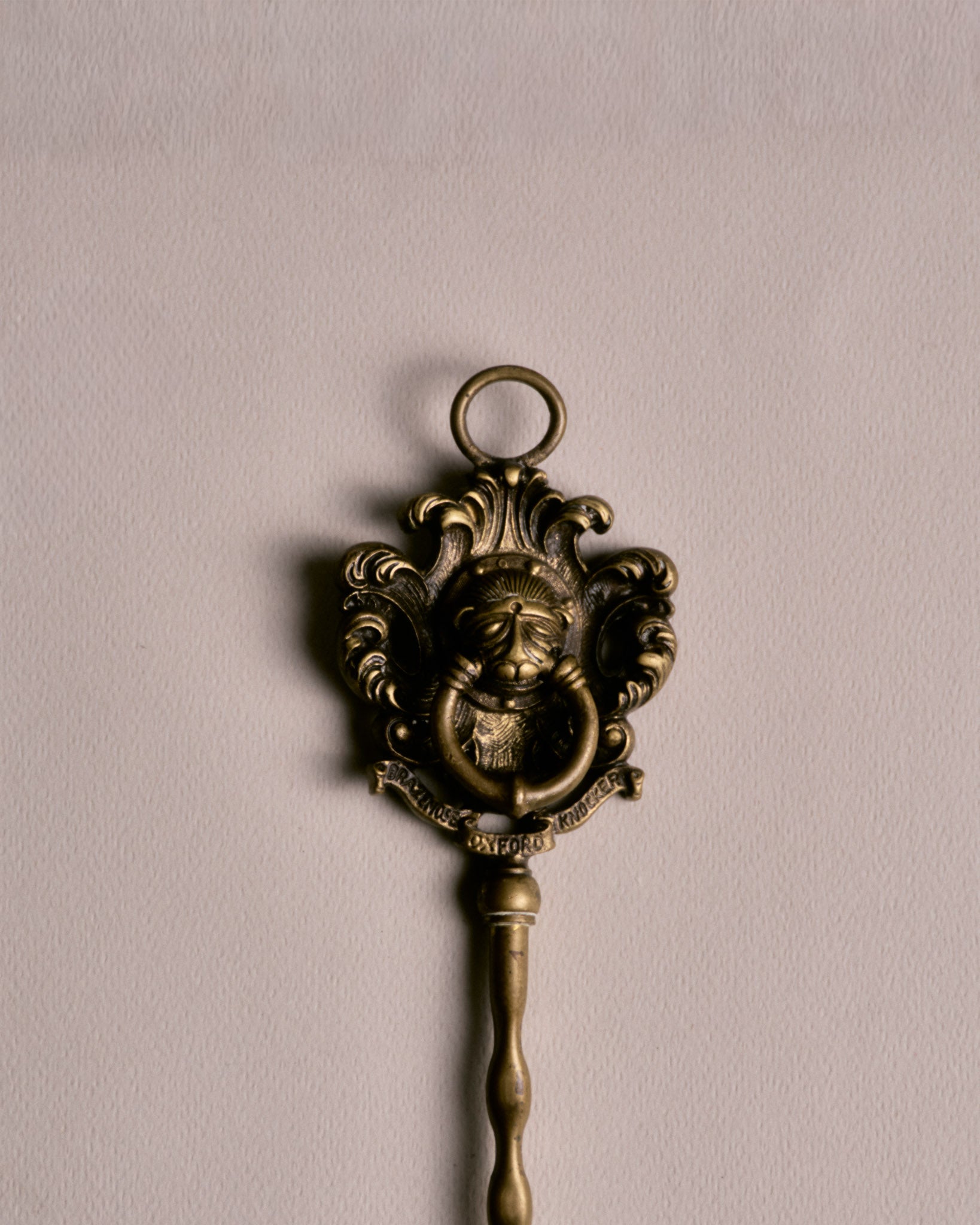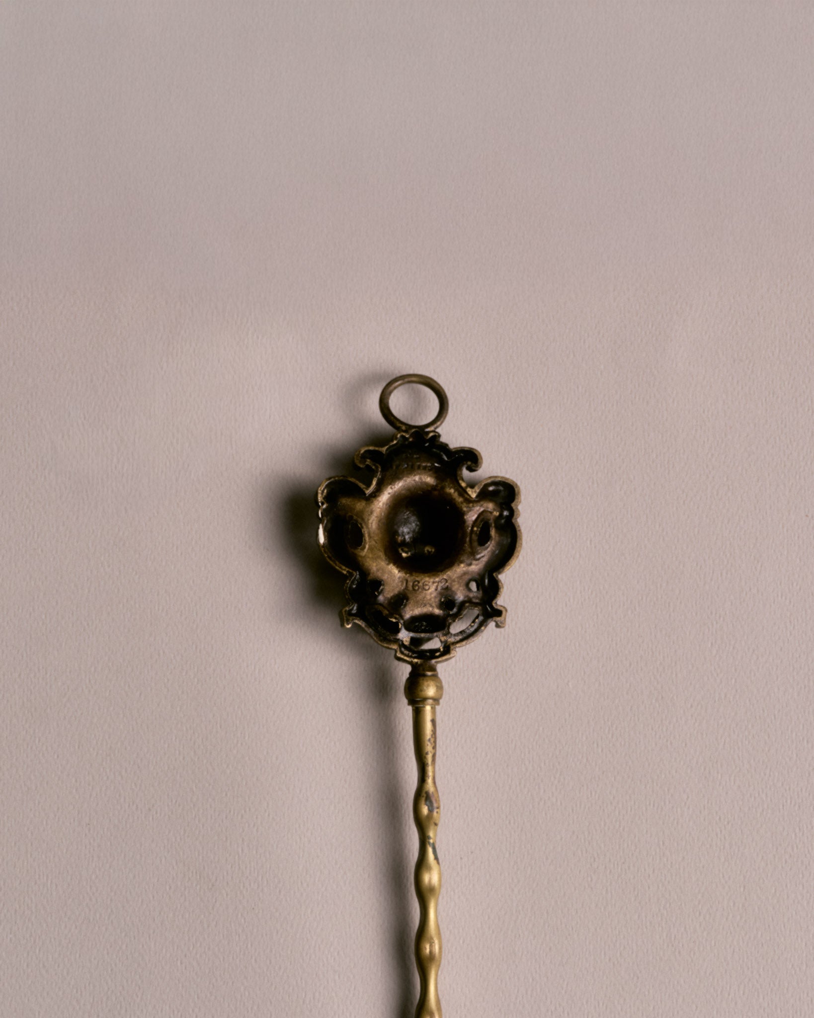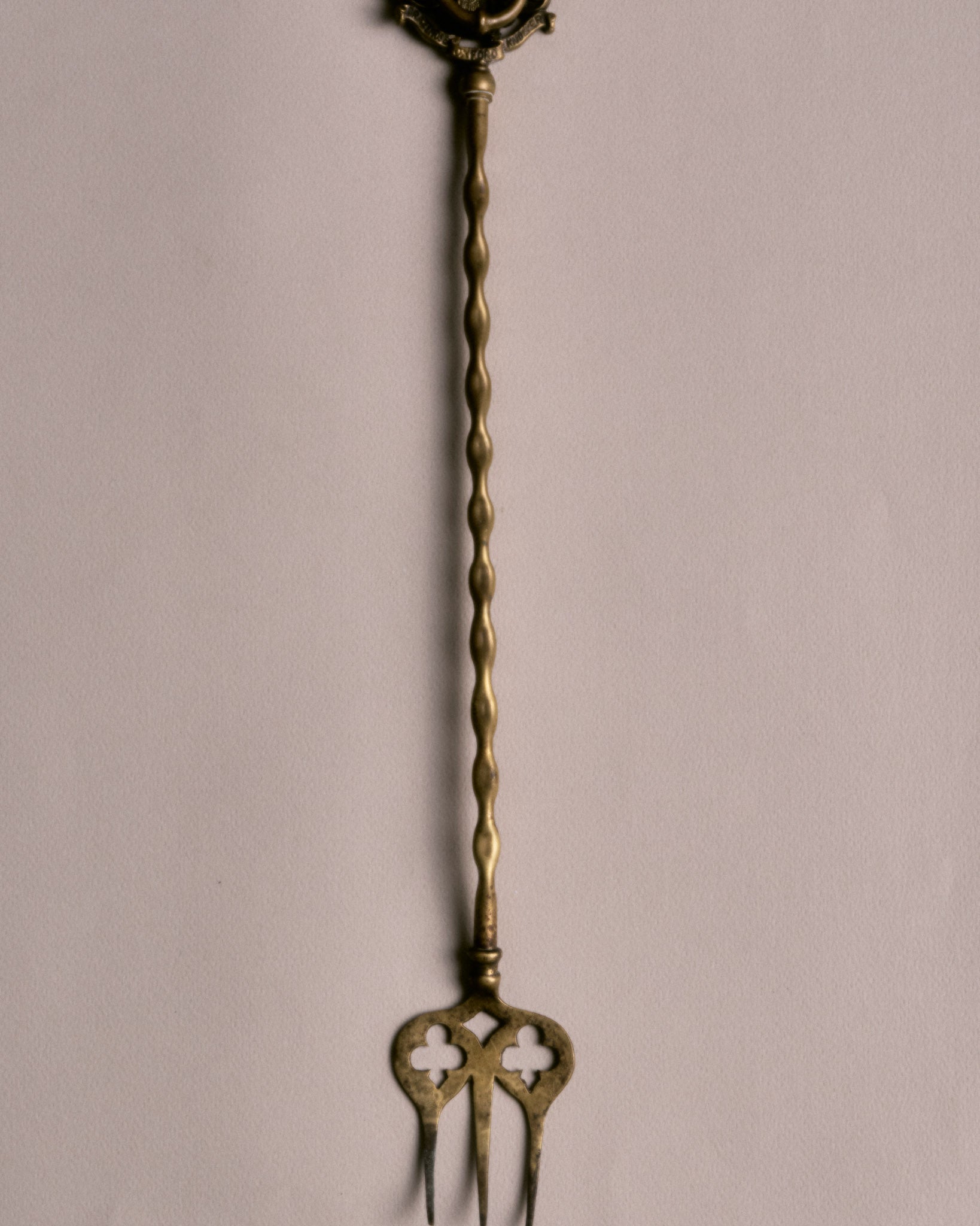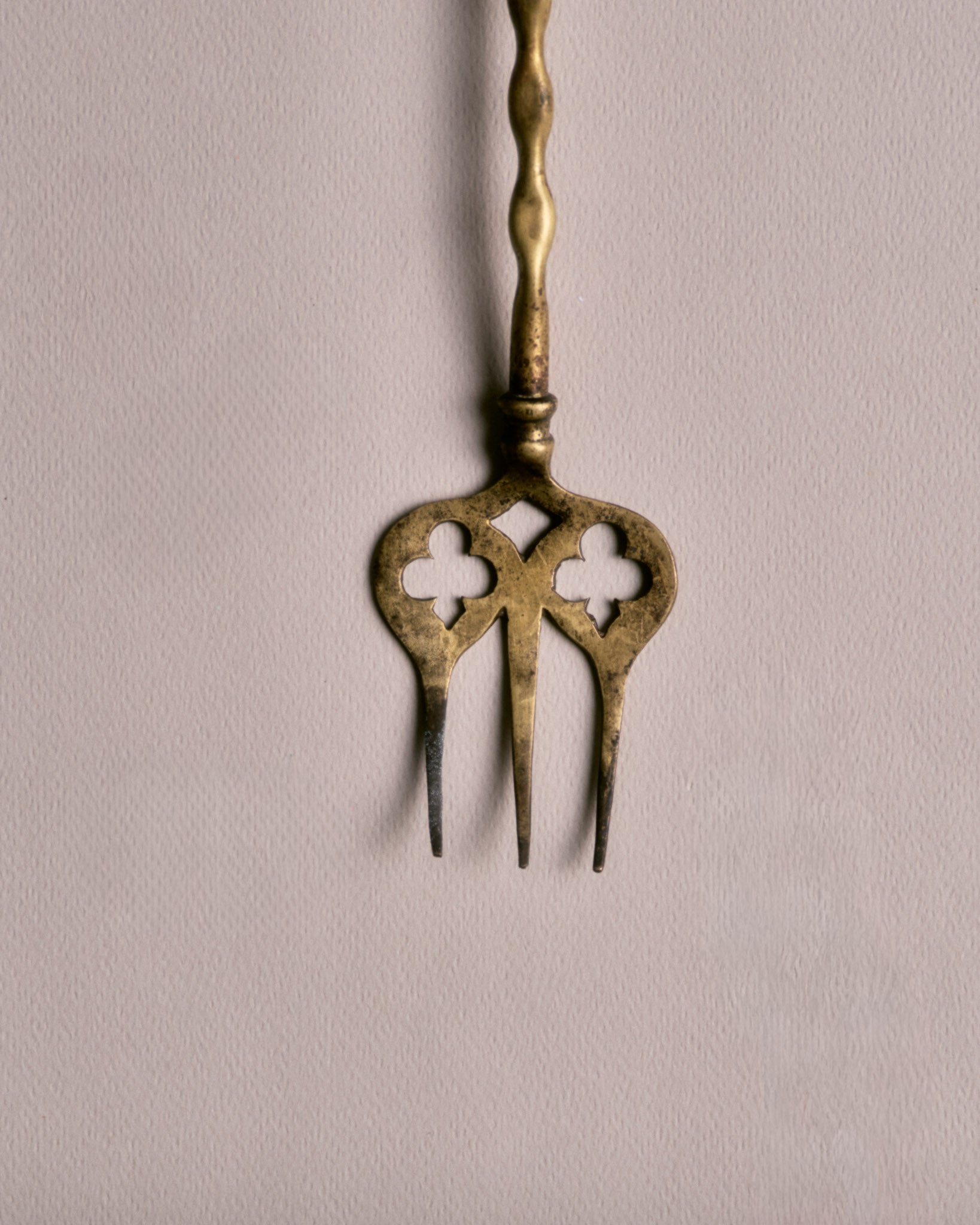 A gilt brass brazier with a twisted handle and an openwork trident decorated with a clover motif. The base is adorned with a baroque mascaron surrounded by stylized scrolls and foliage.