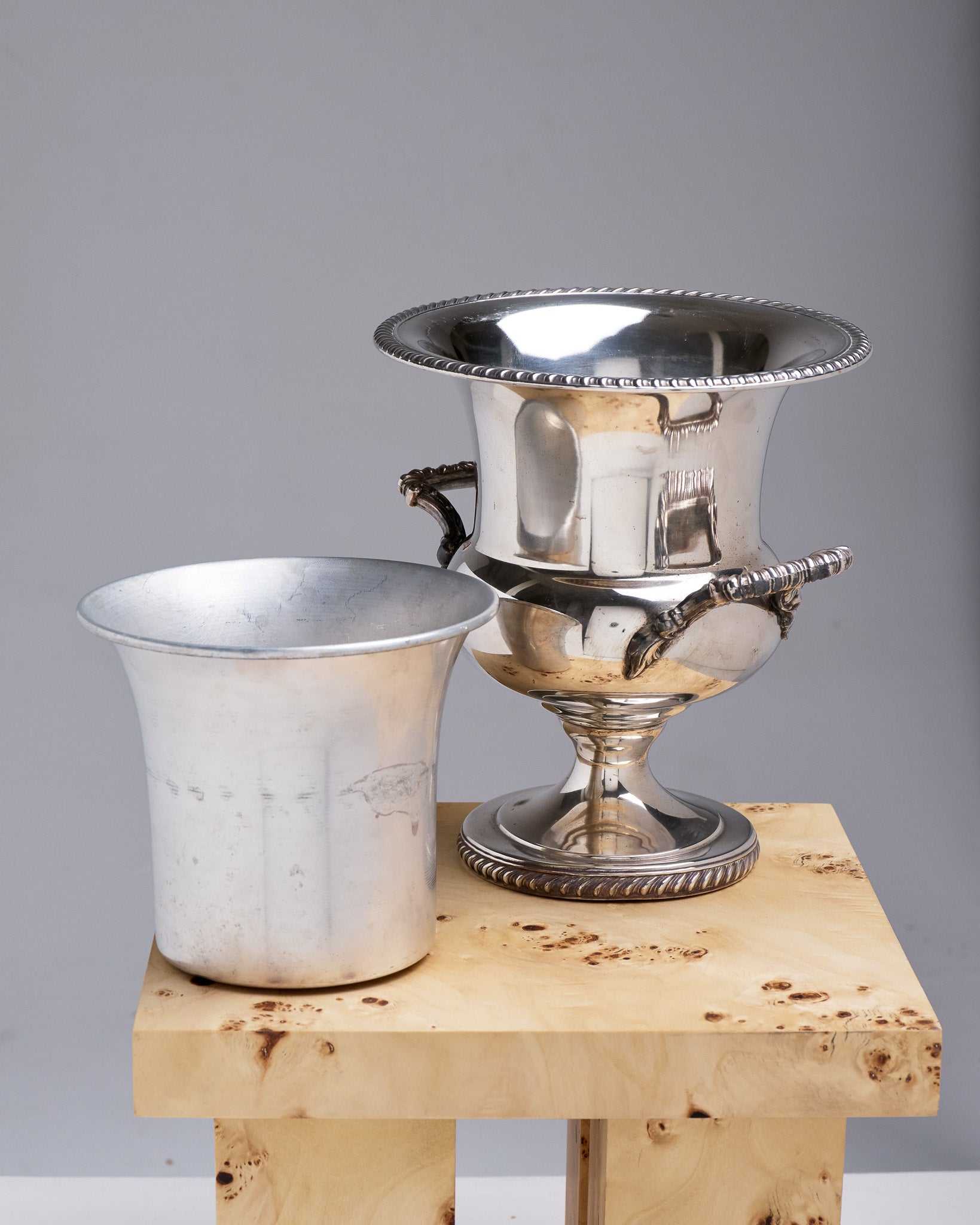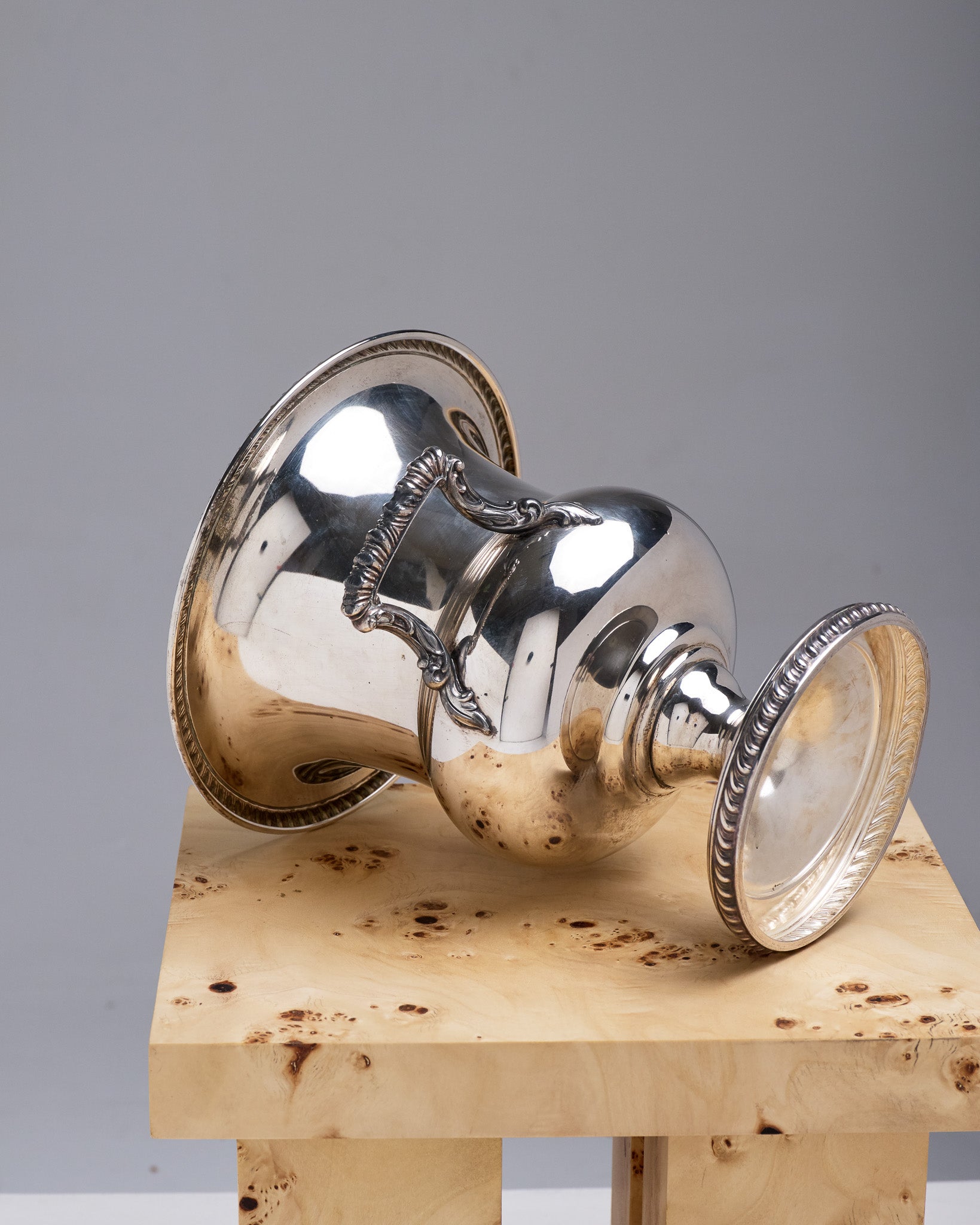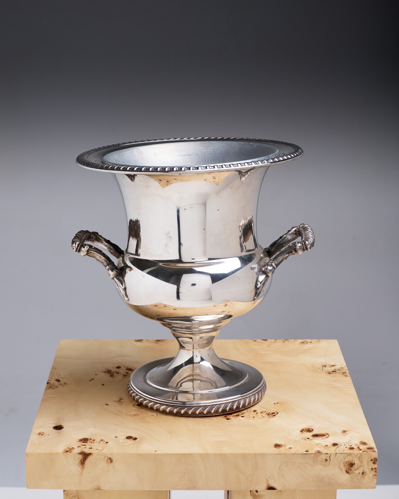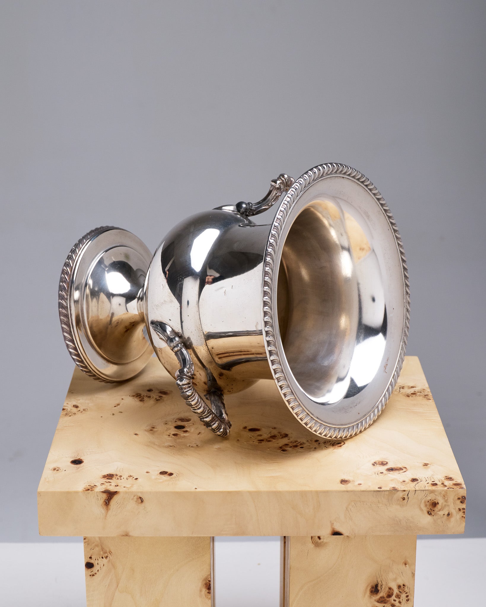 A silver-plated champagne bucket in the Medici style, decorated with gadroons in the English style. Composed of two parts, the bucket has a metal cover for easier cleaning. In good overall condition. The patina is present and consistent with its age and use.