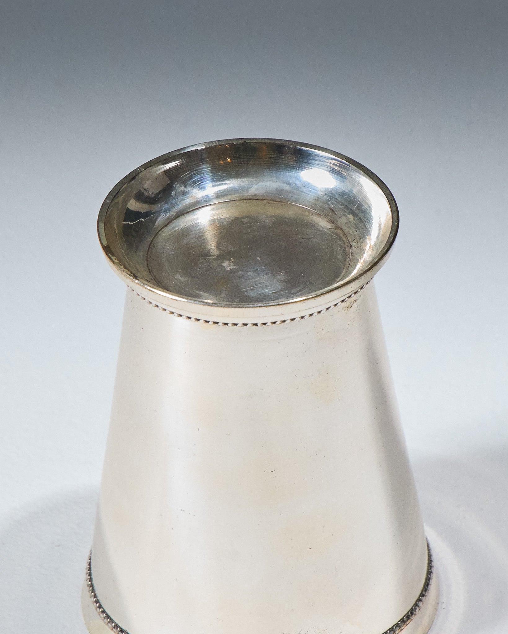 A slightly conical metal cup with a smooth surface. The rim and foot are highlighted with a beaded border; a piece from the 1950s. In very good condition.