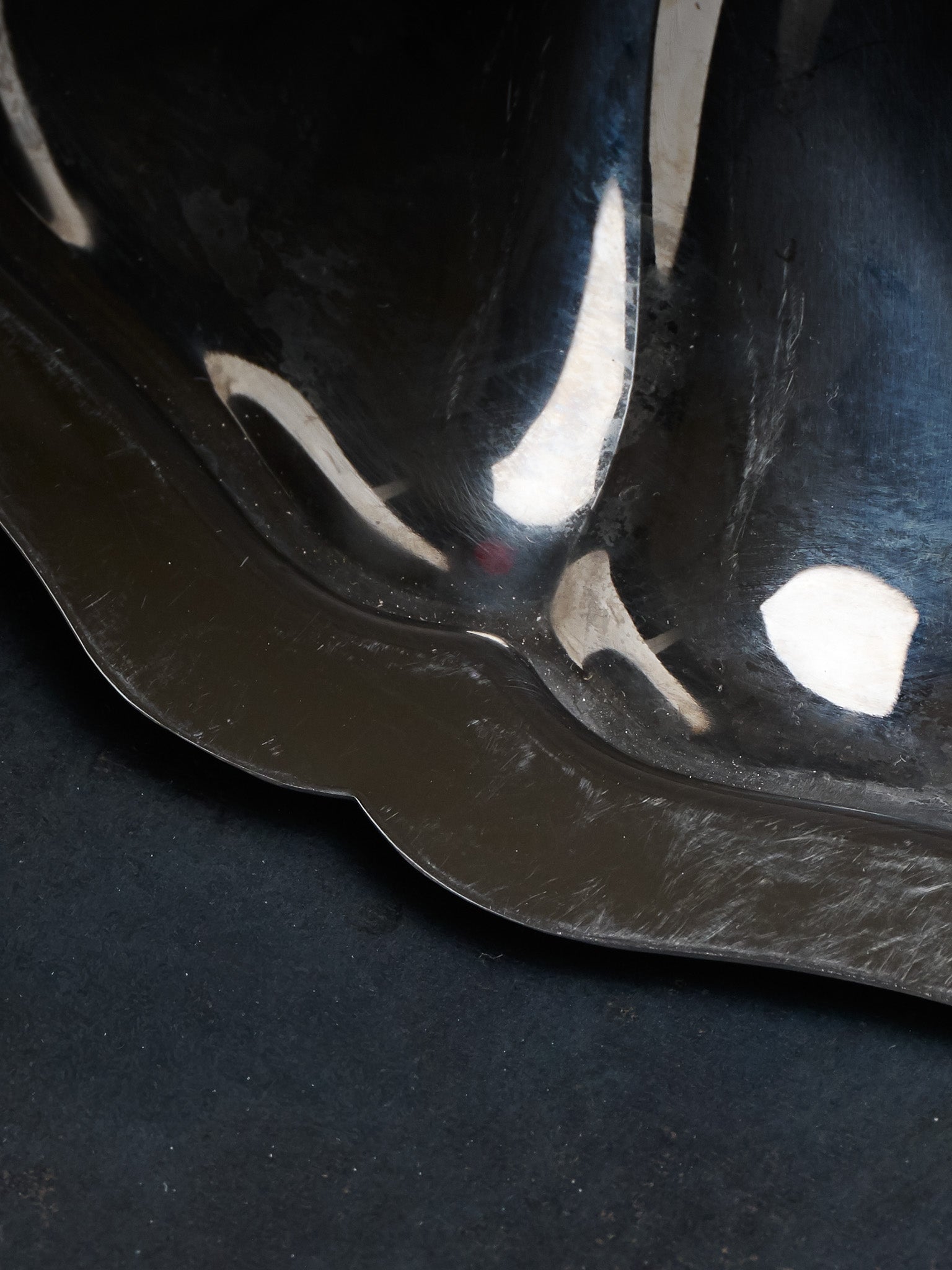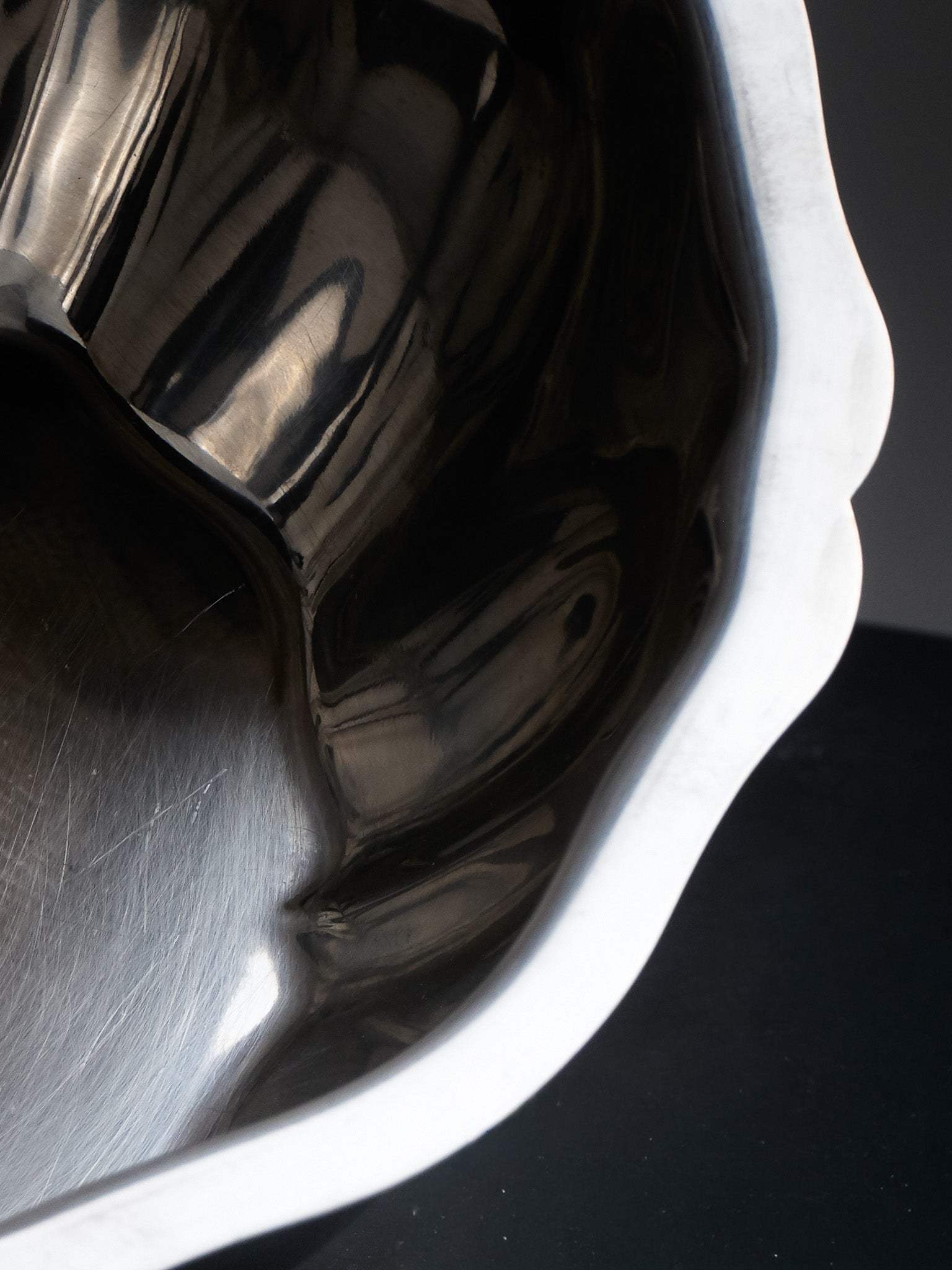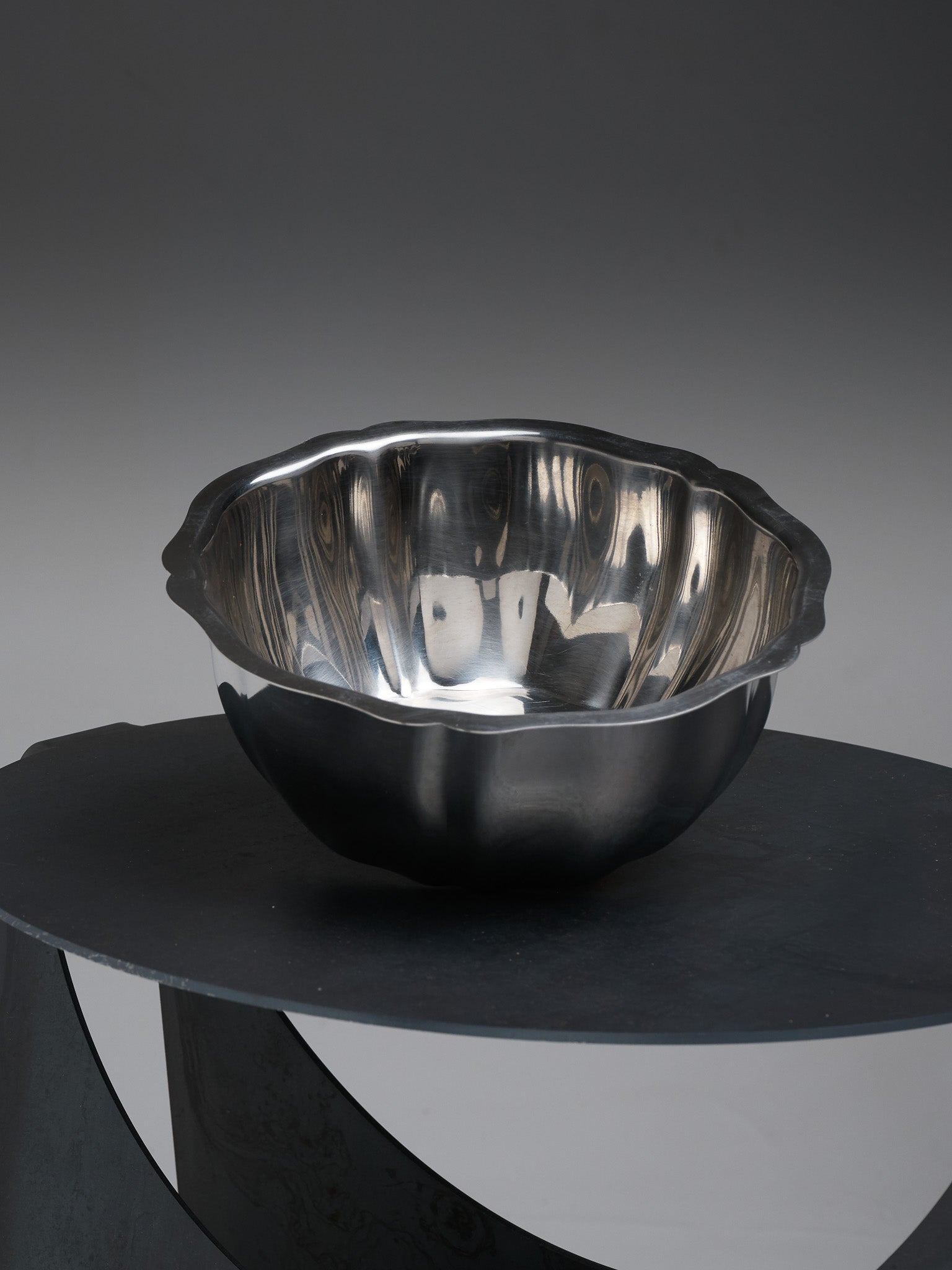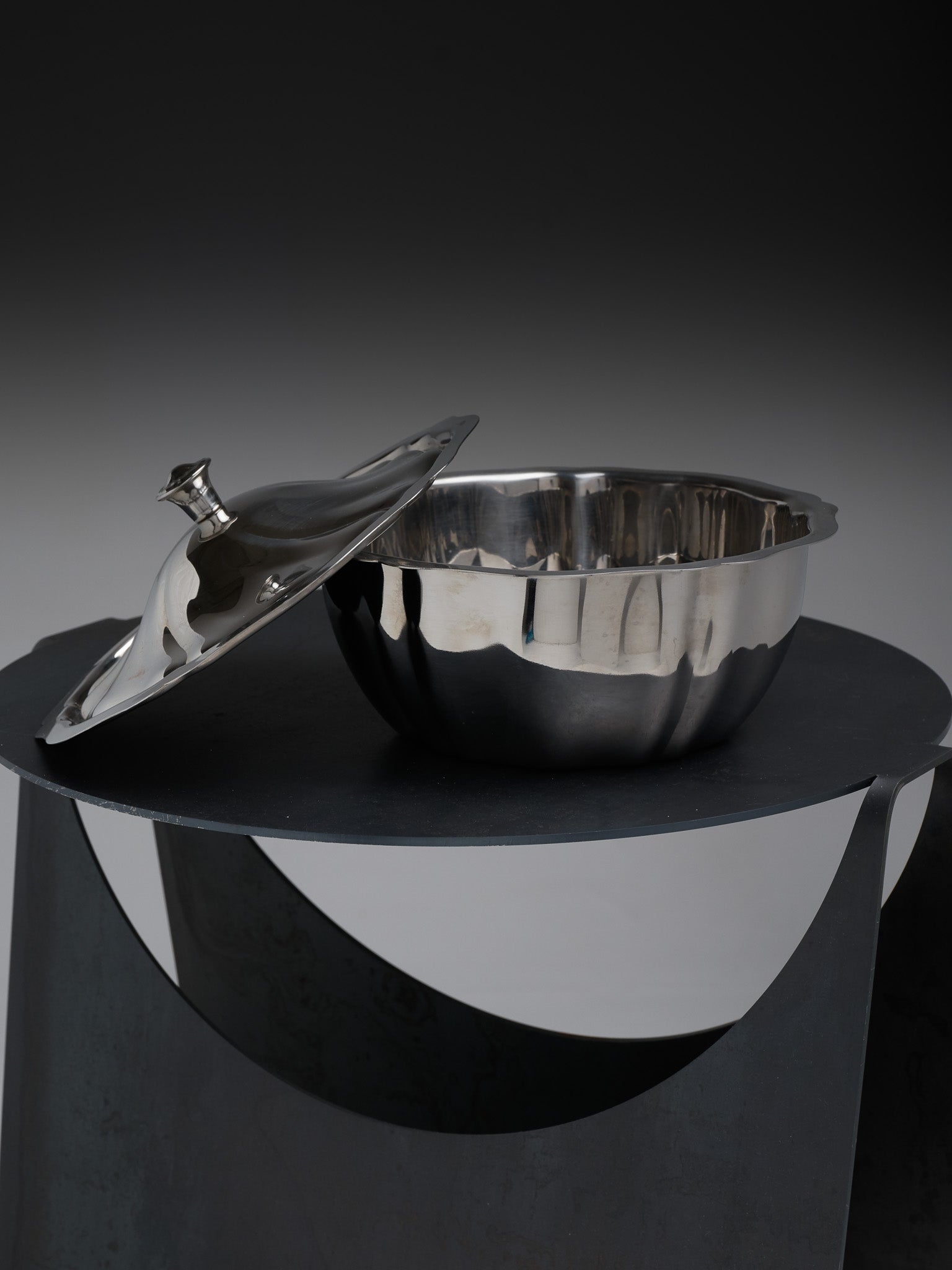 A circular metal vegetable dish, dating from the 1970s. It features a body with vertically scalloped sides and a regularly shaped rim. It rests on a slightly flared, ring-shaped base. The matching domed lid is decorated with radiating scallops and fitted with a central baluster-shaped knob.