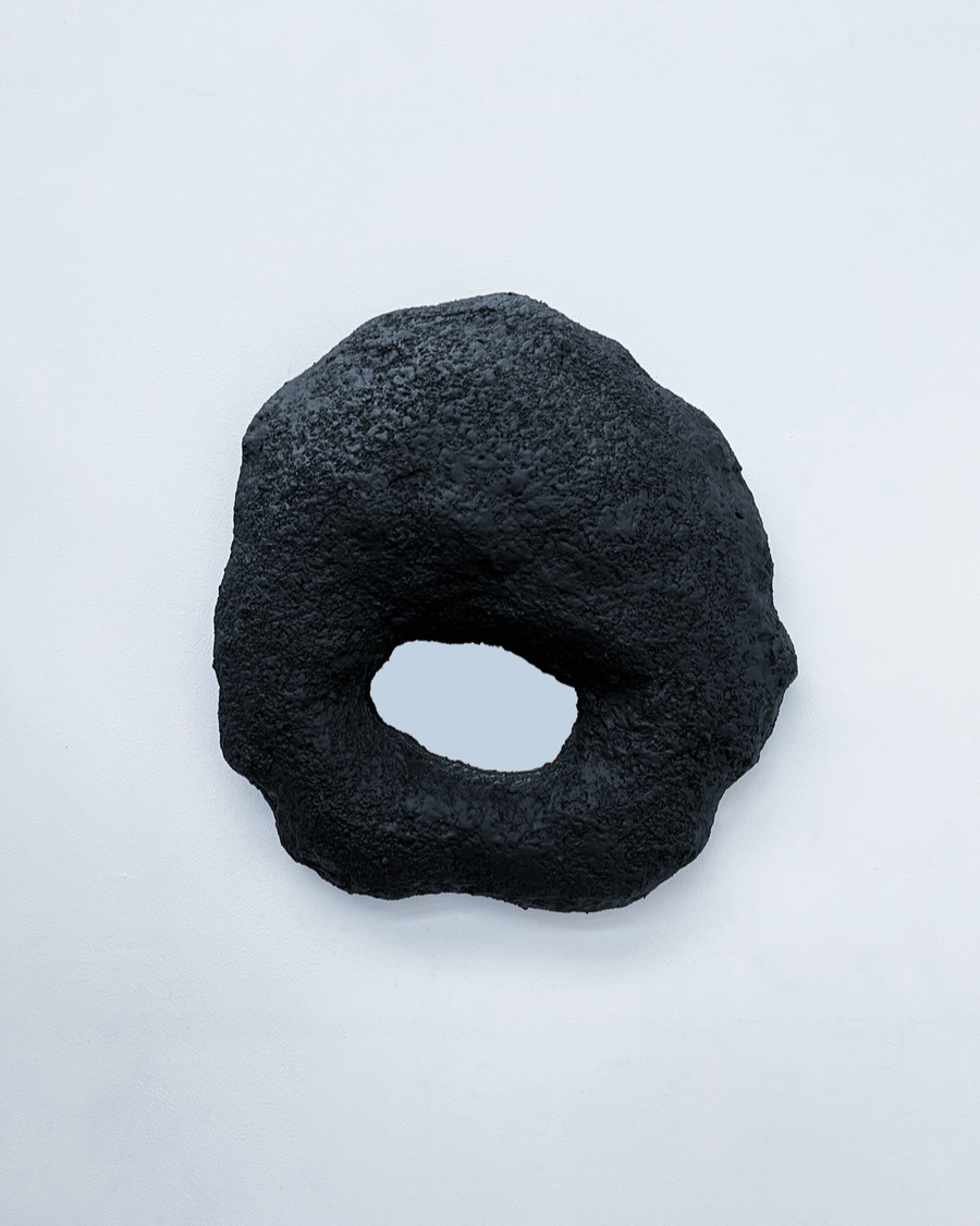 The "ROCASEUS 10" mirror by architect and designer Paul Hardy. Organically shaped, the mirror is made of plaster and light gray sand, studded with pieces of glass. Paul Hardy's work is distinguished by its use of repurposed building materials such as sand, plaster, wood, and glass.