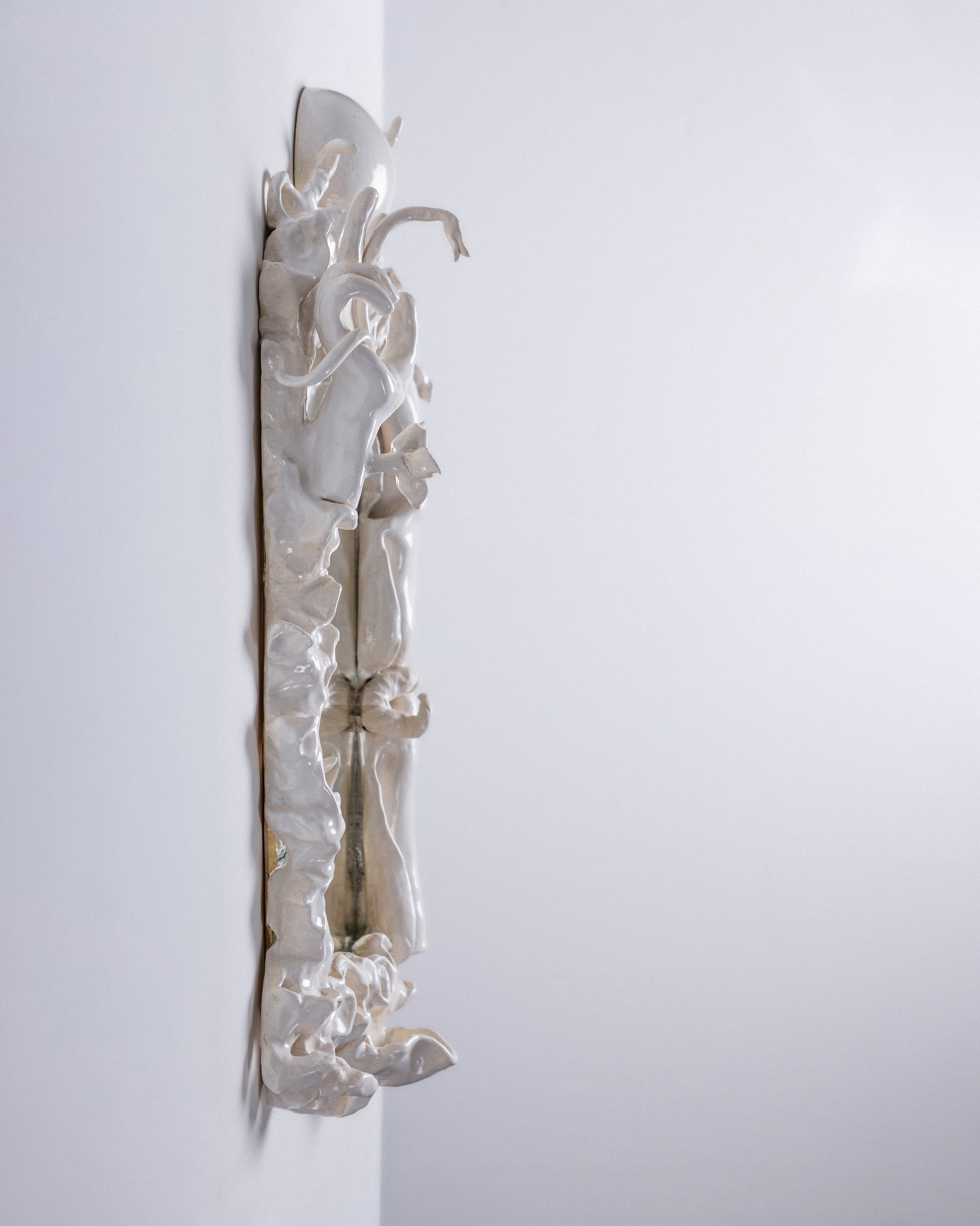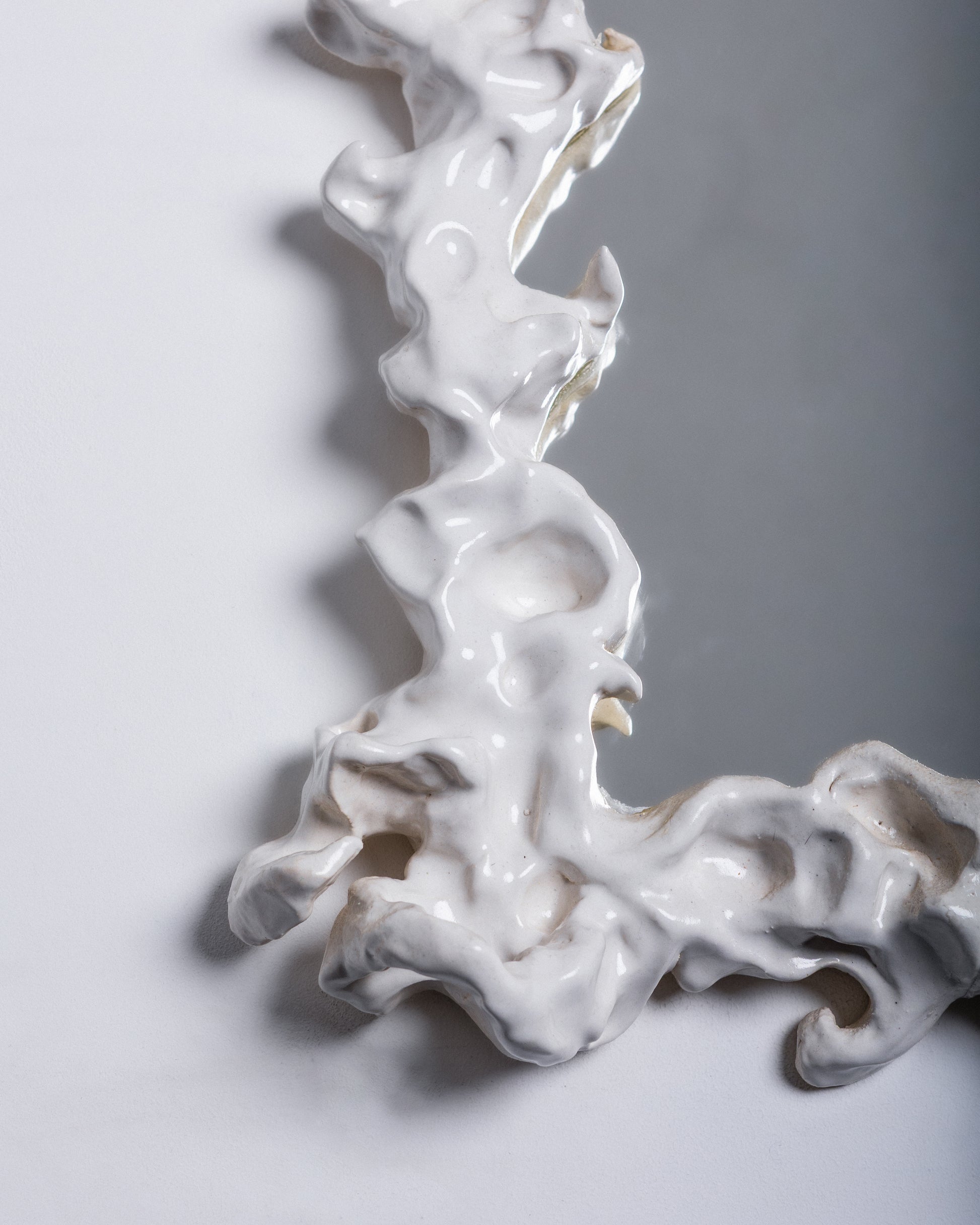 Wall mirror ' Self-sufficiency, Portrait of a self-healing' in white glazed ceramic by Lucile Rebeirot. Sculptural frame in relief, handmade using traditional slab-building techniques.