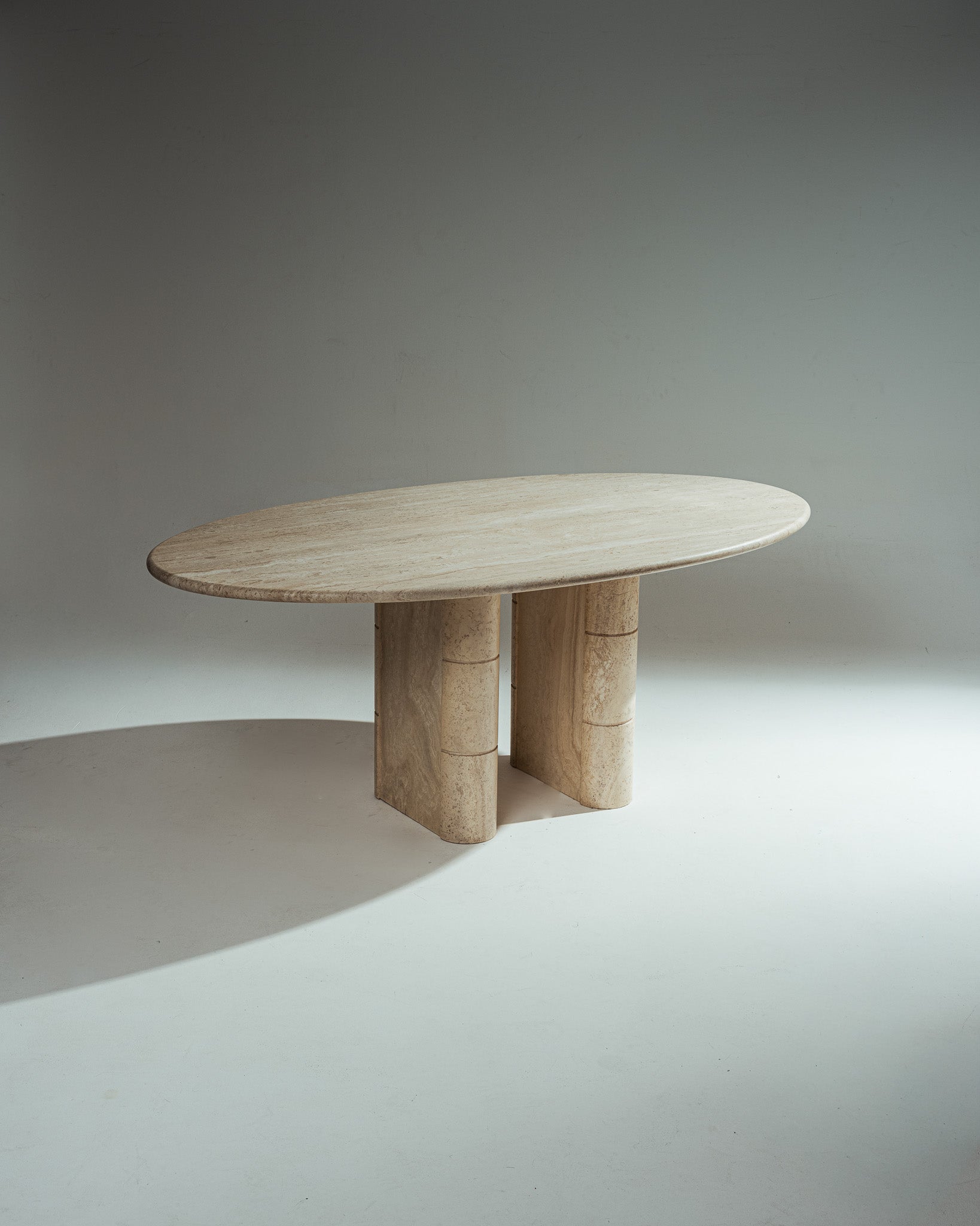 Large oval travertine dining table published by Roche Bobois in the 1970s. The oval top rests on a sculptural base composed of intersecting oblong volumes, creating a restrained yet assertive architectural balance. Good overall condition.