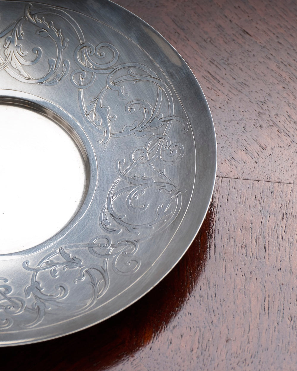 Pair of cups and saucers, featuring red Bakelite handles and silver-plated metal bodies. The engraved decoration combines geometric and floral motifs arranged in a continuous frieze around the cups and saucers, in an Art Deco style typical of the 1930s.