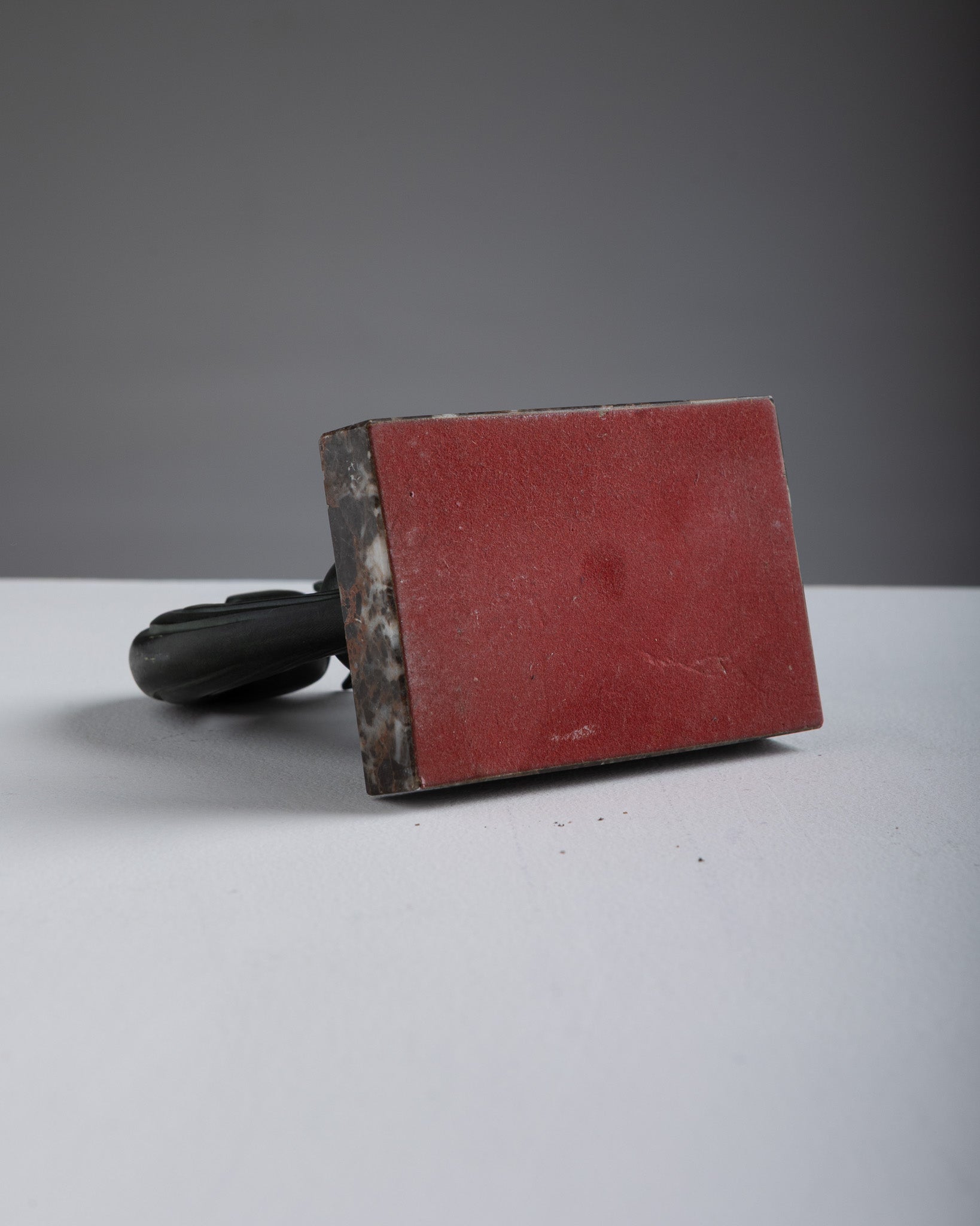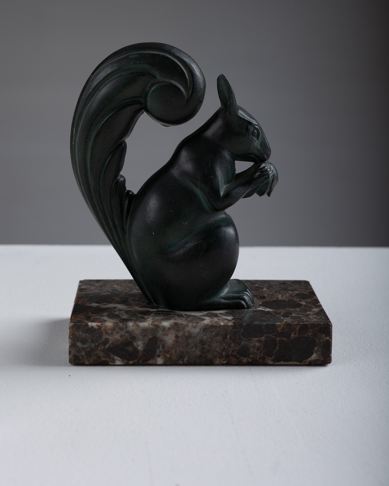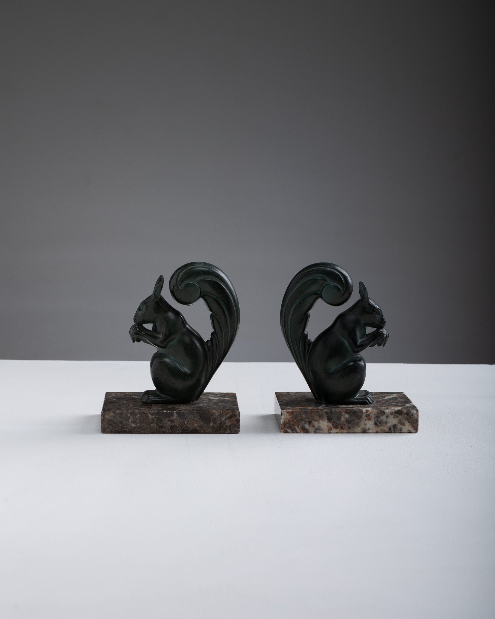 Pair of squirrel-shaped bookends. Bronze sculpture, resting on a rectangular base of brown veined marble with a felt pad underneath. Work in the Art Deco style of Franjou Moreau from the 1930s.