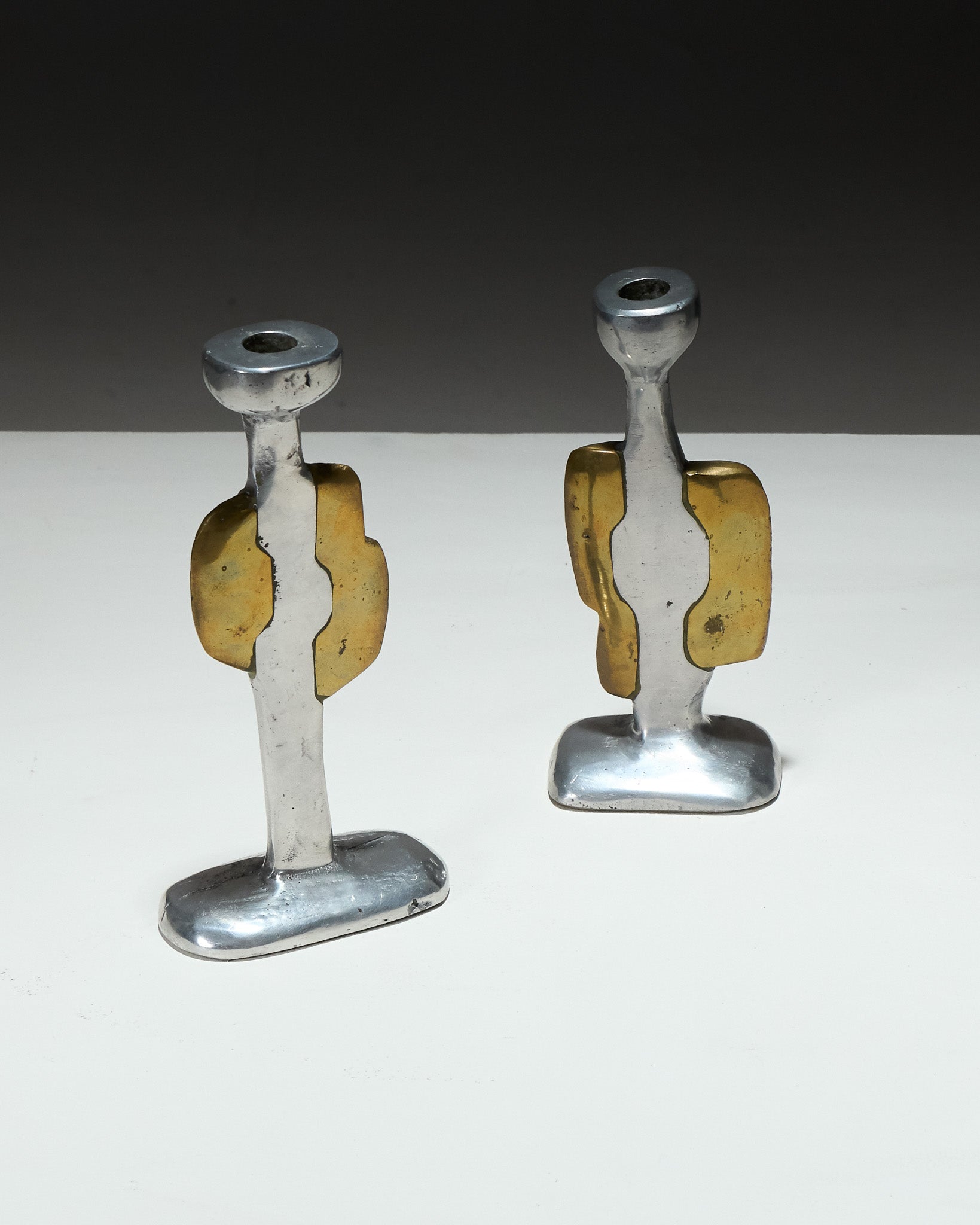 Pair of brutalist candlesticks in the style of David Marshall. Handcrafted in bronze and brass. Textured work typical of the artist. Sculptural design from the 1970s.