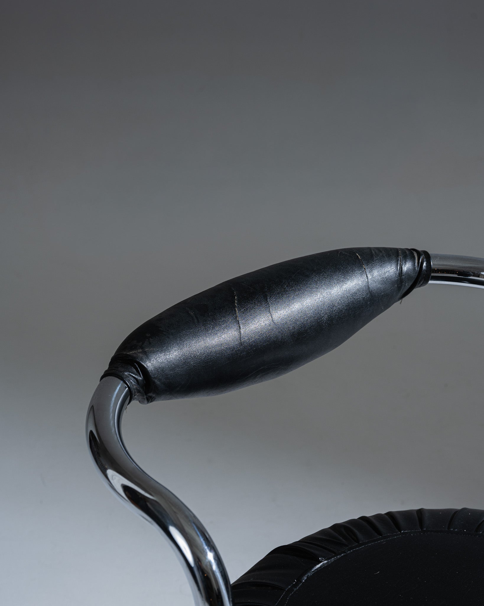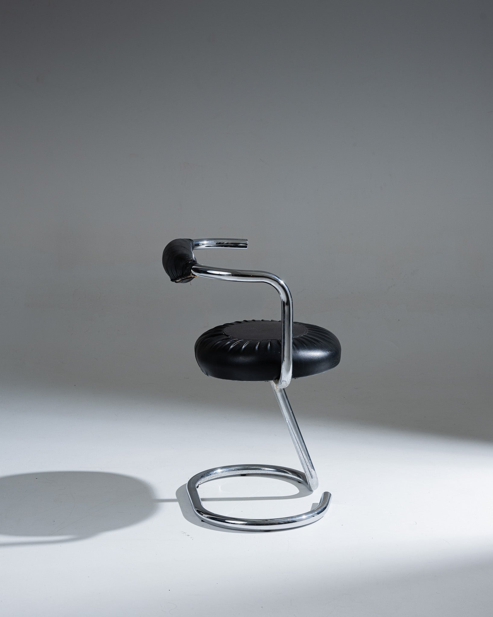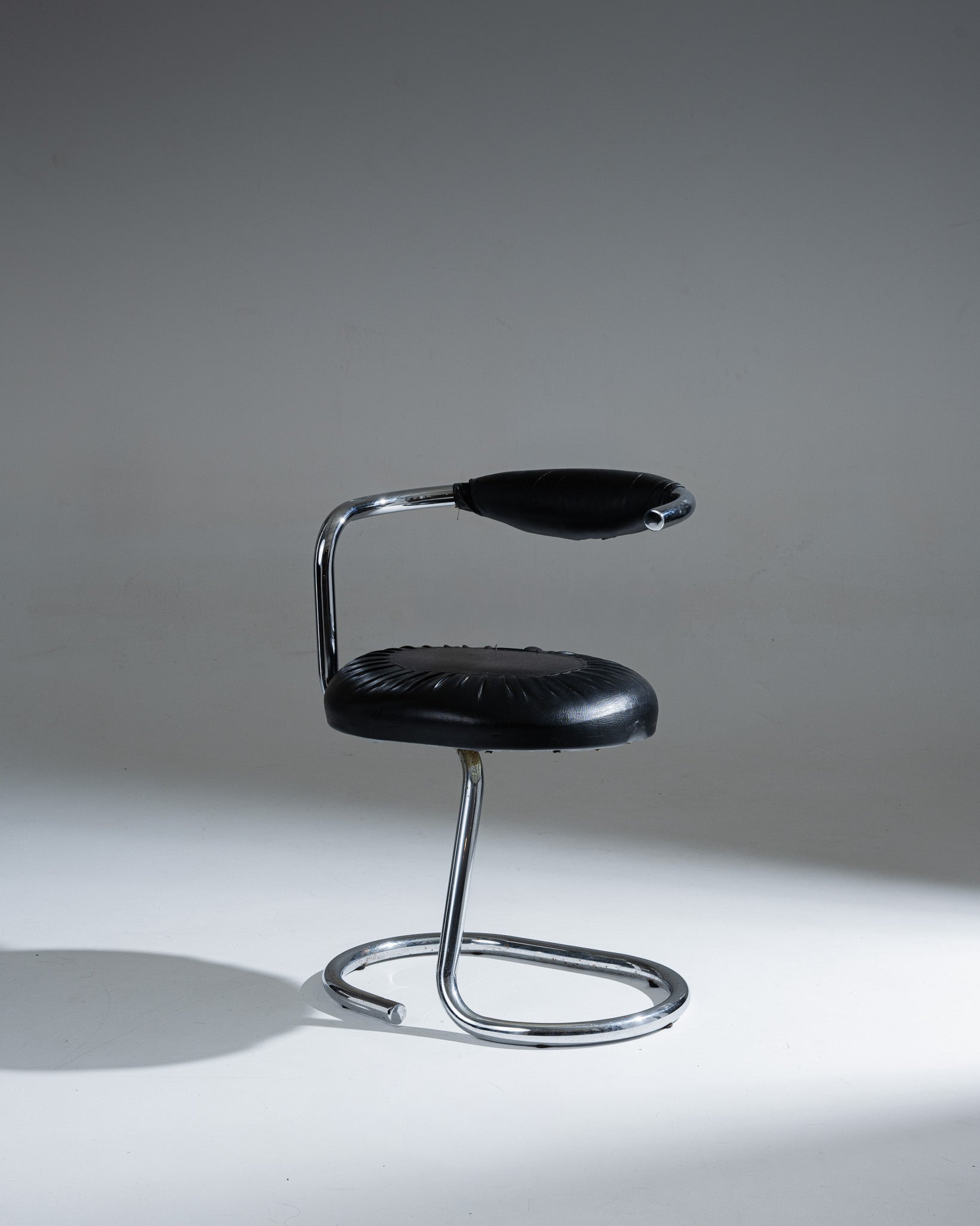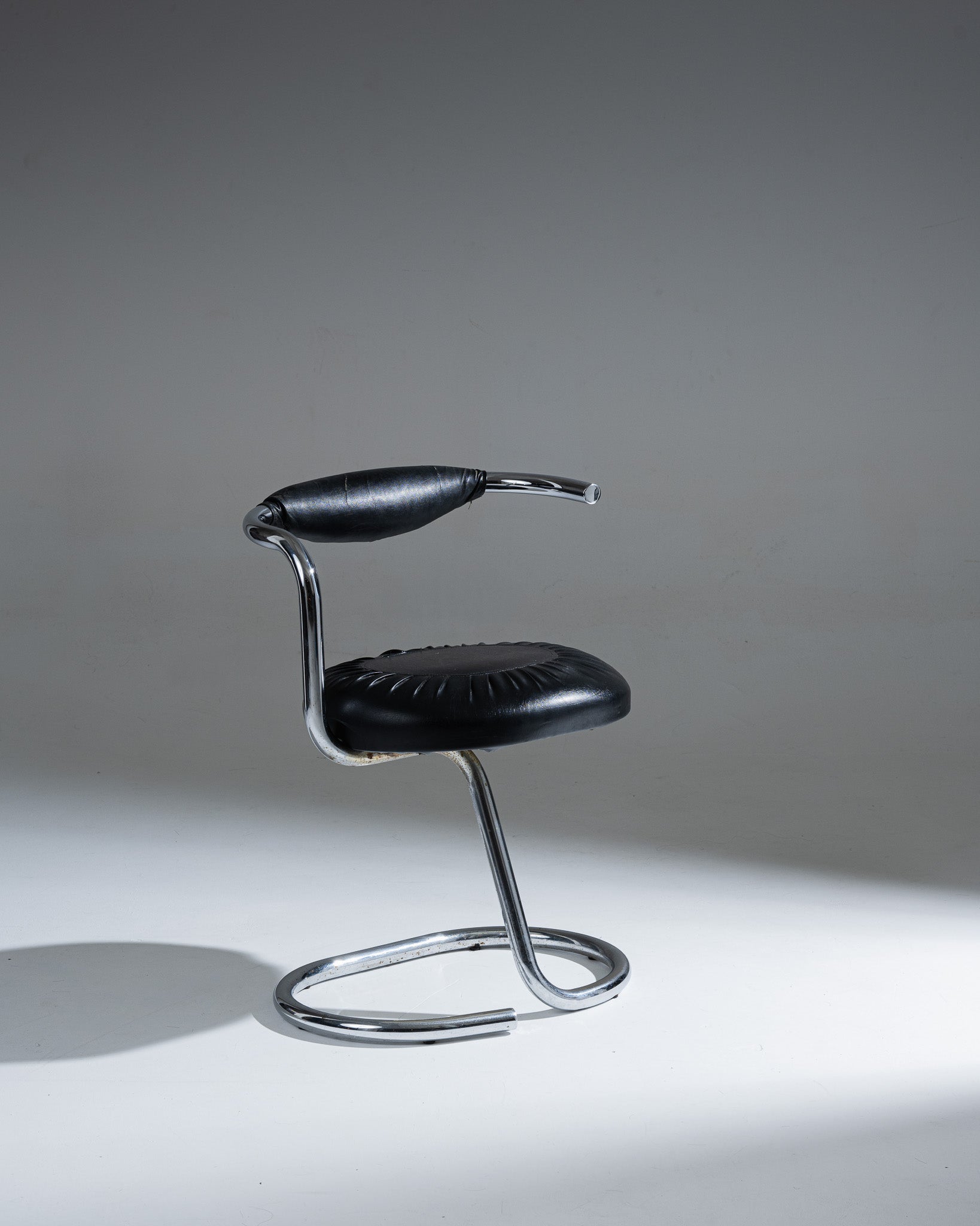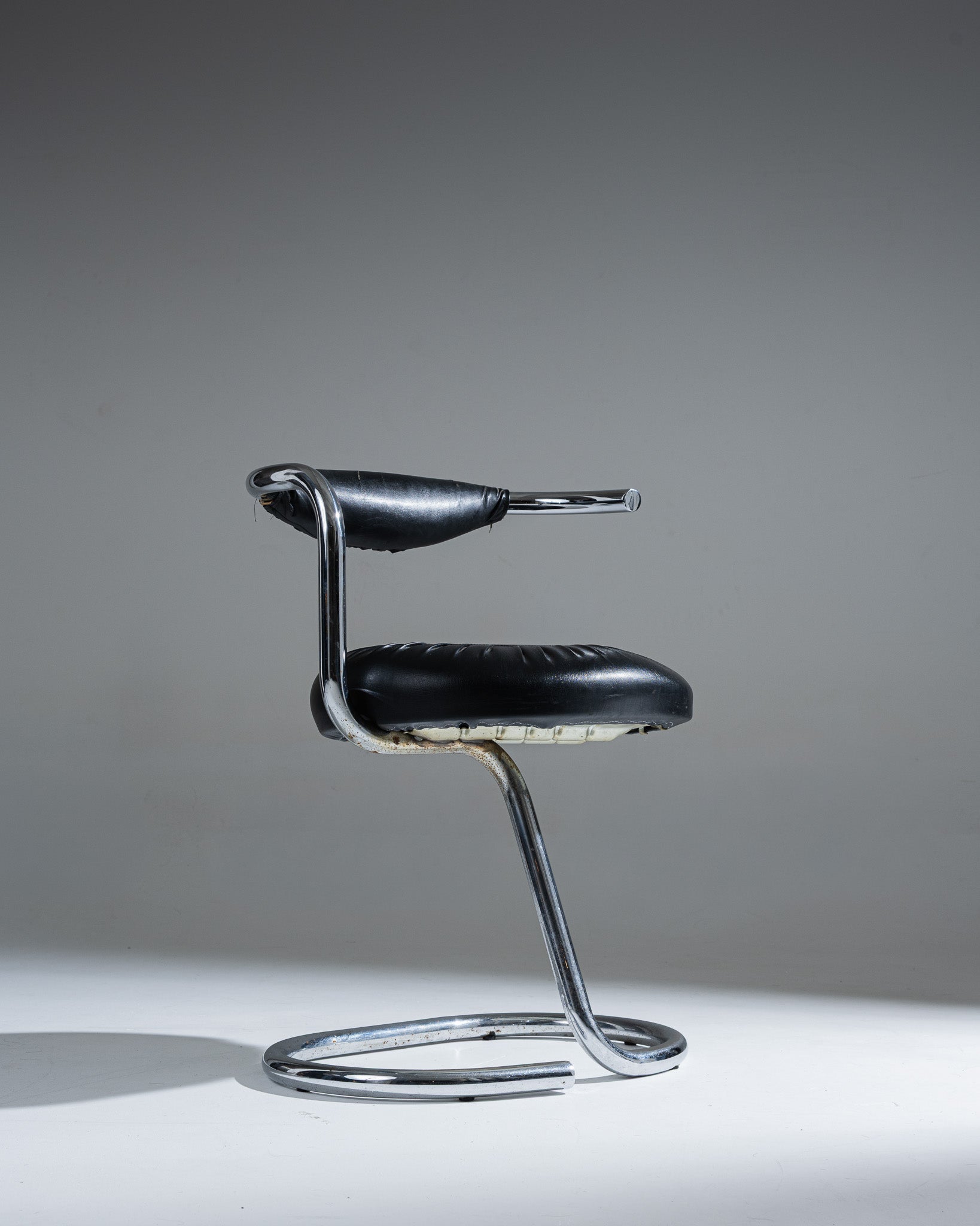 Pair of "Cobra" model chairs by Italian designer Giotto Stoppino (1926–2011). Chromed tubular steel frame, made from a single piece integrating the base, seat, and backrest. Removable black imitation leather upholstery, with original label under the seat.
