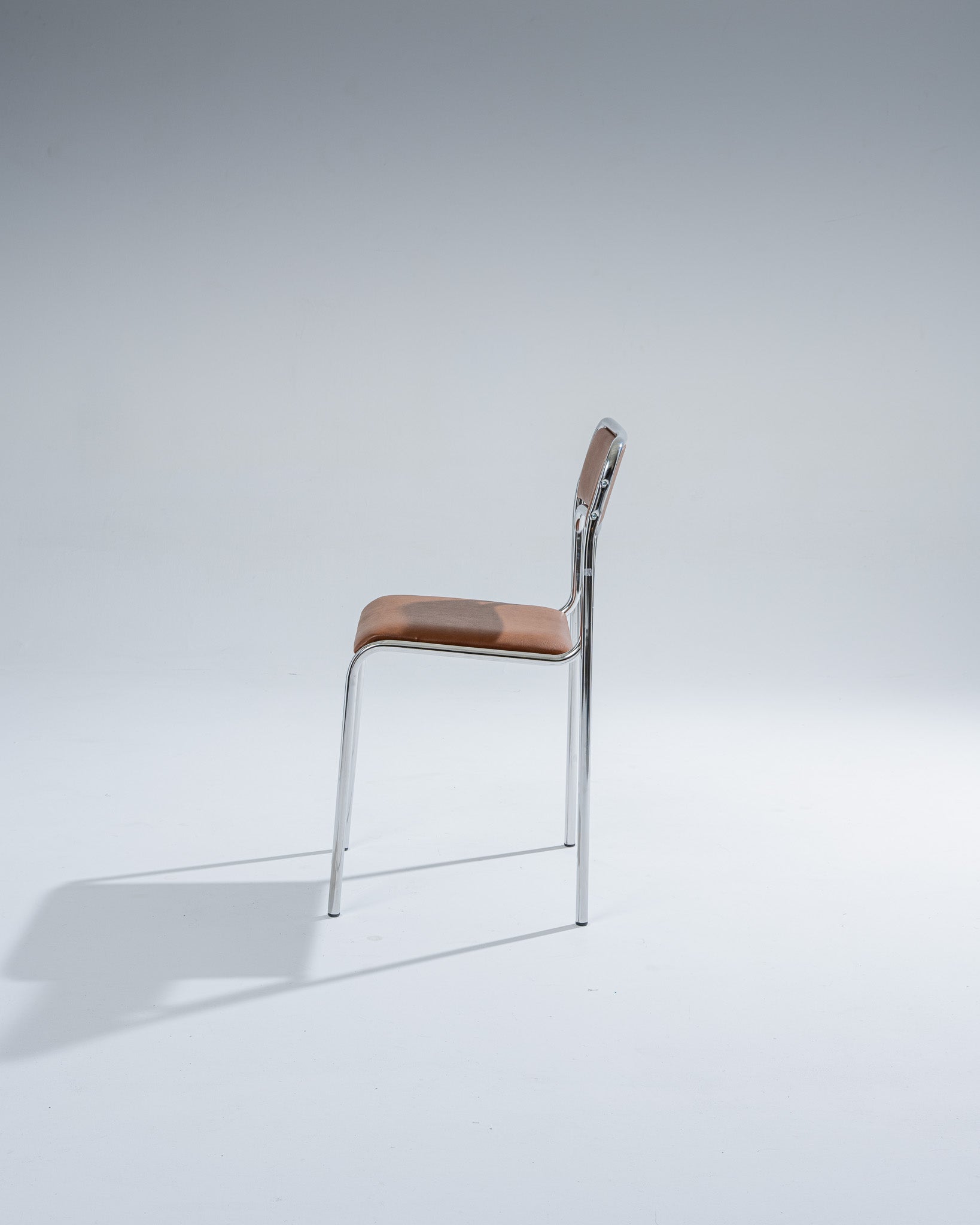 Pair of tubular chrome-plated steel chairs from the 1980s, faithful to the Bauhaus style. With its clean and functional design, it reflects the principles of simplicity and rationality of the movement, combining a metal frame with a light brown leather seat and backrest. In excellent condition.