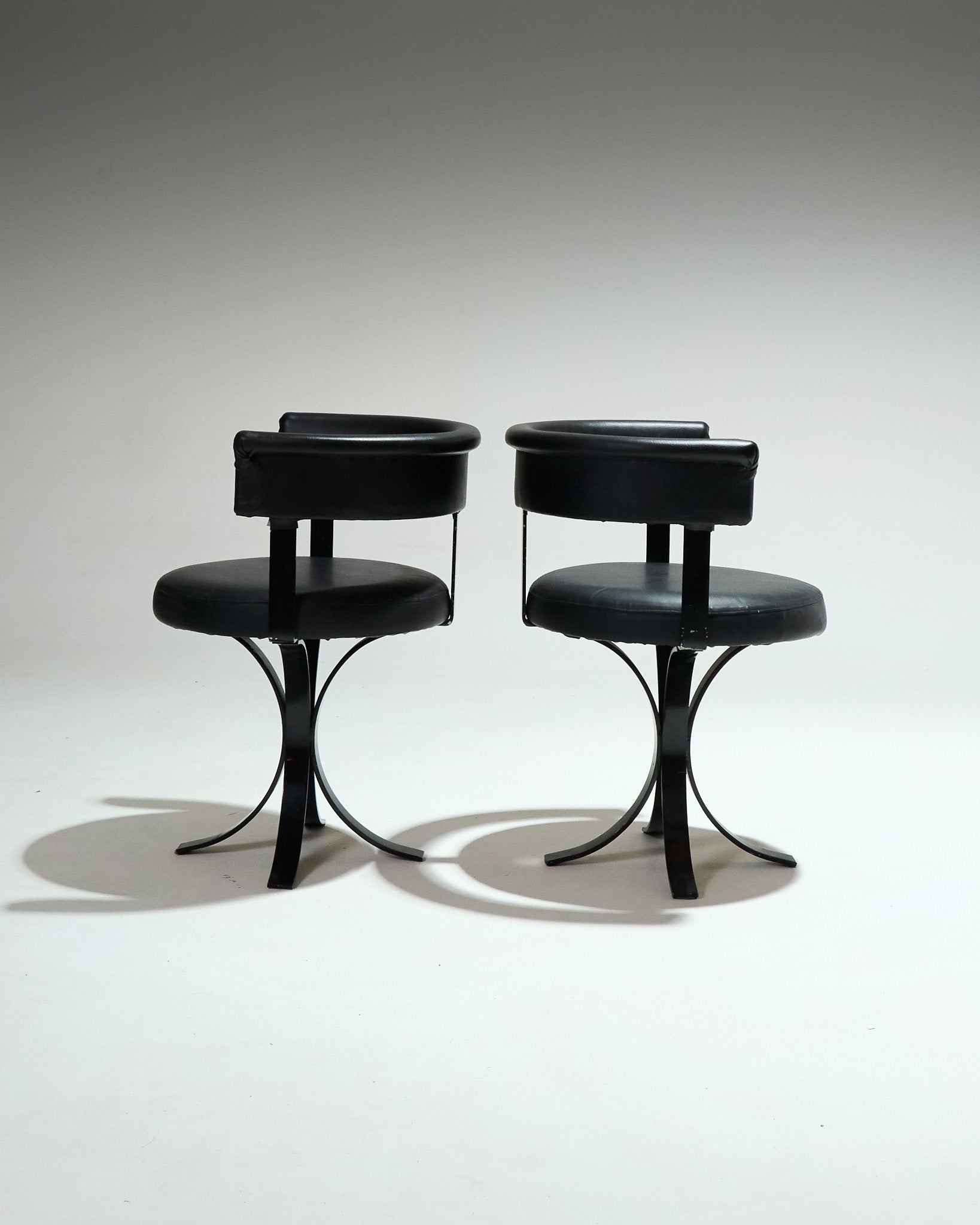 Pair of chairs by Italian designer Osvaldo Borsani, dating from the 1970s. Black lacquered metal frame with tensioned black leather seat and backrest. The cross-shaped base is typical of certain later productions associated with Tecno.