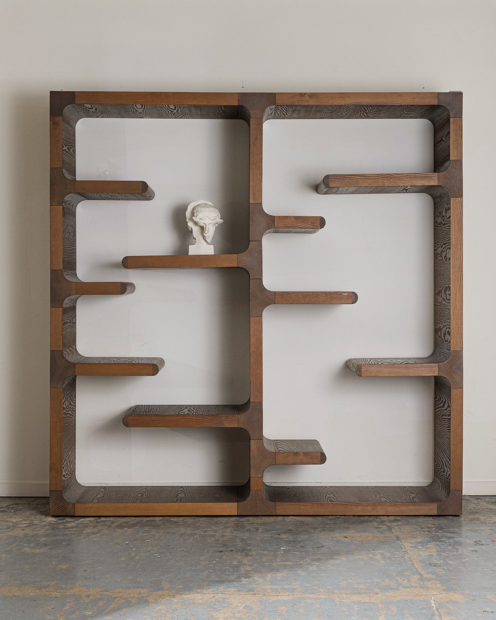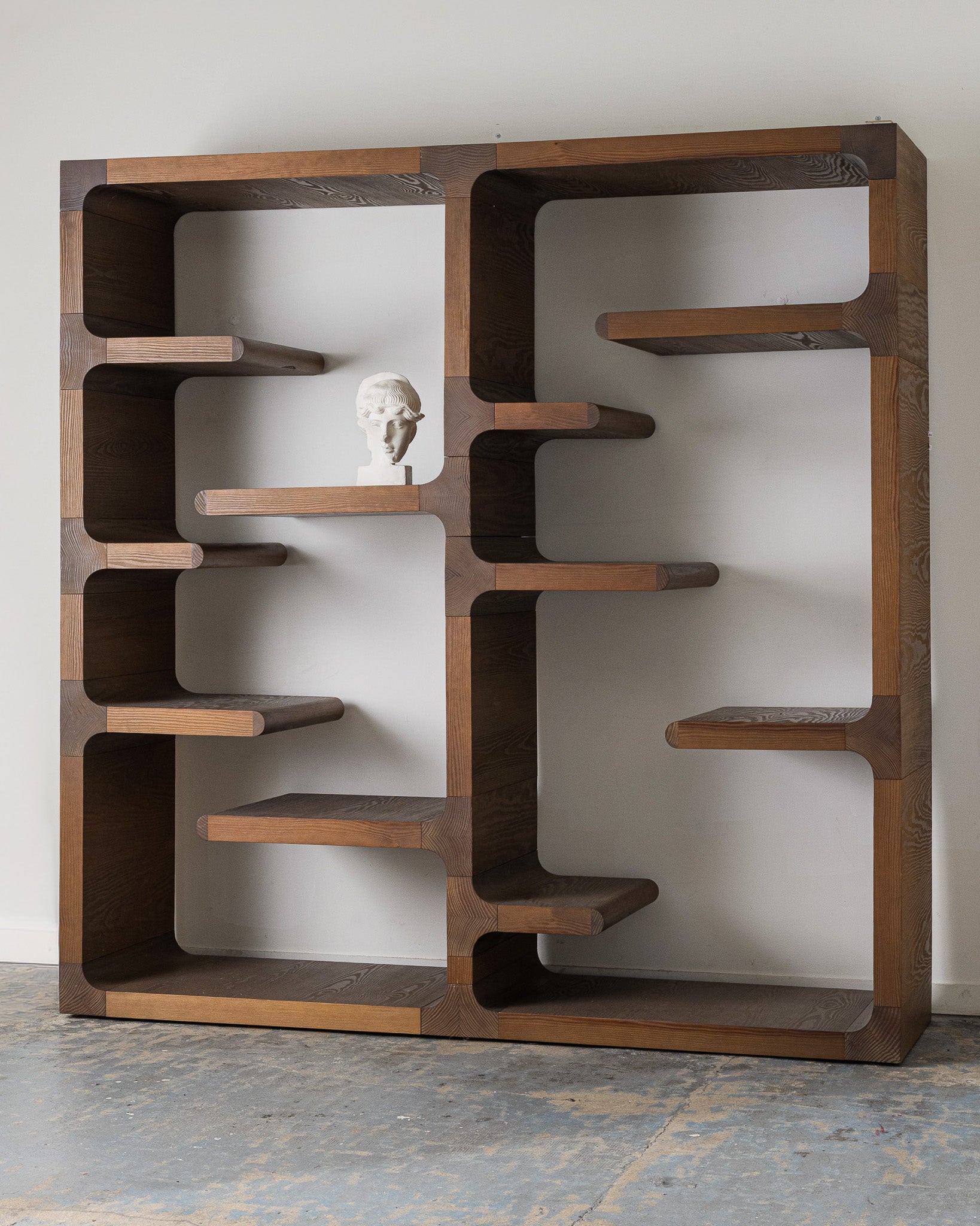 "Pen" bookshelf by Christophe Delcourt. Elegant grey-stained oak structure featuring multiple shelves with rounded lines.