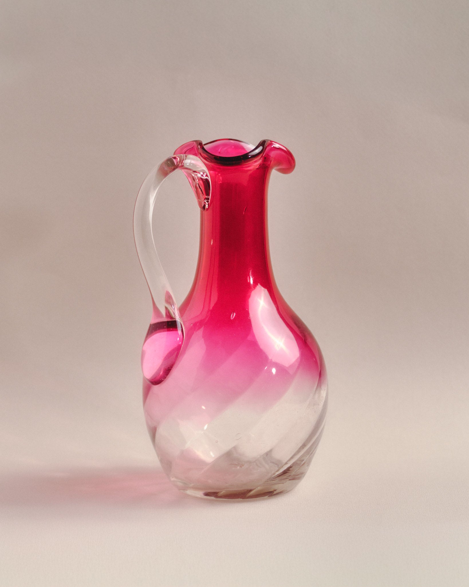Pink-tinted blown glass pitcher, made in the 1970s. The body features regular faceting on the lower part, giving the material geometric reflections. Perfect condition.