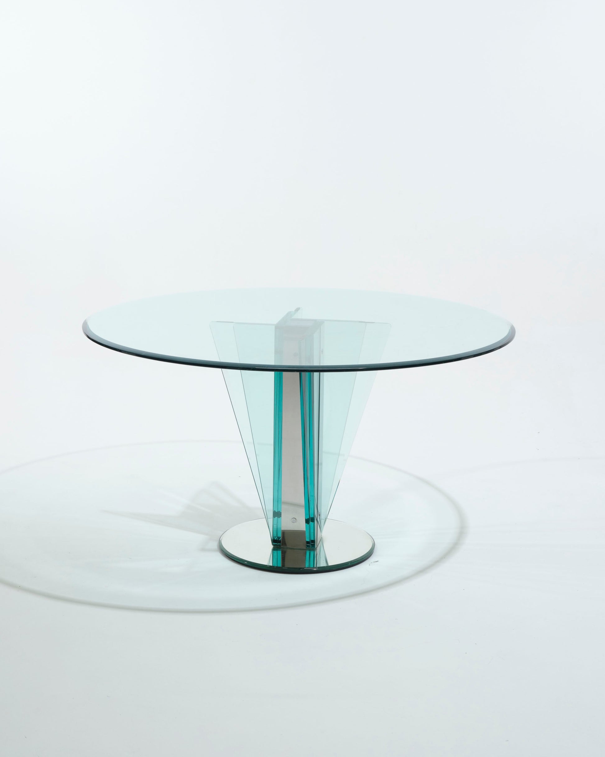 Round glass table by Pietro Chiesa for Fontana Arte, 1970s, Italy. The table features a thick glass top resting on a sculptural base adorned with mirrored glass, also present on the foot. Good condition, with a few light scratches on the top and a small chip on the edge.