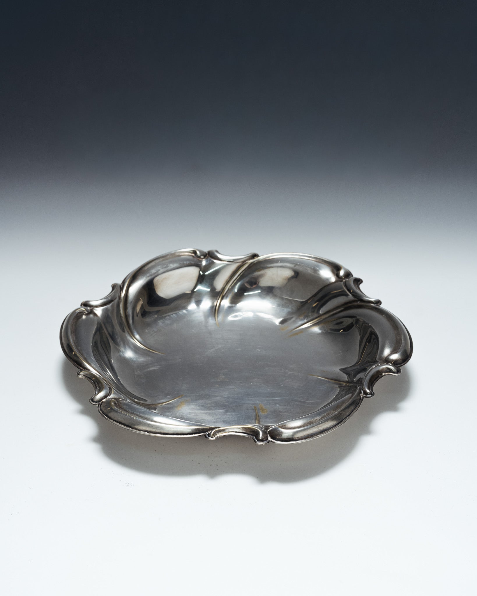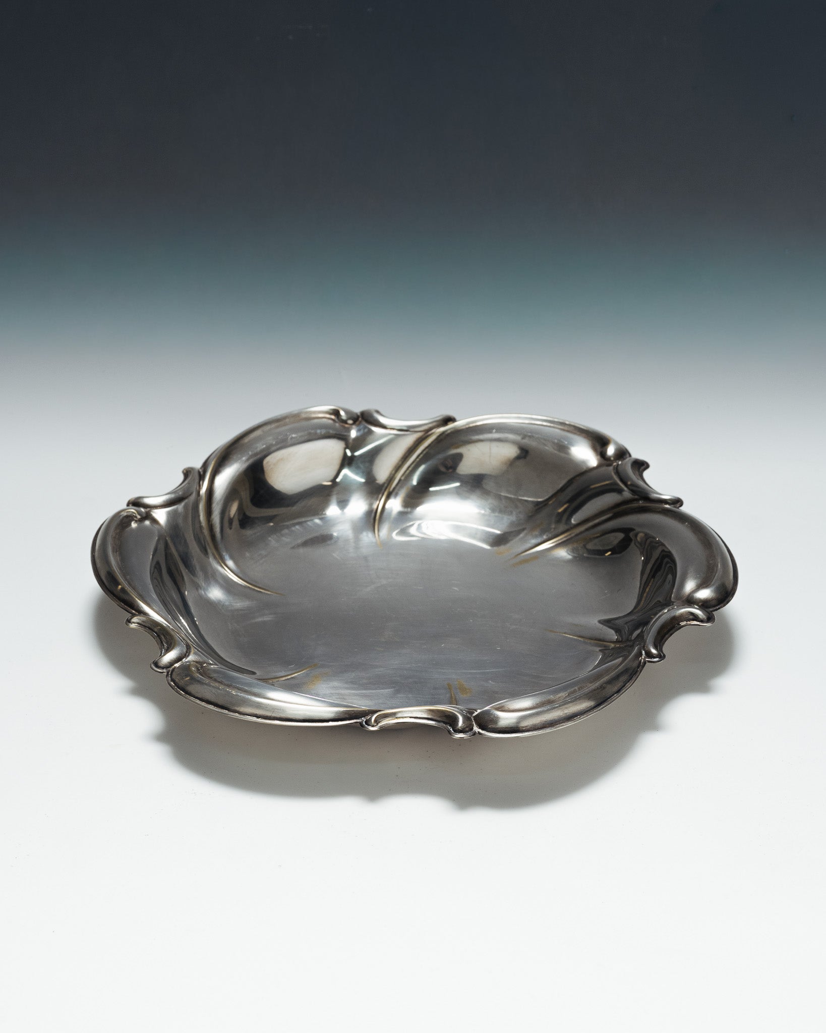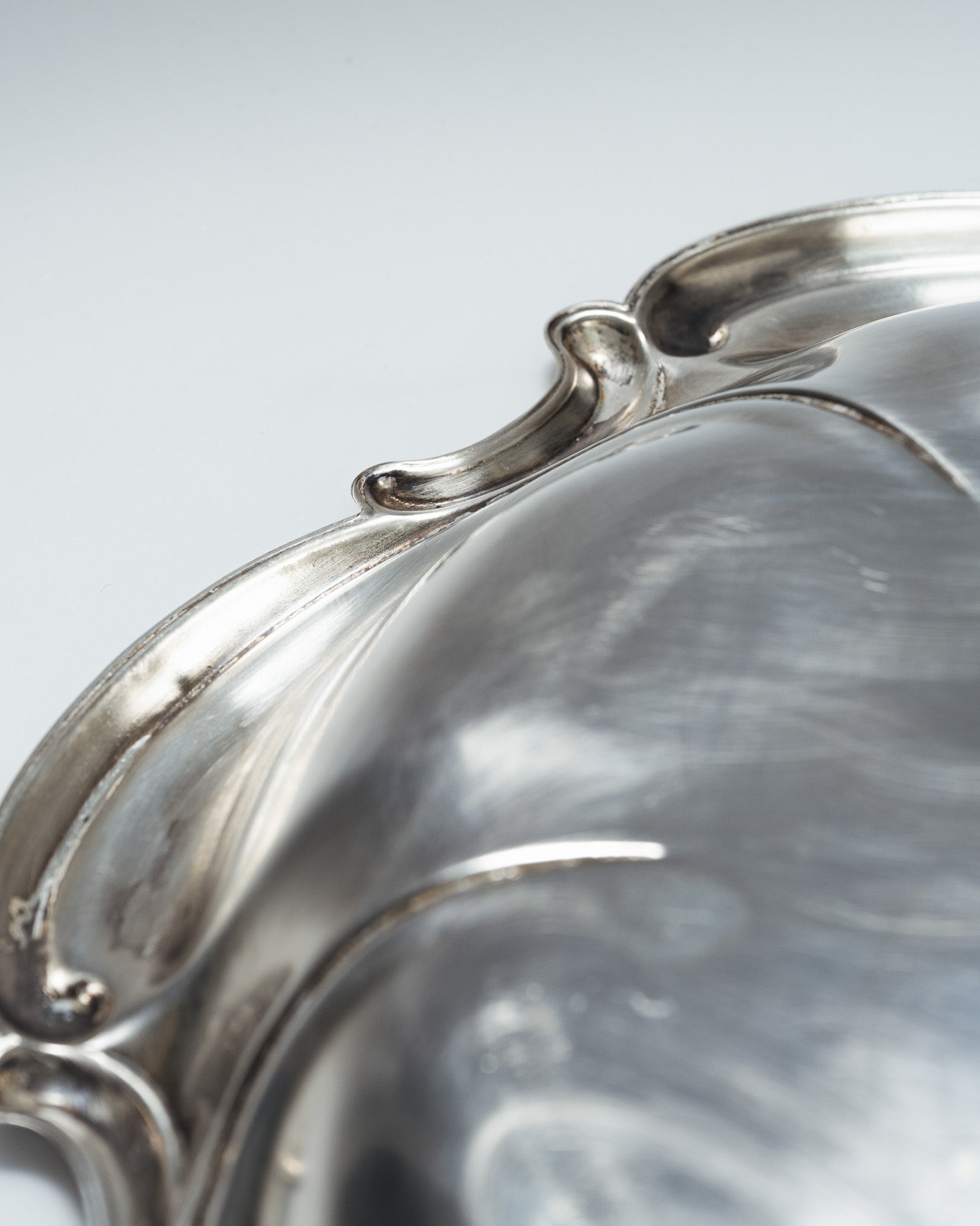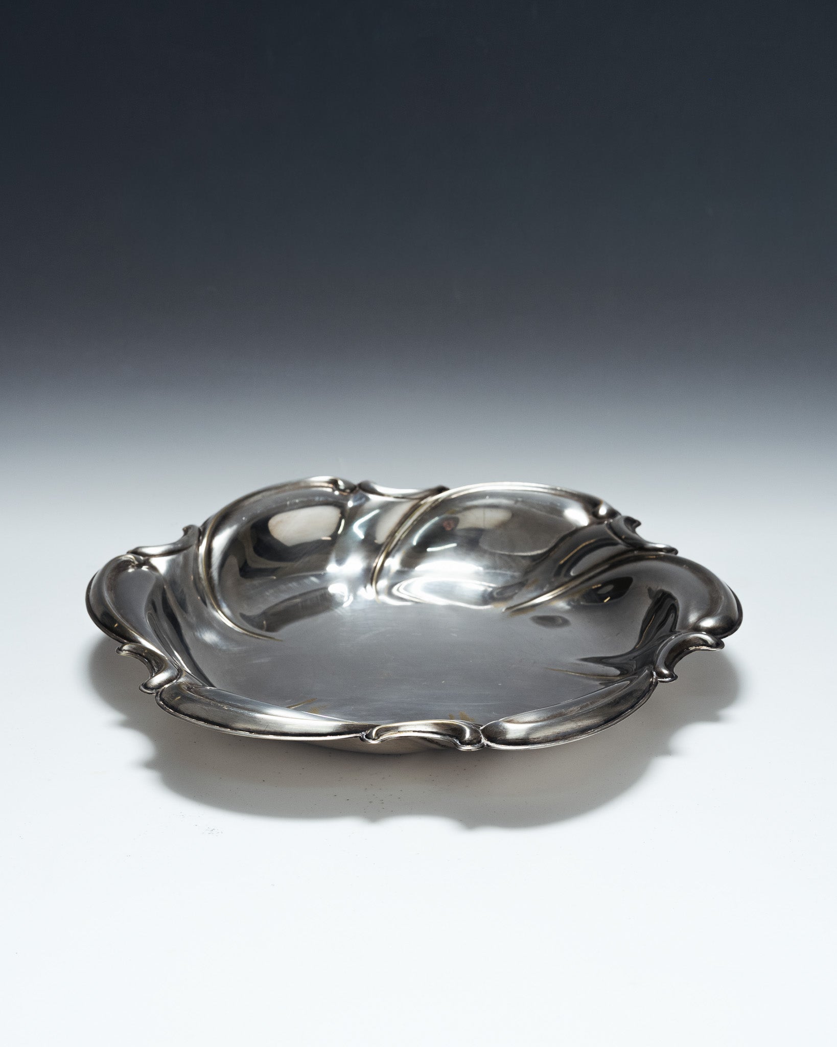 A silver-plated metal dish with a dynamic, free-flowing, organic design. Its asymmetrical shape, enlivened by scrolls and reliefs, evokes a naturalistic aesthetic akin to Art Nouveau. Early 20th-century work.