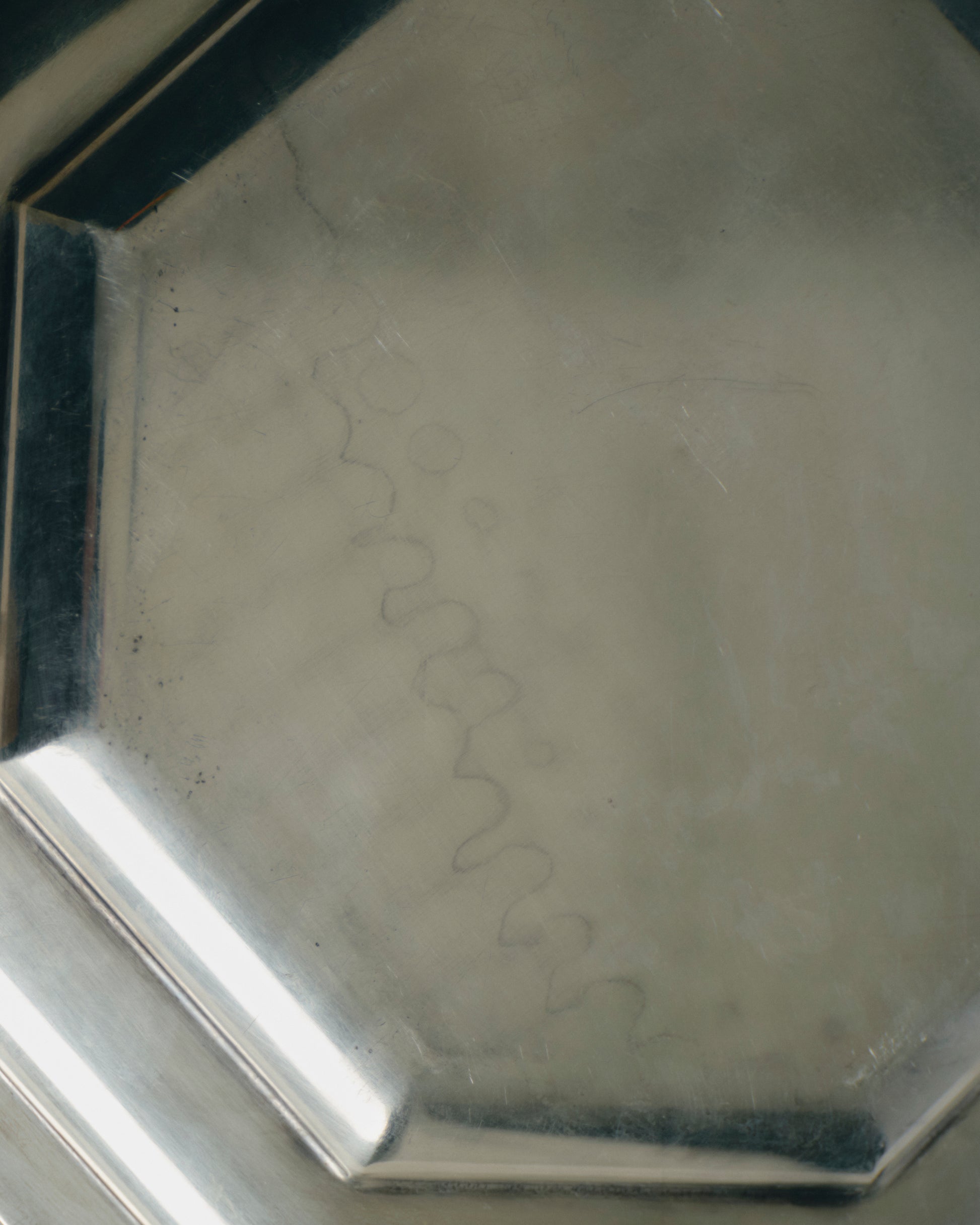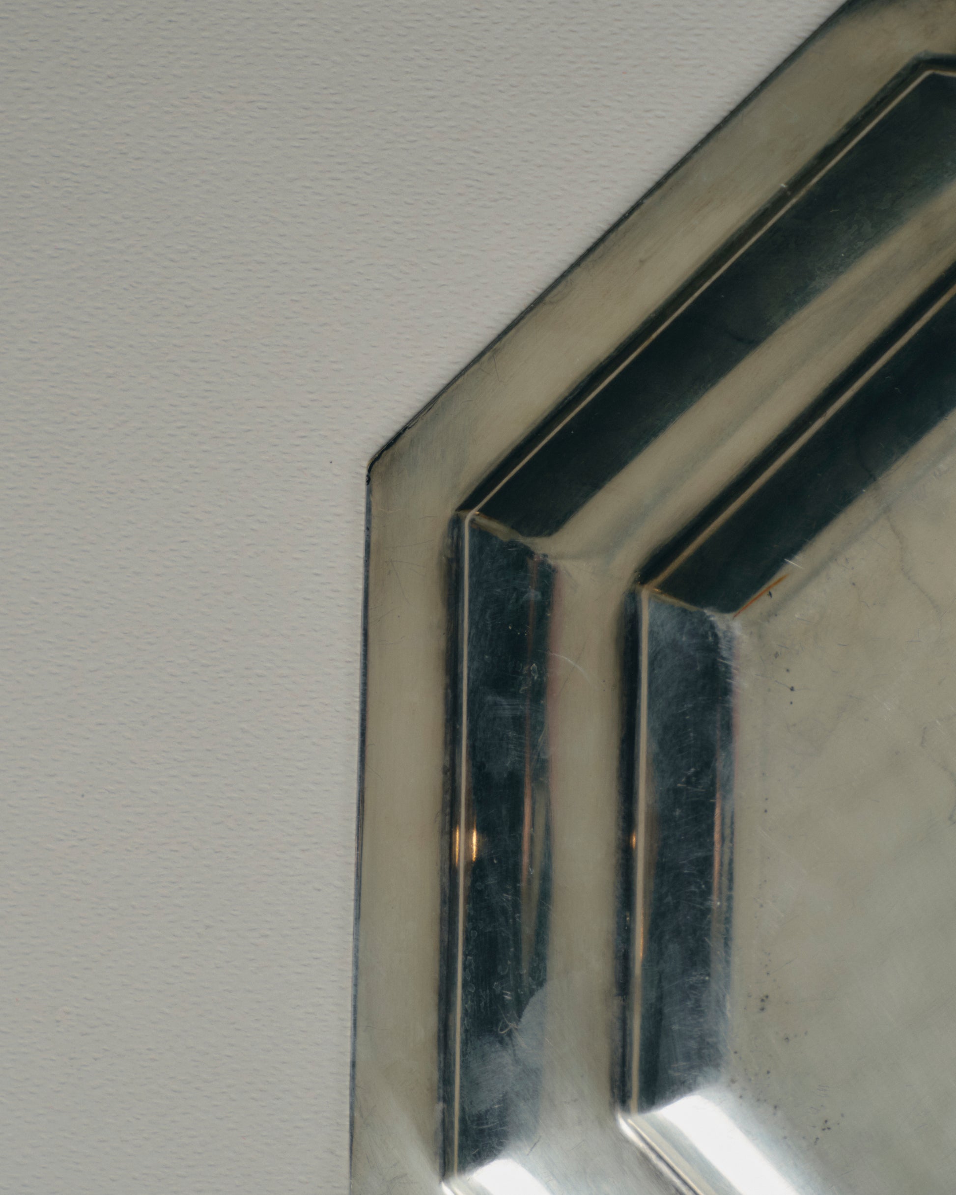 Octagonal silver-plated platter from the 1950s. European craftsmanship. Geometric shape with a double tier, typical of post-war tableware. Can be used as a serving platter, a trinket dish, or a decorative tray on a coffee table or sideboard.