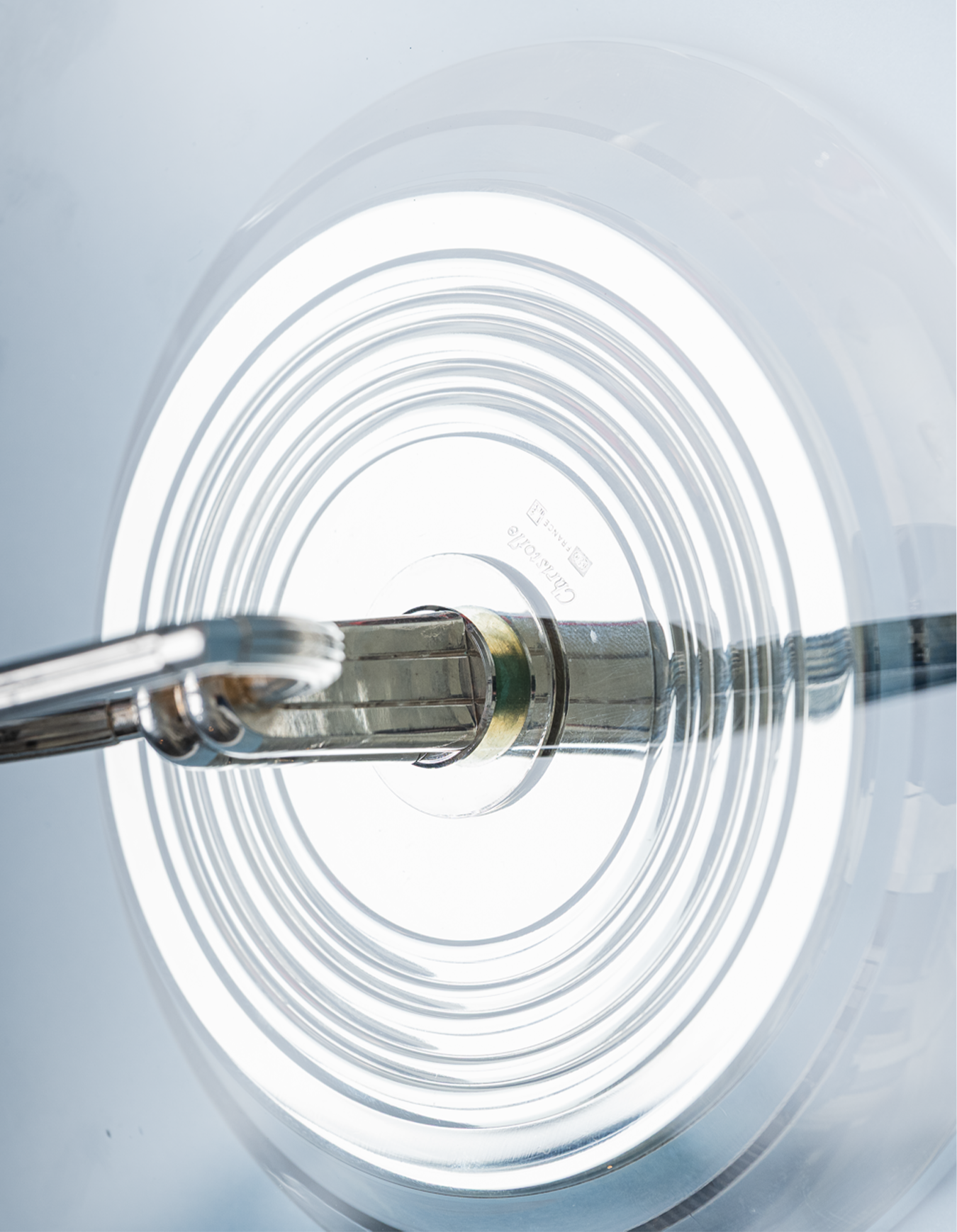 Christofle cheese board, Vibrations model. Silver-plated metal frame with removable glass tray. Christofle hallmark under the base.