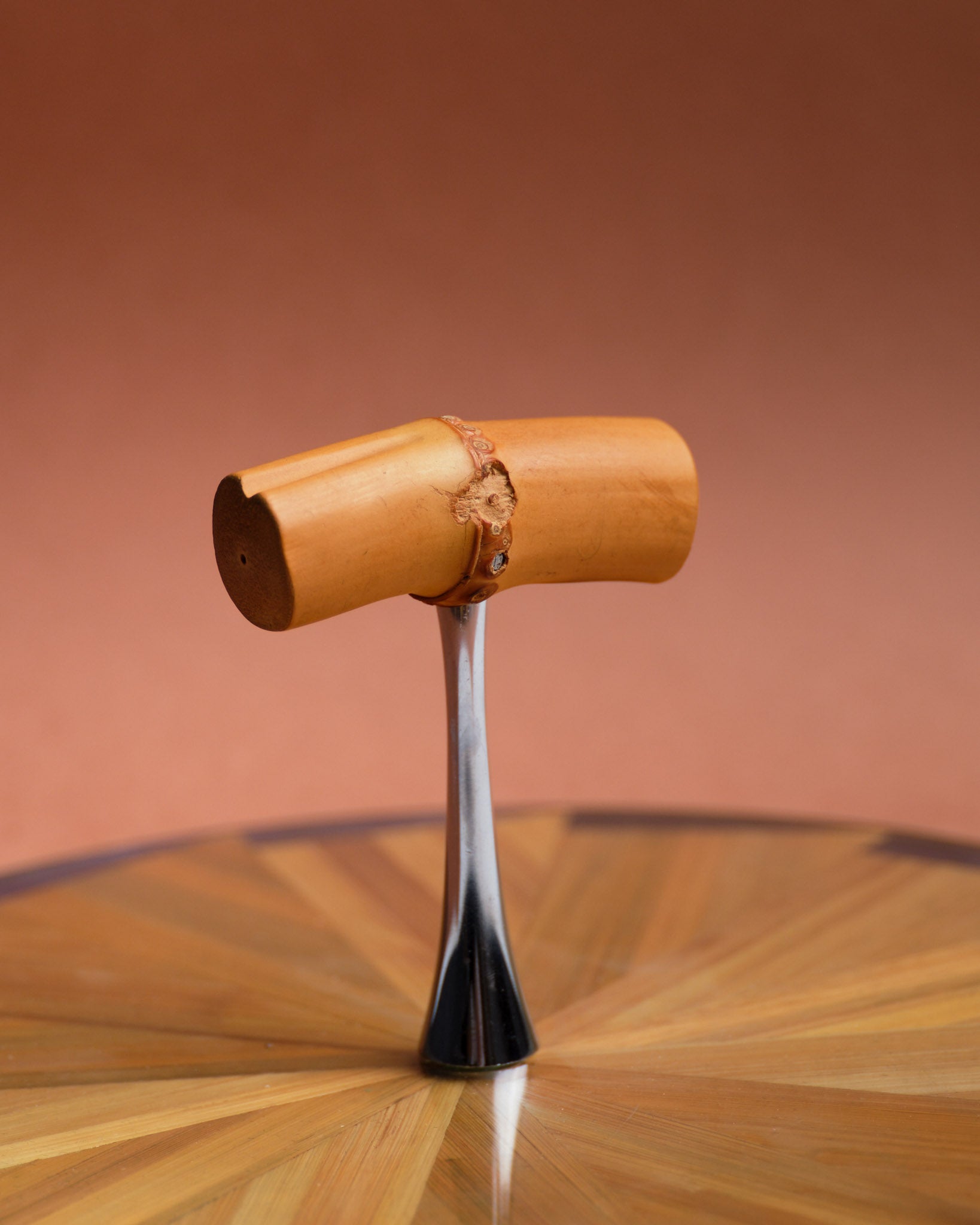 Straw marquetry cheese board, made in the 1970s. Handcrafted with a radiating geometric pattern, alternating shades of gold and brown straw. Removable circular glass top. Central base in chromed metal and wood. Rotating tray. Good condition.