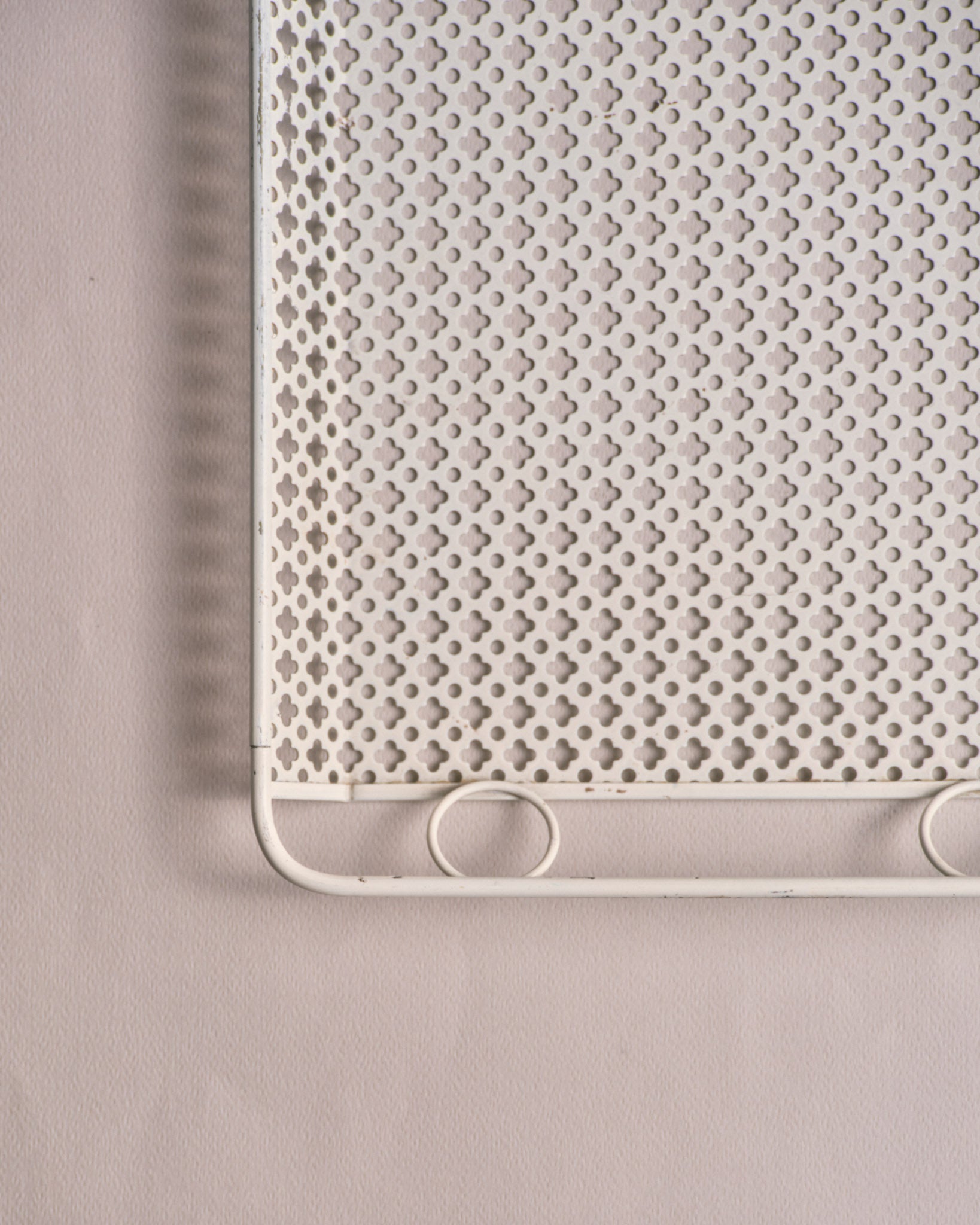 Rectangular white lacquered metal tray with an openwork design of small clover motifs, bordered by a tubular frame and circular handles. A work by Mathieu Matégot, an emblematic figure of French design in the 1950s. In good vintage condition.