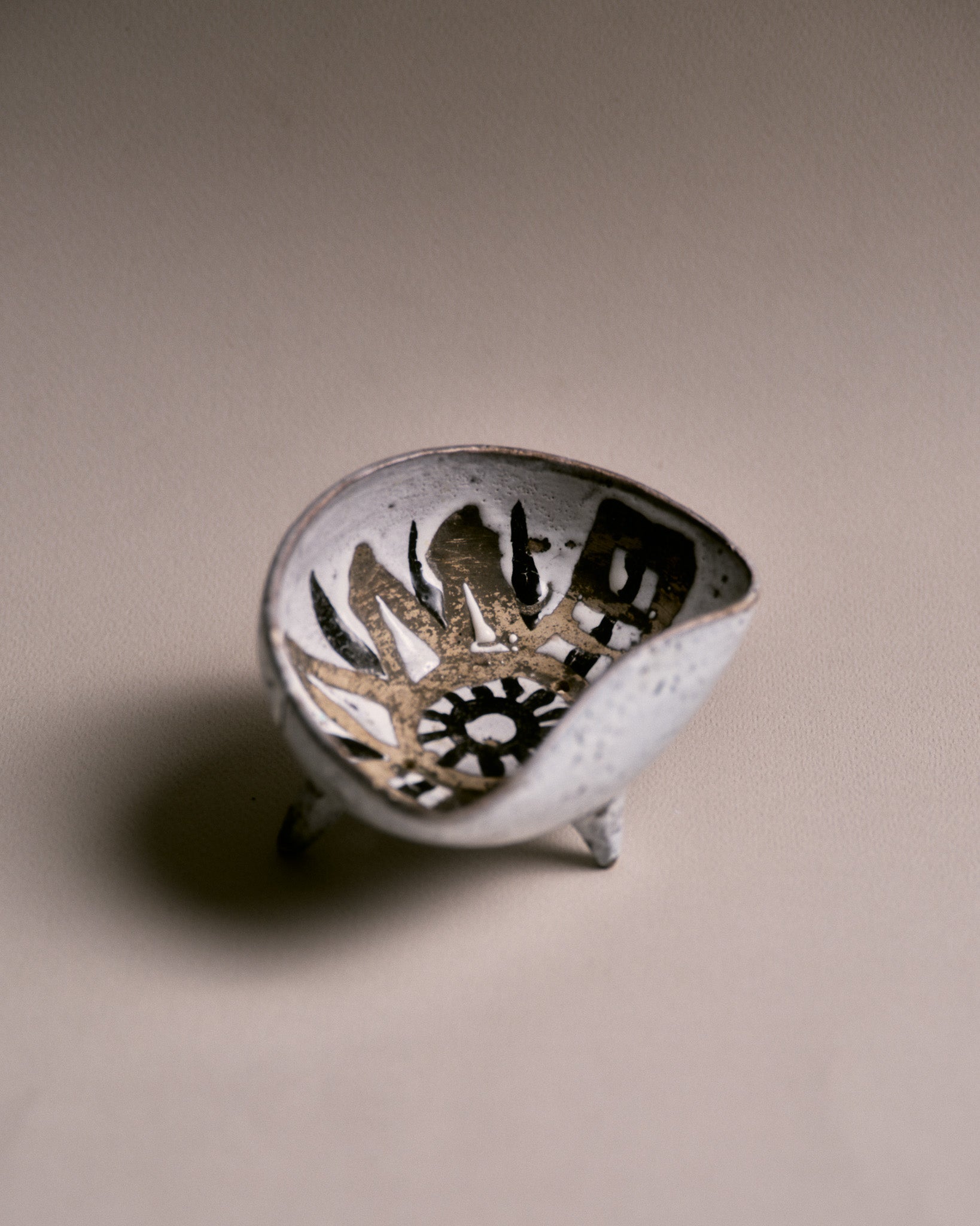 Soap dish by ceramicist Roger Capron. Tripod bowl with one upturned rim. Textured black and white decoration on the exterior, radiating onto the interior, and a play of colors on the unglazed areas. Typical of the artist's work from the 1960s.