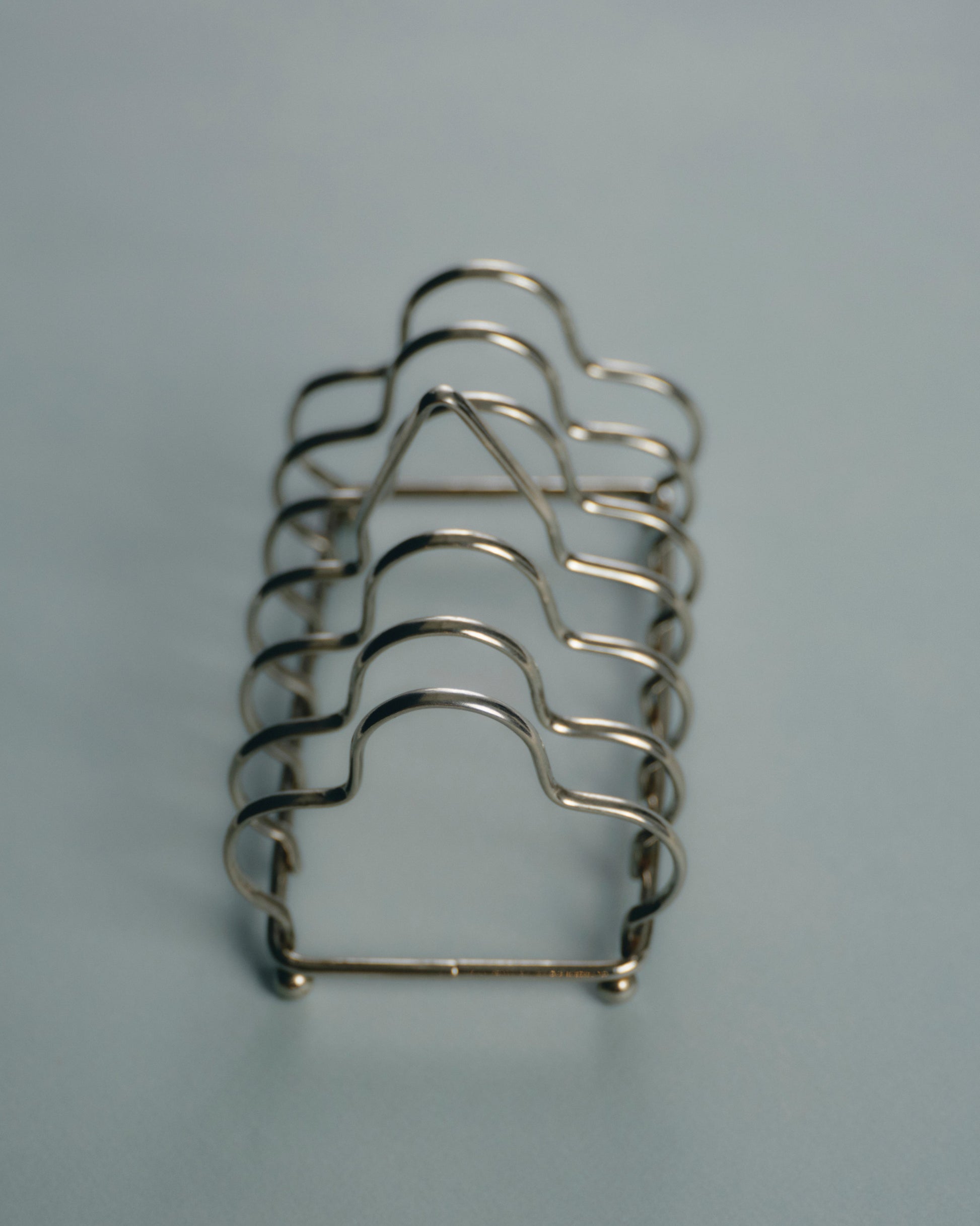 Silver-plated metal toast rack with a wavy wire structure forming five compartments. Good overall condition, light patina consistent with use.
