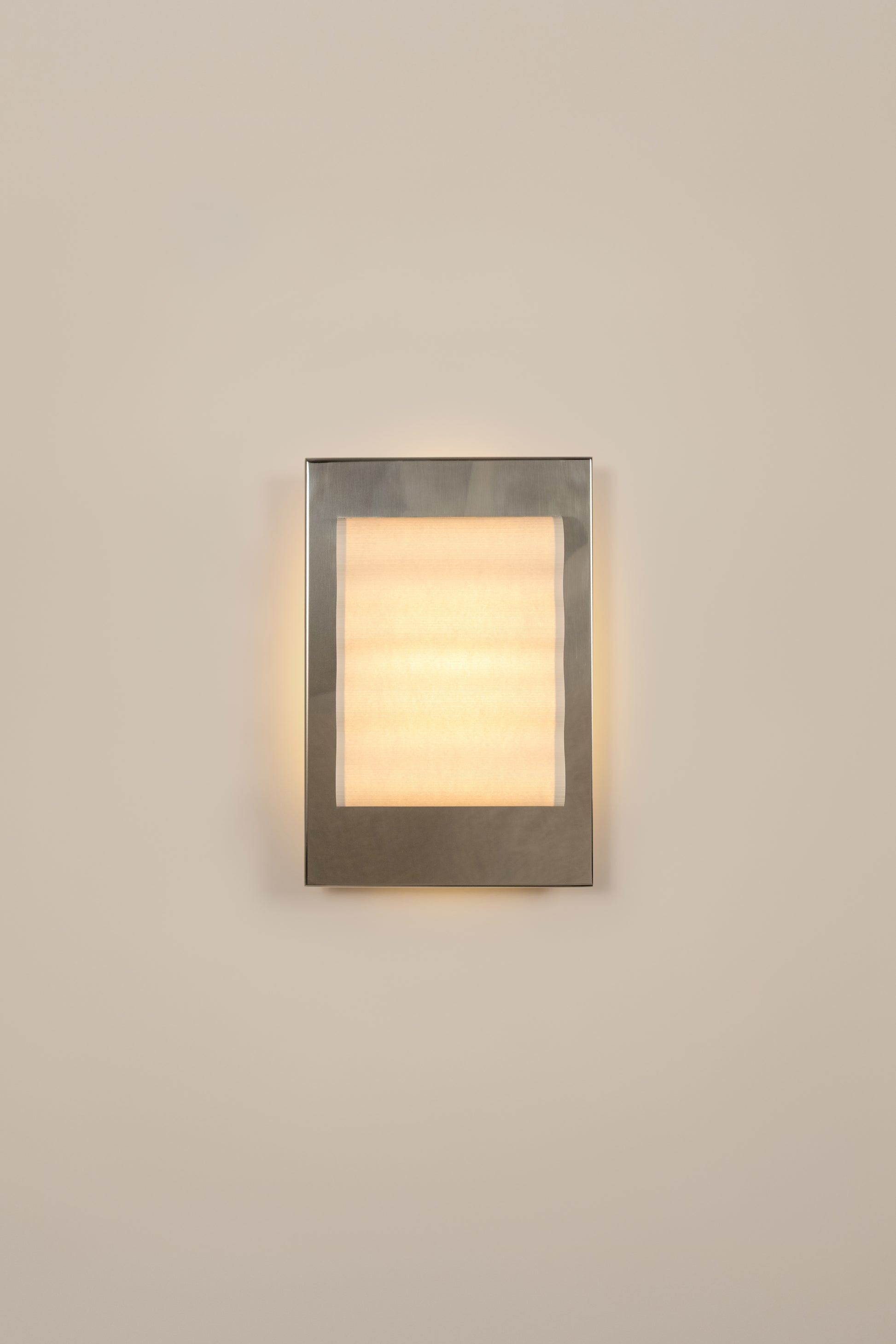 WALL LIGHT IN ALUMINUM AND PAPER, HANDMADE IN PORTUGAL. TEXTILE CORD WITH SWITCH AVAILABLE ON REQUEST FOR CONNECTION TO A FLOOR OUTLET.