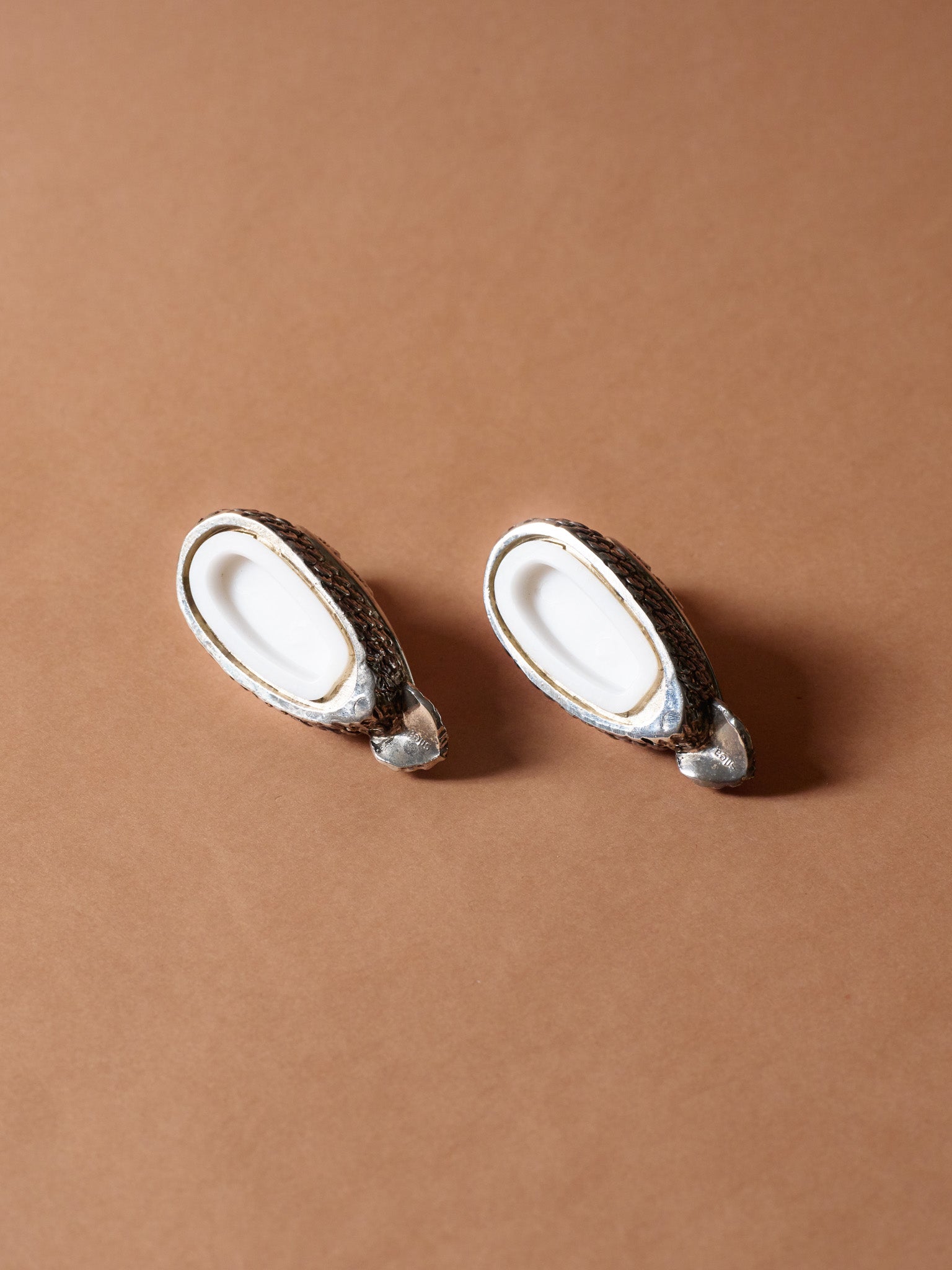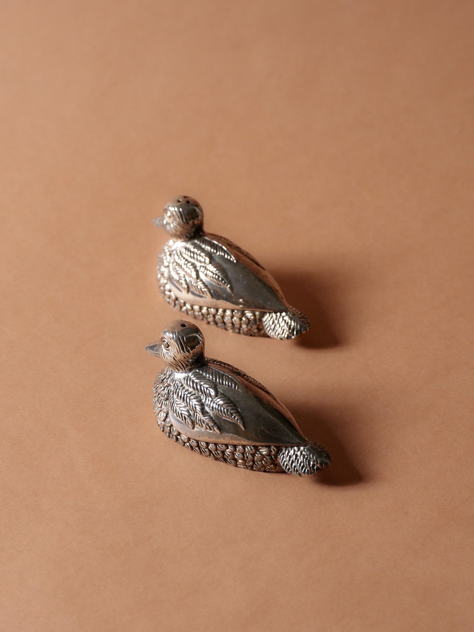 A set of salt and pepper shakers shaped like little ducks, made of silver-plated metal. Excellent condition. Patina consistent with age and use.