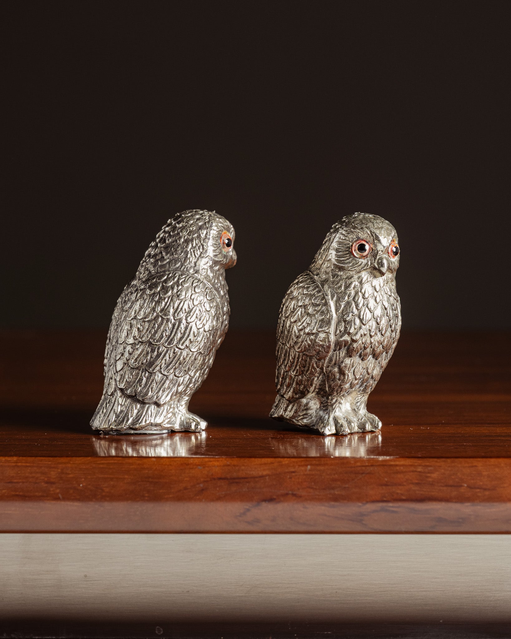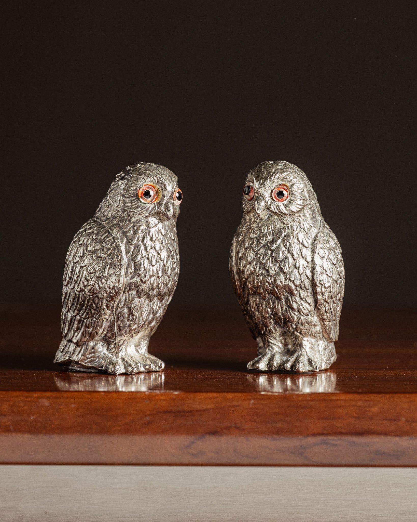 Pair of silver-plated salt and pepper shakers in the shape of owls. The eyes are made of orange glass. In the aesthetic of the 1950s. Good overall condition with a use patina consistent with age.