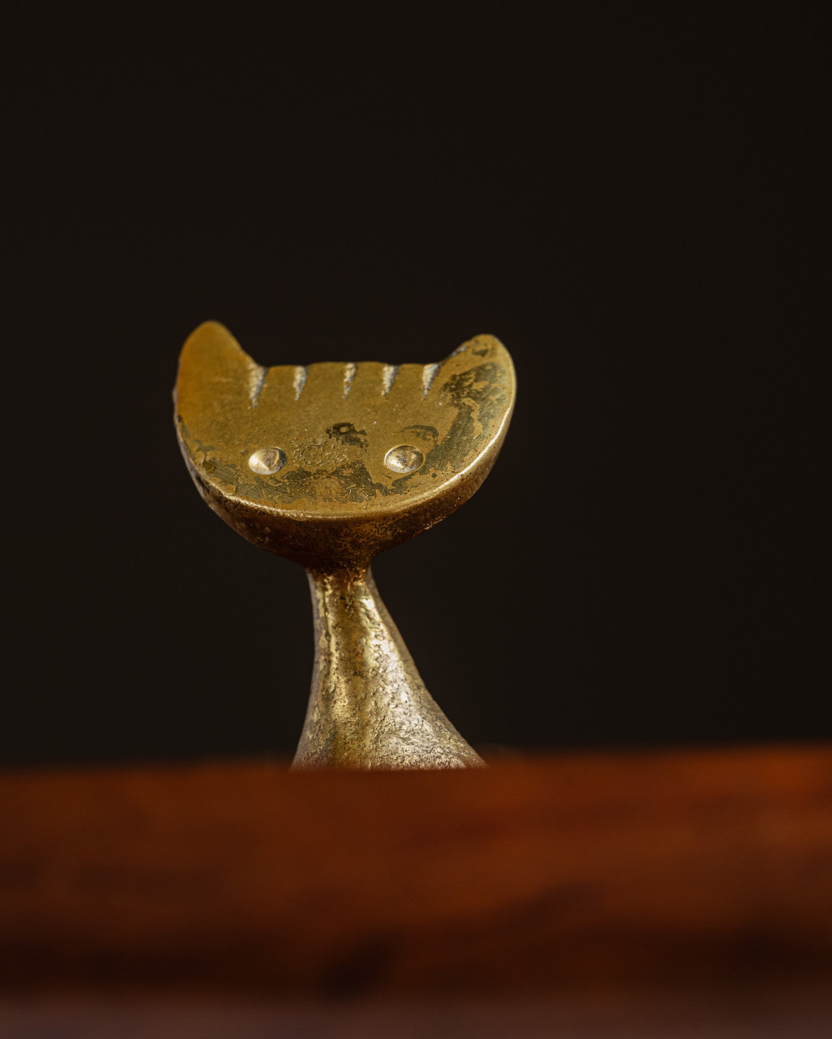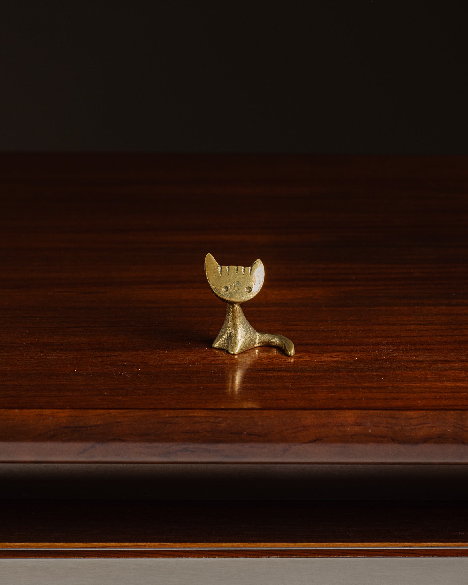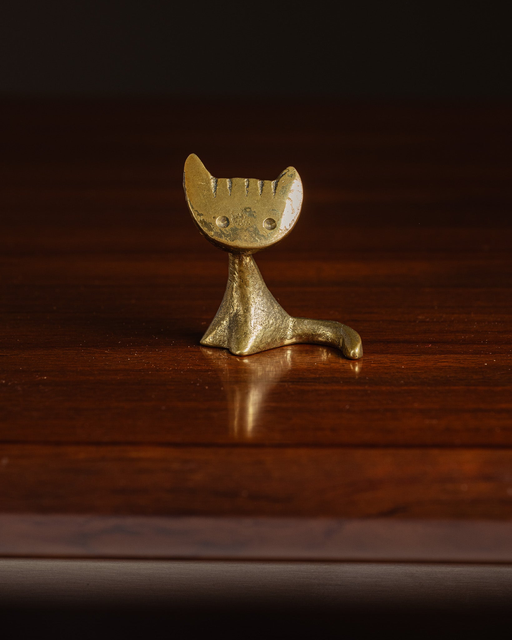 Golden metal cat sculpture, by Walter Bosse, 1950s. Sitting form, flat head with pointed ears, embossed eyes and engraved features. Simple body with flared base and tail elongated to the side.