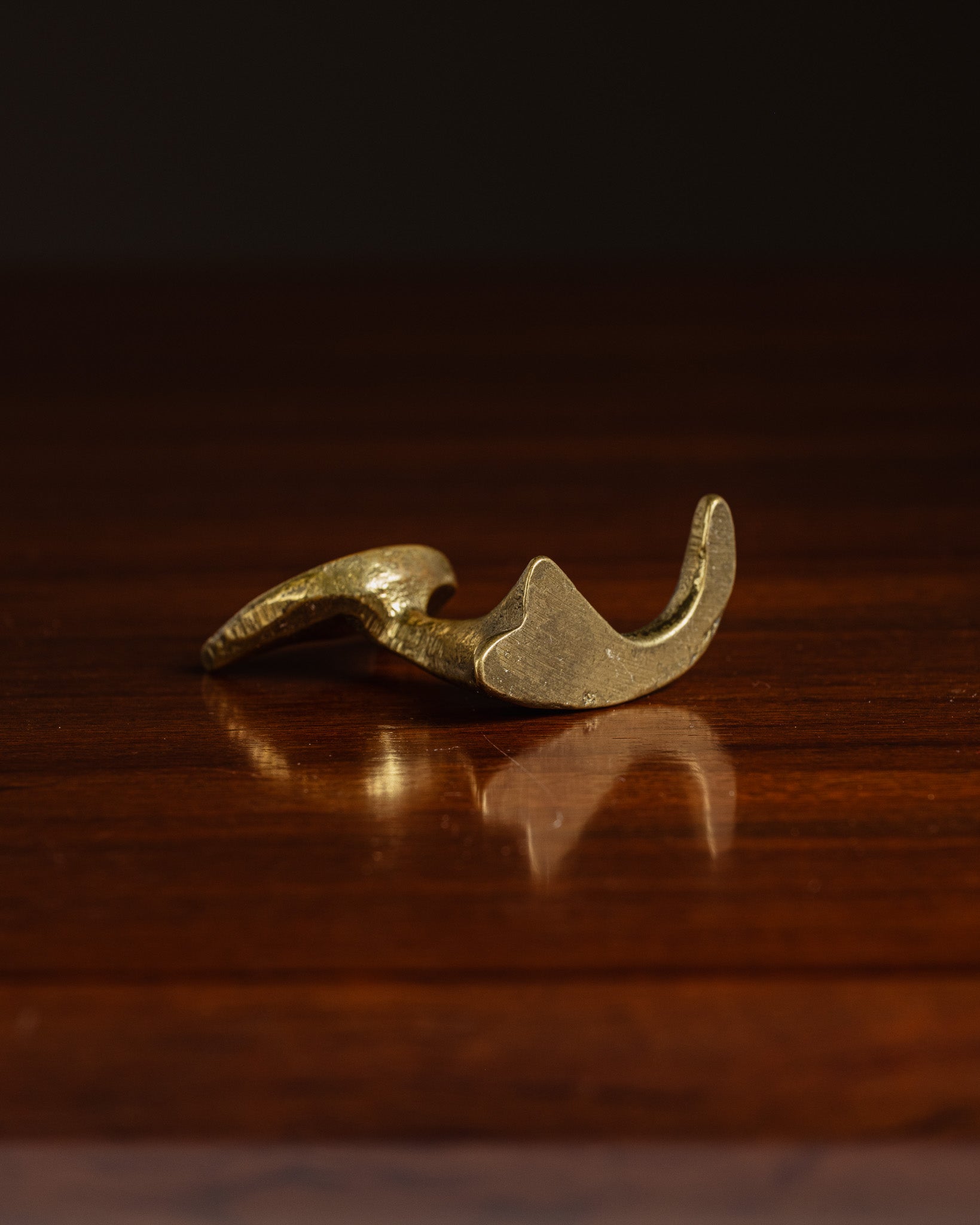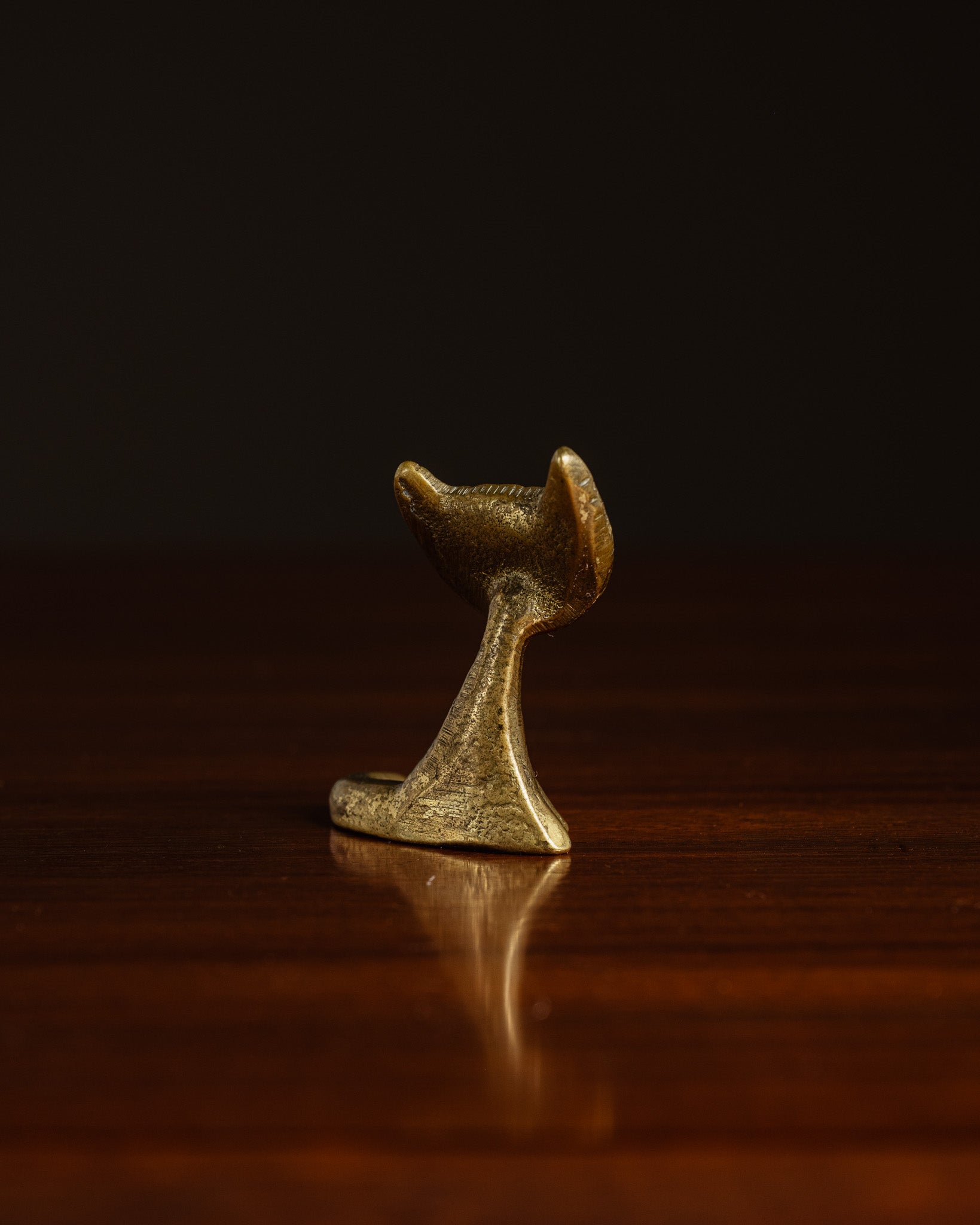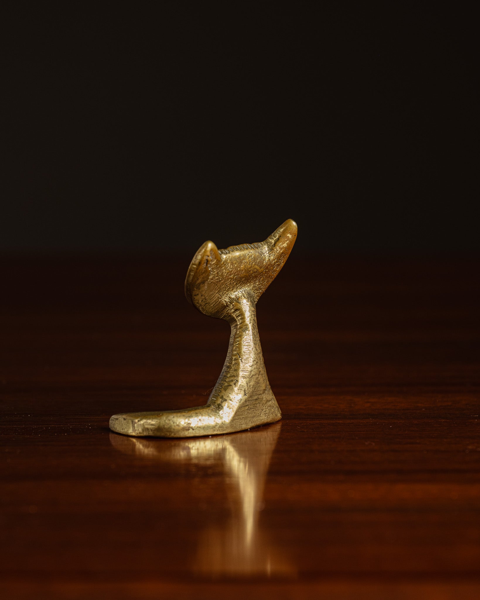 Golden metal cat sculpture, by Walter Bosse, 1950s. Sitting form, flat head with pointed ears, embossed eyes and engraved features. Simple body with flared base and tail elongated to the side.
