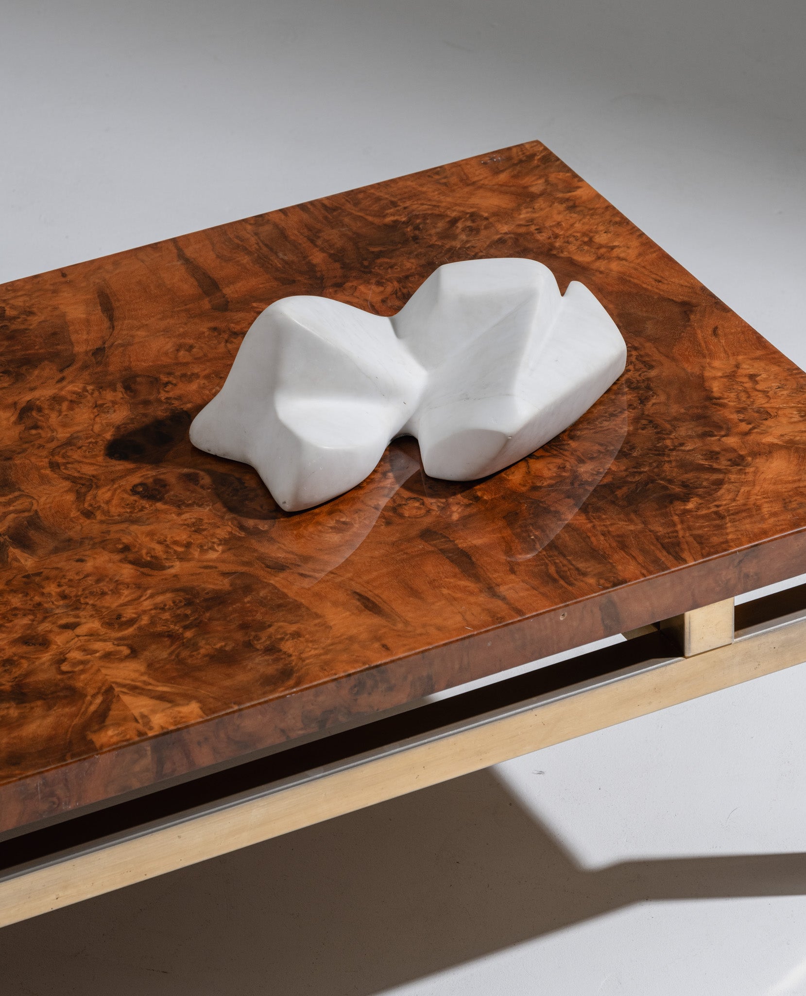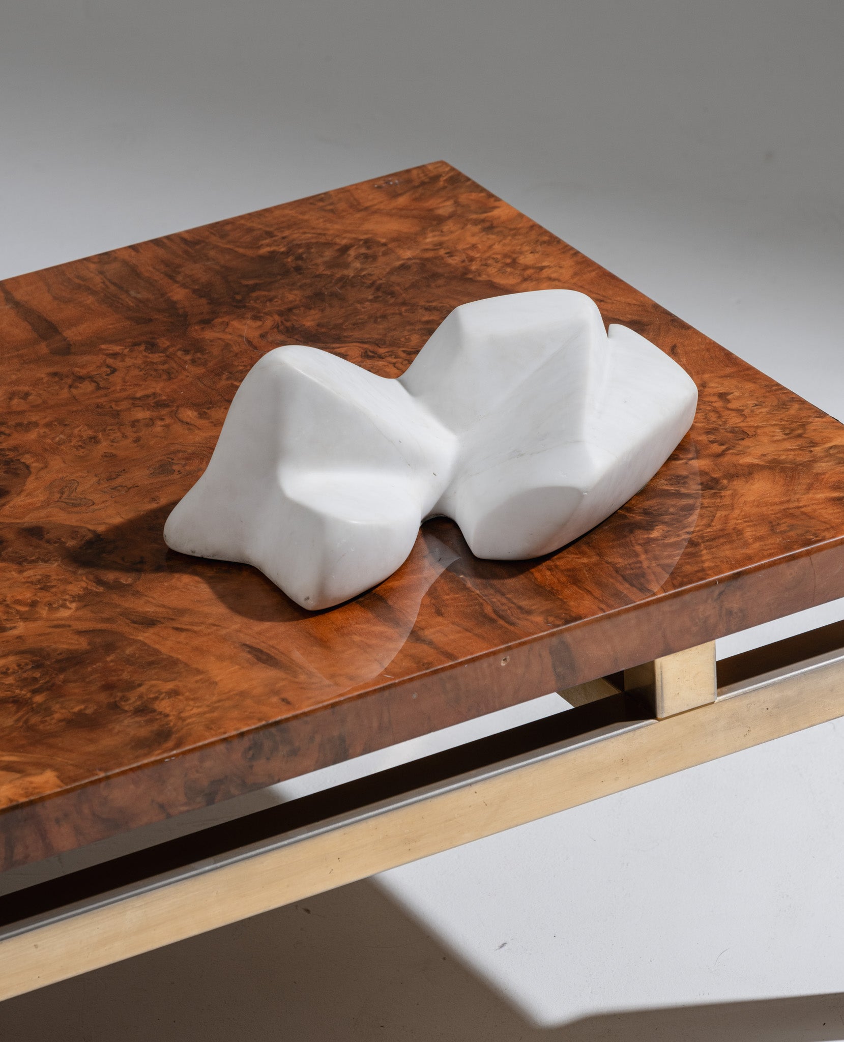 The piece, with its sculptural and angular lines, explores abstraction through dynamic volumes, playing with light and shadows.