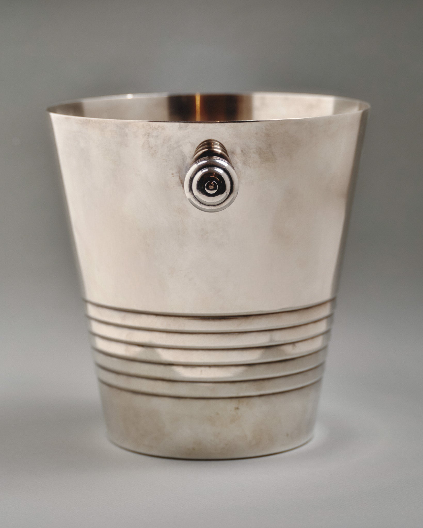 Silver-plated metal champagne bucket from the 1960s. Cylindrical body with horizontal fluting. Good condition, patina and marks consistent with age and use.